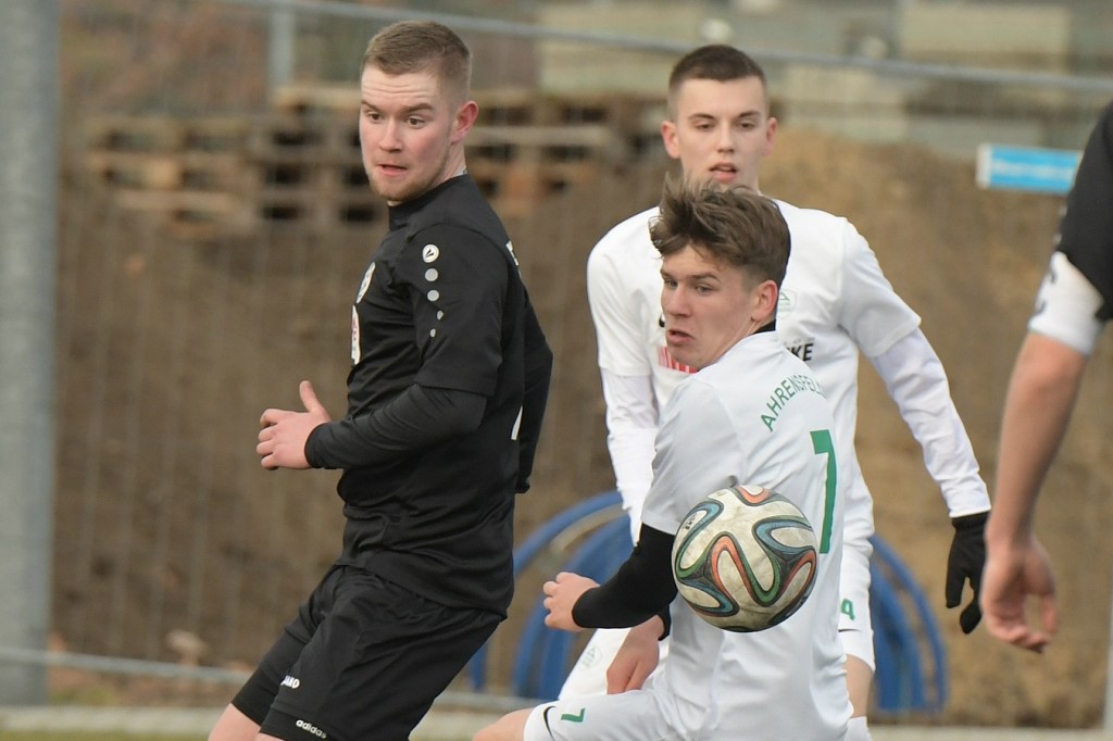 Grün-Weiss Ahrensfelde war vor dem Achtelfinale der letzte verbliebene Kreisligist und auch Barnim-Vertreter im Wettbewerb. Und dies blieb auch nach der Begegnung so, und das im Gesamten gesehen, verdient. Damit hat die Truppe von Marco Fiedler, nach dem in den Runden zuvor drei Landesklassenvertreter die Segel streichen mussten, nun auch einen Brandenburgligisten aus dem Lostopf geholt und sich darin selbst unter die letzten Acht eingetütet. Die Begegnung kam schwer in die Gänge, in der Babelsberg schon anzeigte, dass in deren Liga qualitativ hochwertigerer Fußball gespielt wird. Ahrensfelde wirkte nervös, verlor die Bälle oft im Vorwärtsgang, kam aber trotzdem zu Chancen, die eine Führung hätten bringen können. Zunächst führten aber die Gäste durch einen berechtigten Foulelfmeter, den Moritz Walter in der 10. Minute versenkte. Grün-Weiss legte in der Folge immer mehr den Respekt ab, wehrte sich und kam nach einem Eckball zum Ausgleich. Erst prüfte Nils Schreiber per Kopf den Gästekeeper, der gut reagierte, den Ball aber in die Gefahrenzone abwehrte. Niklas Hvalec stand genau richtig und köpfte vielumjubelt ein (14.). Ahrensfelde hatte nun seine beste Phase und belohnte sich mit der 2:1 Führung durch „Liga-Tormaschine“ William Pranga, der Nutznießer der Balleroberung von Justin-Gill Reisner und per Rückpass in Szene gesetzt wurde (36.). Doch Babelsberg hatte nur zwei Minuten später die Antwort durch Felix Valentin, der nach einem langem Ball, Heimkeeper Tim Eggebrett überlupfte. Praktisch mit dem Halbzeitpfiff erzielte Justin-Gill Reisner nach einer Ecke im zweiten Kopfballversuch die nicht unwichtige Halbzeitführung (45.). Denn im zweiten Durchgang wurde es hektischer. Ein Freistoß für Grün-Weiss, der in der Mauer hängenblieb, hatte Folgen für den weiteren Verlauf der Partie. Der konsequente Schiedsrichter Tim Gerstenberg sah ein strafbares Handspiel in der Mauer und entschied folgerichtig auf Strafstoß. Jeremie Springer schoss recht schwach, Gästetorsteher Louis-Maximilian Schönfelder hielt die Kugel und ließ sich im Nachgang zu einer Schiedsrichterbeleidigung hinreißen. Glatt Rot war die Folge und Babelsberg nur noch zu zehnt (51.). Doch damit nicht genug. Sinan Ameti, mit einer frustbehafteten Attacke im Zweikampf, hatte schon Gelb und musste per Ampelkarte als nächster Babelsberger das Feld räumen (59.). Aber auch zu neunt blieben die Gäste gefährlich und kamen zum Ausgleich. Einen der wenigen Konter nutzte Felix Valentin zum, aus Ahrensfelder Sicht, ernüchternen Ausgleich (66.). Grün-Weiss warf in der Folge alles in die Waagschale, zum Teil auch mit der Brechstange, kam aber kaum zu zwingenden Chancen. Doch dem Bemühen folgte der Lohn, den wiederum William Pranga vollkommen frei nach guter Vorarbeit des eingewechselten Florian Marc Krüger zur erneuten Führung einbrachte (81.). Das Tor durch Brian Ohliger in der 93. Minute machte den Erfolg noch klarer, doch mehr als positive Ergebnis-Makulatur war es am Ende dann doch nicht. „Ich bin schon sehr glücklich, dass wir unten den acht besten A-Jugend-Teams in Brandenburg sind. Obwohl mir das Spiel meiner Jungs nicht ganz gefallen hat. Wir haben uns doch etwas mehr vorgenommen. Aber ich war absolut davon überzeugt, dass wir die Partie gewinnen, weil bis dato ein tolles Jahr gespielt haben“, so der sehr bodenständige und immer korrekt auftretende Trainer der Grün-Weissen, Marco Fiedler, nach Spielende.