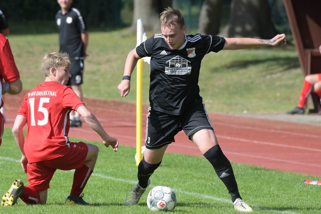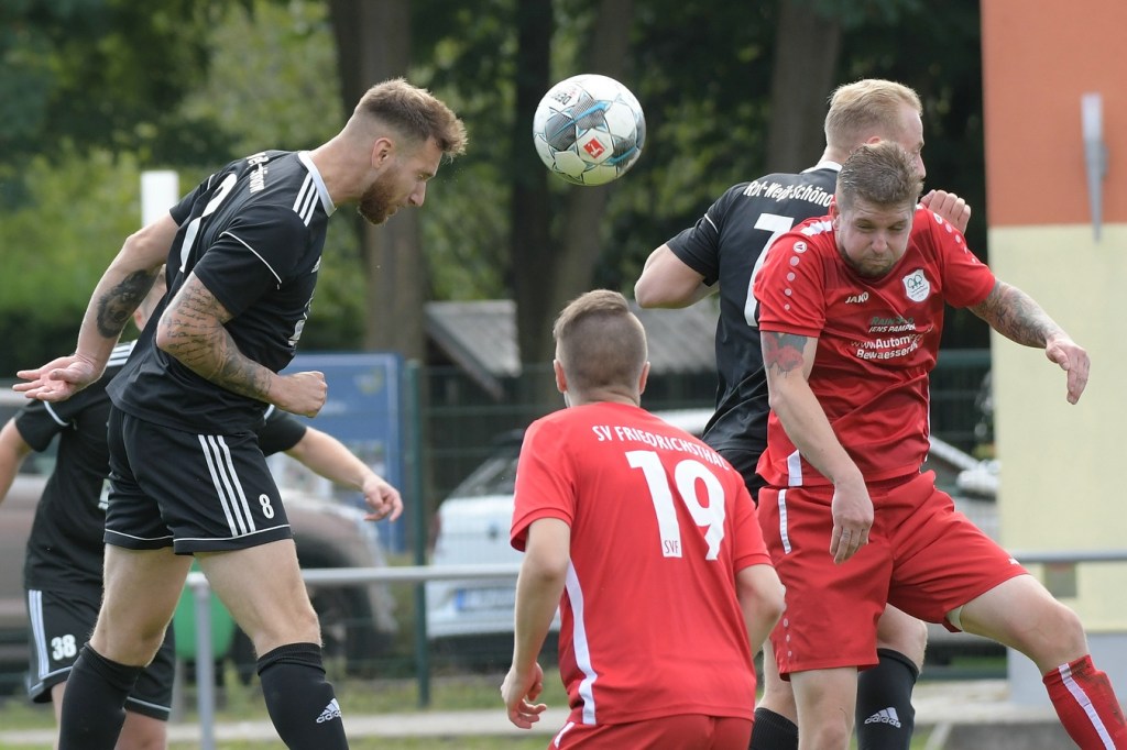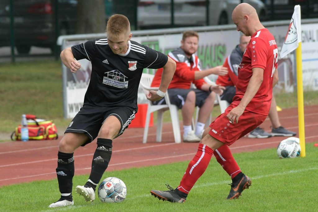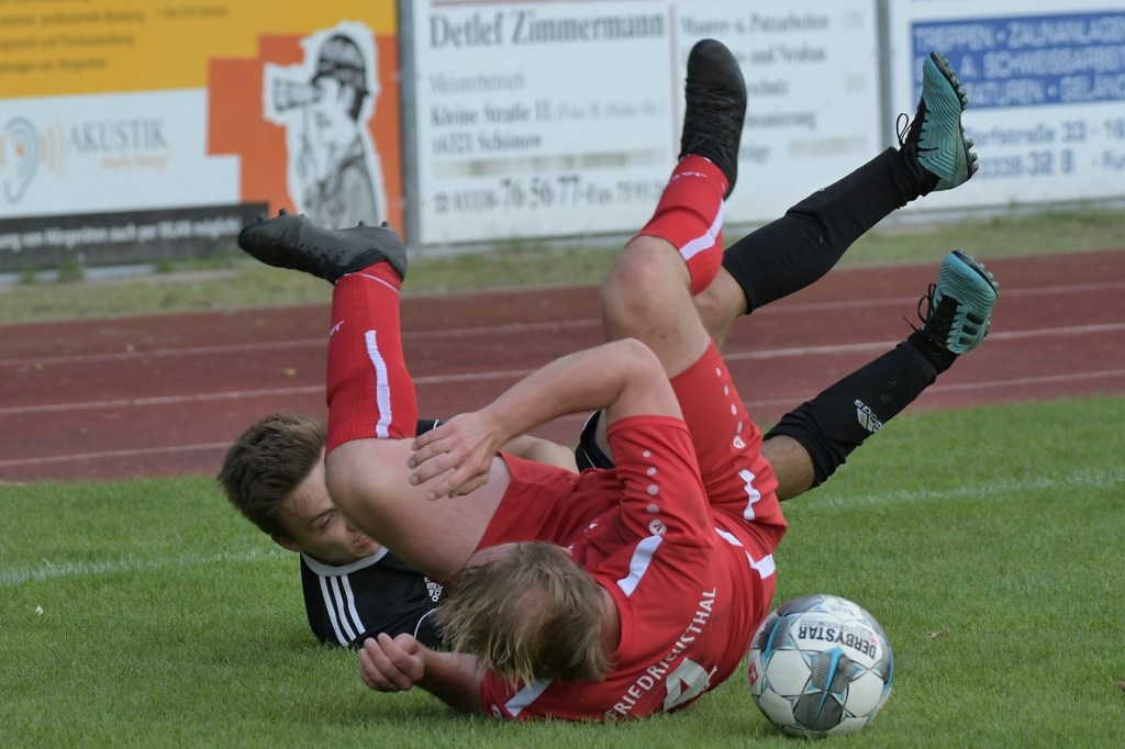 In der Kreisoberliga grüßt Rot-Weiß Schönow, auf Grund des standesgemäßen und schon zu erwartenden Resultates, weiterhin vom Platz an der Sonne. Dabei war die Aufgabe gegen den Oberhavelvertreter aus Friedrichsthal alles andere als ein lockerer Vorbeimarsch. Denn mit dem SV präsentierte sich auf dem Schönower Rasenplatz eine kämpferische Truppe, die sich keinesfalls hinten reinstellte, sondern die Zweikämpfe suchte, fand und auch in Offensivaktionen ummünzte. Positiv für den Spielverlauf war natürlich der frühe Treffer durch Benedict Knorr, der schon stark abseitsverdächtig einen abgefälschten Ball im Fünfmeterraum vor die Füße bekam und sehr abgeklärt einnetzte (6.). In der Folge begann im Mittelfeld eine Art „Abnutzungskampf“, der sich gerade für die offensiv ausgerichteten Hausherren erschwerend auswirkte. Denn die Strichliste für das Zählen der erwähnenswerten Torabschlüsse auf beiden Seiten konnte man beruhigt bei Seite legen. Schönows Führung war nicht unverdient. So taten die Barnimer etwas mehr für das Spiel als die Gäste. Auch in der „Hochrechnung“ der Halbchancen, konnte Rot-Weiß ein Plus für sich verbuchen. Im kämpferischen Potential konnte der SV glänzen, der gerade im Mittelfeld doch eine größere Anzahl an Zweikämpfen für sich entschied. So war die Partie zwar nicht uninteressant, hatte Rasse, kam aber doch in einigen Phasen sehr zerfahren daher. Nicht verwunderlich war es dann, dass das 2:0 nach einem Eckball fiel. Rik Roelofs war im Fünfer am höchsten gestiegen und mit seiner Stirn vielumjubelt zur Stelle (41.). Zum Wiederanpfiff änderte sich das Bild kaum. Friedrichsthal weiter im Kampfmodus mit etwas mehr Bemühungen in die Gefahrenzone zu kommen. Als dann Rik Roelofs in der 53. Minute das 3:0 erzielte, schienen die Messen gesungen. Roelofs spekulierte in dieser Situation und behielt Recht. Denn Gäste-Keeper Kevin Jänicke machte beim Rauslaufen keine gute Figur und musste an der Strafraumgrenze angekommen, letztendlich zu schauen, wie der Torschütze leichtes Spiel vor dem leeren Kasten hatte. Doch Friedrichsthal gab nicht auf und wurde dafür auch belohnt. Beim Foulspiel im Schönower Strafraum ließ der gute Referee Tim Gerstenberg keine zwei Meinungen aufkommen und zeigte sofort auf den Punkt. Moritz Fochler verlud Heimkeeper Enrico Müller und machte damit seiner Truppe noch einmal Hoffnung in die Partie zurückzukommen (70.). Doch da hatte Friedrichsthal die Rechnung ohne den starken Rik Roelofs gemacht. Denn genau der begrub den Lichtblick der Gäste mit dem 4:1. Diesmal war es Sebastian Gausepohl, der den nun dreifachen Torschützen per Flanke bediente (82.). Doch damit war noch nicht Schluss. Auch Moritz Fochler dürfte nochmal ran, der wiederum zum Strafstoß nach einem Foul antrat und Enrico Müller zum zweiten Mal in die falsche Ecke schickte (84.). Obwohl sich Rik Roelofs in blendender Verfassung präsentierte, hatte in den Schlussminuten sein Auftritt einen Makel. Und dies war die Chancenverwertung im Eins-gegen-Eins mit Gästetorsteher Kevin Jänecke, der die zwei klaren Möglichkeiten mit gutem Stellungsspiel und Reaktionsschnelligkeit zu Nichte machte. Dies war im Nachgespräch auch Tobias Robel, dem Verantwortlichen des Tabellenführers, aufgefallen. „In der ersten Halbzeit war ich sehr zufrieden, im zweiten Durchgang dann nicht mehr so, da machen wir dann zu viele Fehler, hinten wie auch vorne. Dann lassen wir einfach zu viel liegen. Wir müssen weiter daran arbeiten, dass wir unser gutes Spiel auch mal über 80 Minuten hinbekommen.“