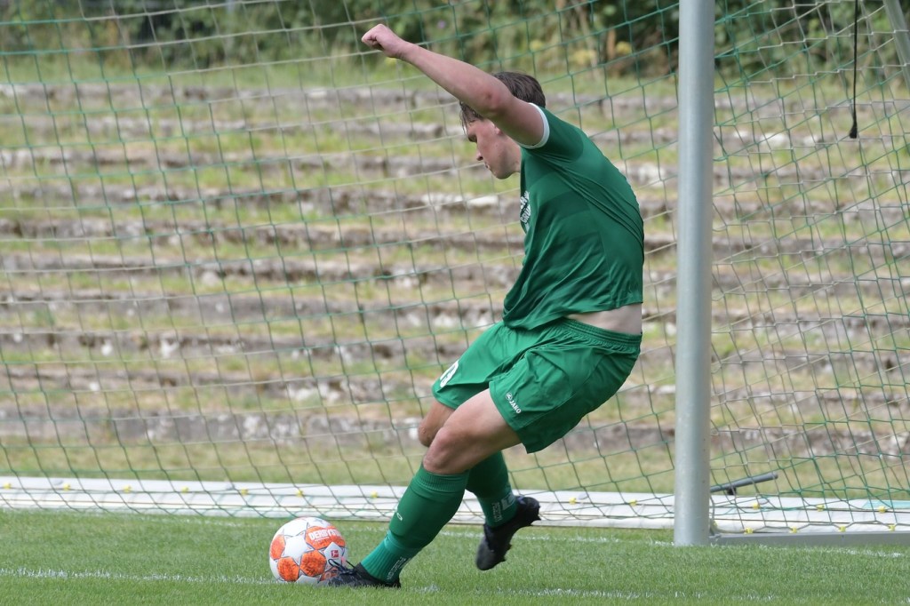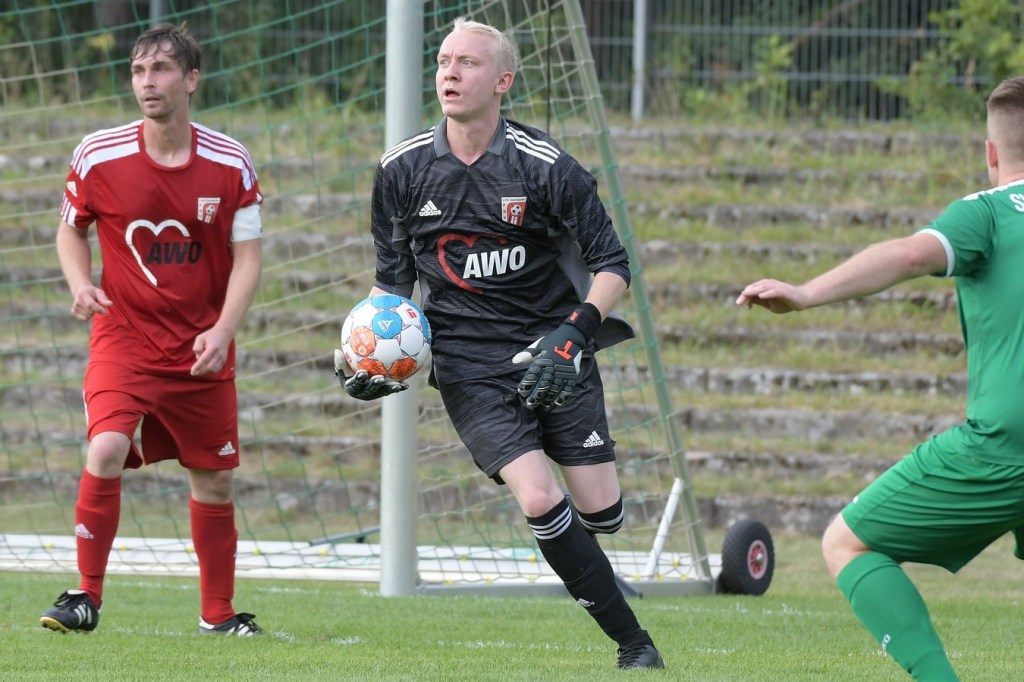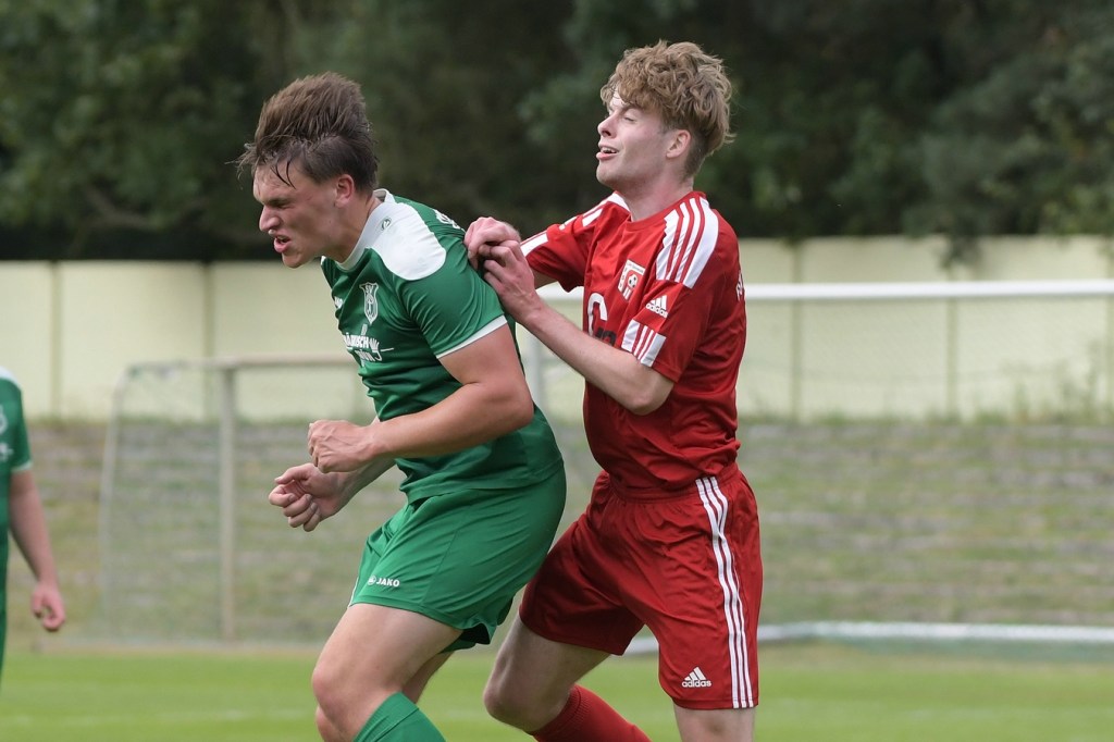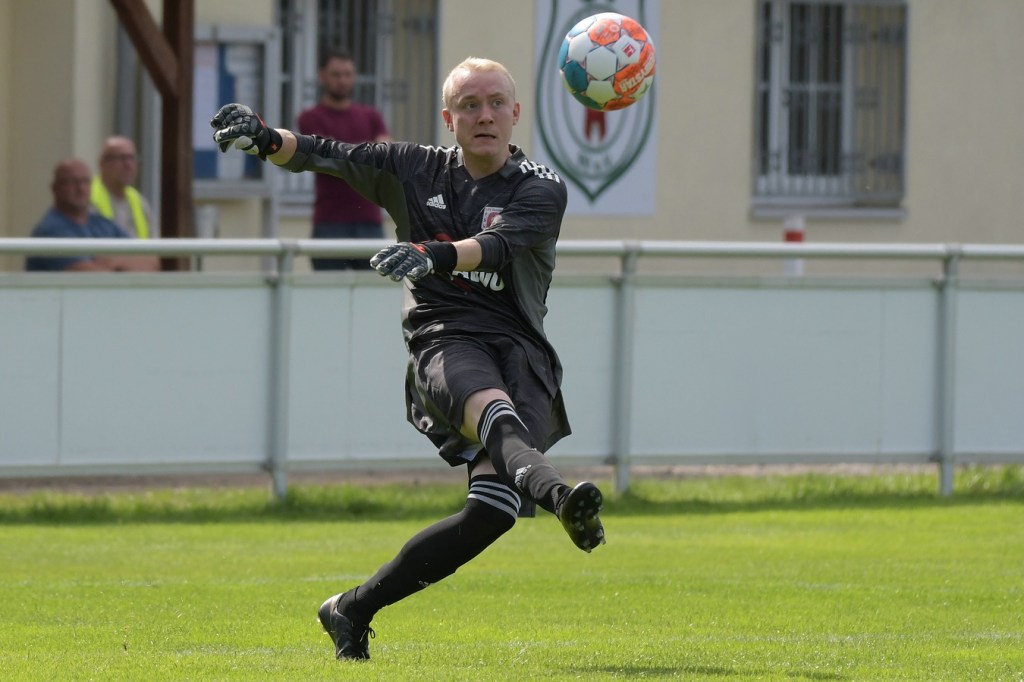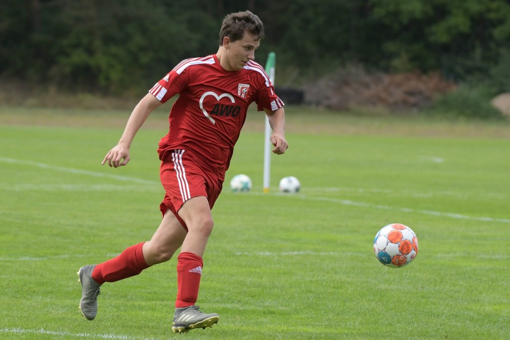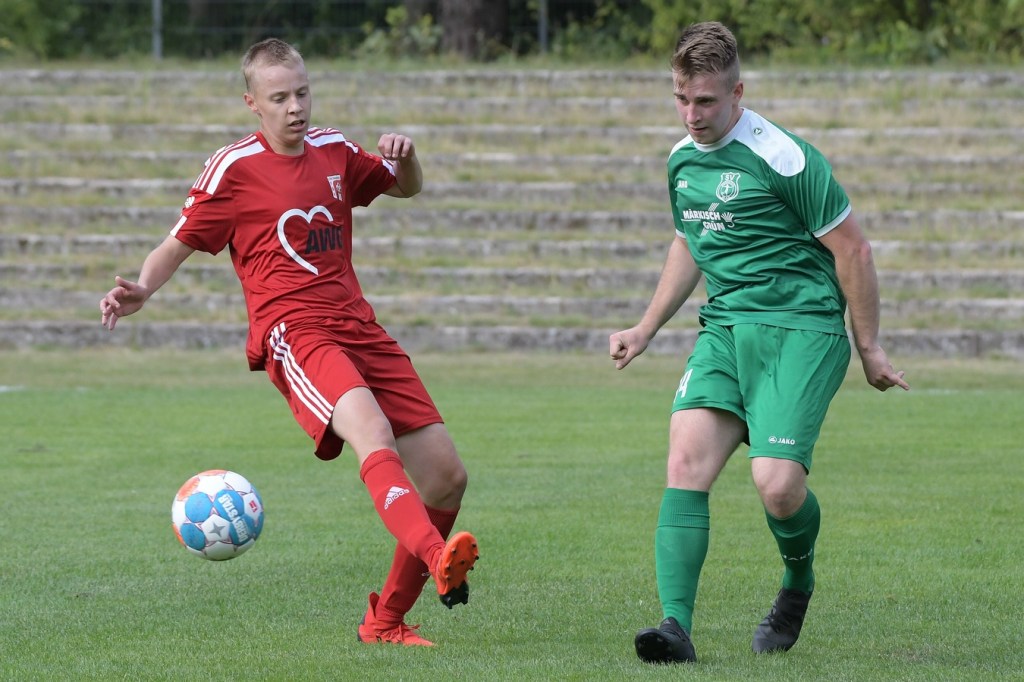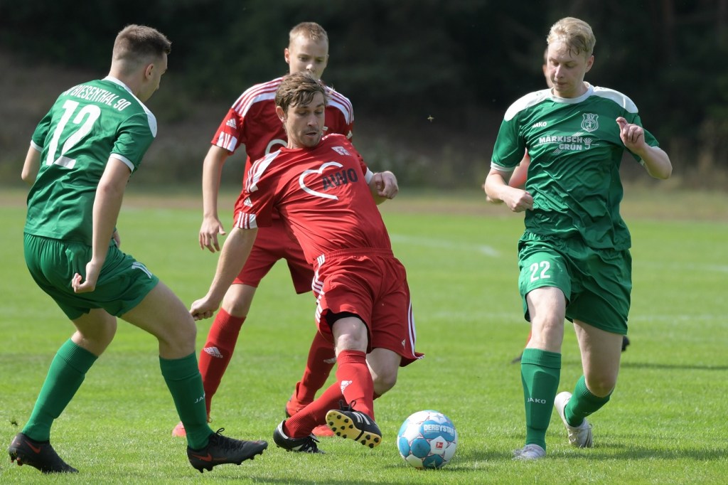 Nun zum Spiel. Beide Vertretungen hatten ihre Auftaktbegegnungen in den Sand gesetzt. Dabei sah Spielgemeinschafts Coach Thomas Eitner eine unverdiente Auftakt-Niederlage in Oderberg. „Wir hatten die klareren Chancen und hätten die Partie nicht verlieren dürfen“, so sein Statement kurz vor Spielbeginn. Doch der Auftritt seiner Jungs konnte an den vom 1. Spieltag nicht anknüpfen. Zumindest in der Kreation von Abschlussmöglichkeiten blieb die Truppe vieles schuldig. Es war eine interessante Begegnung, in der die Gäste sich viel lauffreudiger, zielstrebiger und vor allem spielsicherer präsentierten. So schleppten sich die Angangsminuten etwas, doch mit zunehmender Dauer nahm die Schlagzahl der Lokführer Richtung Kasten der Heimmannschaft merklich zu. Besonders die Offensivstrategen Maximilian Rohling und Jakob Müller wechselten sich im „Versieben“ von sehr guten Möglichkeiten ab. So hätte sich die Heim-Truppe kaum beschweren können, wenn man nach einer guten halben Stunde den Ball vier oder fünf Mal aus dem eigenen Kasten holen und zum Anstoß schreiten müssen. Biesenthal/Marienwerder hingegen, konterte sporadisch und hatte in der 24. Minute nach einem langen Ball von Roman Stasik die erste verheißungsvolle Tormöglichkeit. Doch Adressat Kevin Brömer nahm sich nicht die Zeit und durchaus vorhandene Freiheit noch näher an des Gegners Kiste zu kommen und schloss viel zu früh ab. So blieben im Endeffekt nur ein paar wenige Halbchancen, die Gästekeeper George Burghause kaum in Bedrängnis brachten. Lok haderte mit sich, blieb aber weiterhin am Drücker. Schlussendlich folgte noch die Belohnung, welche Maximilian Rohling erzielte und damit seine Truppe mit dem moralischen Vorteil in die Kabine zur Halbzeitbesprechung schickte. Rohling wurde zum Abstauber, nachdem SpG-Torsteher Stephan Wichert den ersten platzierten Schuss nur abklatschen konnte und Rohling die Kugel förmlich vor die Füße sprang (43.).