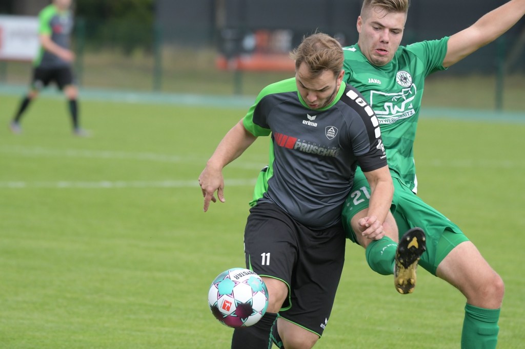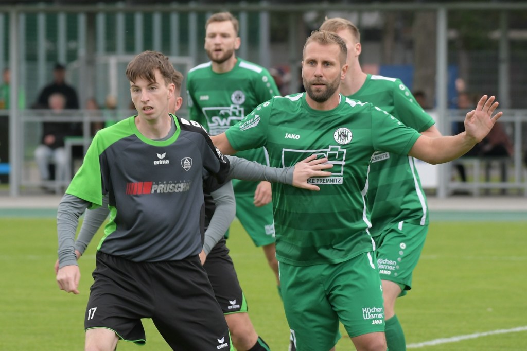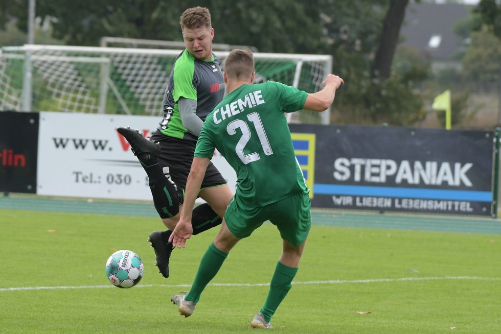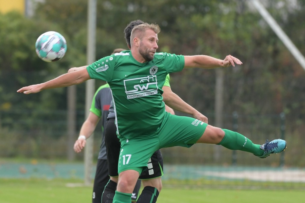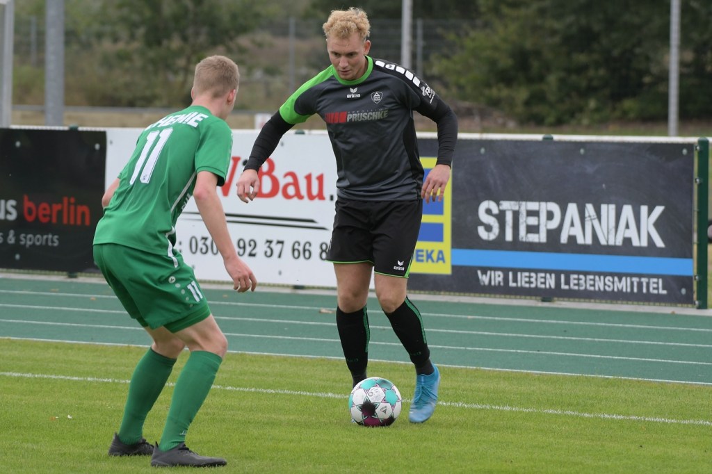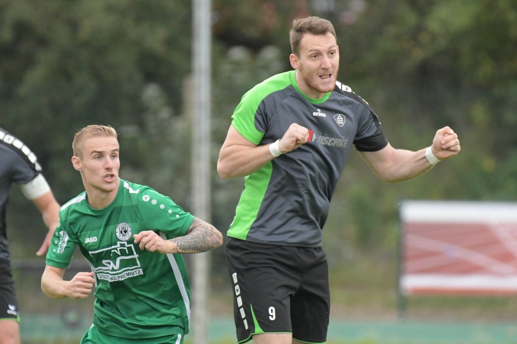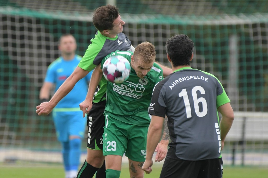 Wenn man das nackte Ergebnis liest, erscheint der Sieg des Favoriten aus Ahrensfelde standesgemäß. Schlussendlich unter Strich war es auch so und auch verdient. Nach dem Kantersieg aus der Vorwoche in Velten waren die Hoffnungen auf ein klares Endergebnis nicht von der Hand zu weisen, zumal sich die Gäste in der frühen Phase der Saison mit vier Punkten noch nicht ganz im ruhigen Fahrwasser der Liga befanden. Von Beginn an war klar, wer die Begegnung diktieren würde. Grün-Weiss bestimmte das Geschehen gegen körperlich robuste und mit Leidenschaft zu Werke gehende Gäste und musste sich schon früh damit abfinden, dass Geduld das Hauptanliegen werden würde. „Man kann nicht davon ausgehen, dass wir jede Woche die Gegner aus dem Stadion schießen“, hatte GWA-Trainer Sven Orbanke im Anschluss der Partie seine Truppe so ein wenig in Schutz genommen und damit auch schon durchblicken lassen, dass man es im Laufe der Saison mit Teams zutun bekommt, die die defensivere Spielweise bevorzugen werden. Denn genau das war die Marschroute der Chemiker, die dann bei eigenem Ballbesitz die Kugel lang Richtung GWA-Kasten schlugen und mit dem pfeilschnellen Elias Große schon eine kleine Waffe in ihren Reihen hatten. Die erste nennenswerte Möglichkeit der Begegnung hatte nämlich dieser Große, doch schloss er viel zu früh und überhastet ab, so dass der Ball weit über den Kasten flog (7.). Ahrensfelde hingegen tat sich schwer und versuchte es ebenfalls mit langen Bällen. Doch oft wurden die Anspiele mit zu viel „Schmackes“ in den Raum gebracht, was den Adressaten im läuferischen Anspruch einiges abverlangte und einige Male verpuffte, weil das Spielgerät nicht erreicht werden konnte. Möglichkeiten waren im Ansatz zwar vorhanden, doch fehlte dem Ahrensfelder Unterfangen einfach die zwingende Note. Chancen, wie die von Steven Knörnschild, den der Ball von den Gästen förmlich zum Kopfball im Abwehrdurcheinander zugespielt und erst dadurch gefährlich wurde, waren dem Zufall geschuldet (21.). Es wurde auch nicht viel besser, nachdem Dominic Gesierich das 1:0 erzielt hatte. Das sehenswerte Anspiel von Manuel Schmiedebach, genau durch die Abwehrkette hindurch, verwertete Gesierich per Schuss, ohne lange zu fackeln und unhaltbar (25.). Die Partie wurde nun noch zäher. Premnitz hatte schon vor dem Treffer den letzten Riegel auf sechs Personen erhöht und dem Favoriten damit eine große Denkaufgabe und vor allem Ideensuche aufgebürdet. Und daran hatte Grün-Weiss stark zu knabbern. Zwischendurch war dann wieder mal Elias Große an der Reihe, doch sein Abschluss verballerte er ebenso wie beim ersten Versuch (30.). Ahrensfelde blieb zwar am Drücker und irgendwie in der Chancenerarbeitung weiter im Zufalls-Modus. Wie in der Möglichkeit durch Dominic Gesierich, als Chemie kein richtiges Mittel fand, um den Ball aus der Gefahrenzone zu entfernen und dann Glück hatte, dass der Schütze nur den Pfosten traf, der Ball kurz vor der Torlinie entlangrollte und neben dem anderen Pfosten ins Aus ging (32.). In der 34. Minute musste auch mal GWA-Keeper Mateusz Daniel Mika eingreifen. Elias Große, der Gäste-Unruheherd schlechthin, wurde wieder geschickt. Doch der Schlussmann war mit dem Kopf zur Stelle und machte damit die aussichtsreiche Möglichkeit zunichte.