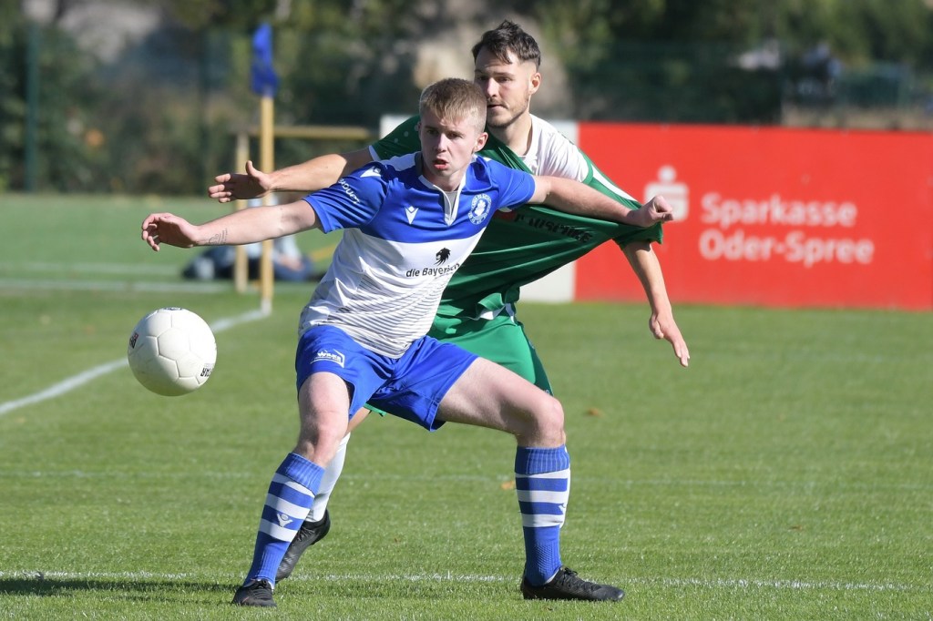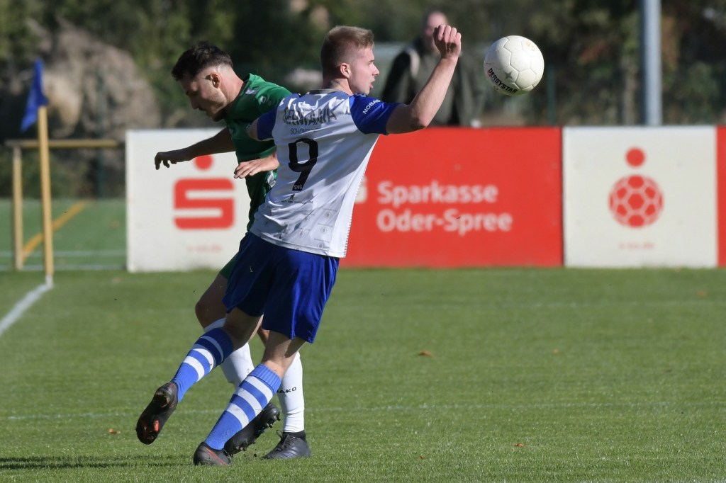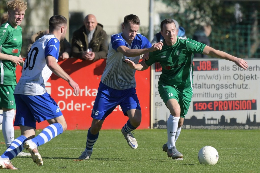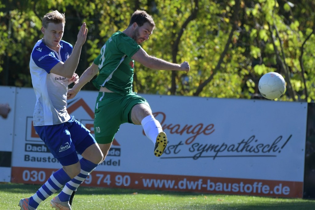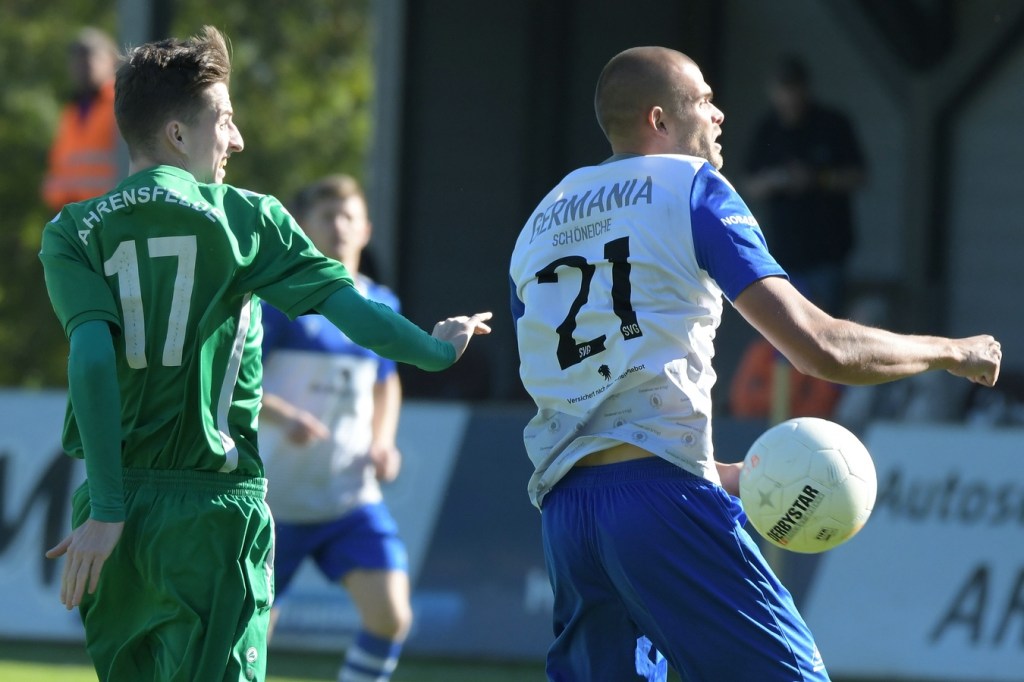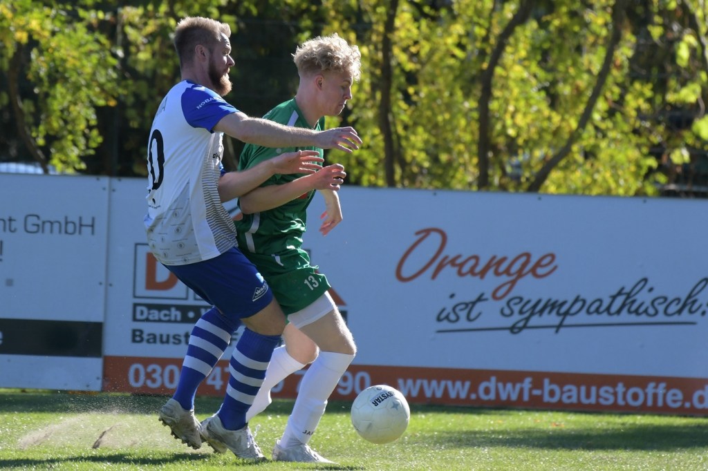 Die Partie begann recht flott und brauchte keine Aufwärm- bzw. Abtastphase. Beide Vertretungen begegneten sich auf Augenhöhe, wobei Ahrensfelde schon etwas mehr investierte und dies auch in Möglichkeiten umsetzte. So war es Tilo Scheffler, der einen Schuss nach einem abgewehrten Eckball aus gut 18 Metern aufs Schöneicher Tor brachte, dabei aber noch nicht genug Zielwasser intus hatte und den Ball doch weit über dem Tor setzte (2.). Die nächste Gästemöglichkeit hatte Steven Knörnschild. Er schraubte sich nach eine Flanke von der linken Seite im Kopfballduell am höchsten, schaffte es aber letztendlich auch nicht, das Spielgerät platziert Richtung Tor zu bringen (8.). Im zweiten Versuch, dann in der 11. Minute, machte es Knörnschild besser. Diesmal benutzte er den Fuß nach einem sehenswerten Anspiel durch Patrick Hamel und ließ mit seinem Schlenzer Germania-Keeper Chris Kütter keine Abwehrmöglichkeit. Dass dies im Endeffekt das Tor des Tages werden sollte, war zu diesem Zeitpunkt überhaupt noch nicht zu vermuten. Denn Ahrensfelde wollte mehr und übernahm in der Folge zusehends die Regie in der Partie. Schöneiche kam überhaupt nicht zur Entfaltung, musste viel hinterherlaufen und war gerade in den Zweikämpfen oft der zweite Sieger. Grün-Weiss war griffig und irgendwie auch immer einen Schritt schneller. Julian Hentschel nahm nur 120 Sekunden später aus der zweiten Reihe maß, aber auch sein Abschluss landete in der oberen Etage des Schöneicher Kastens. Die Begegnung tauchte Mitte der Halbzeit in eine Phase ein, in der auch die Gästebemühungen verflachten und Höhepunkte immer seltener wurden. Germania suchte weiterhin die Tür zum Eintritt ins Spiel und schaffte es in der 28. Minute das erste Mal erwähnenswert vors Ahrensfelder Gehäuse zu kommen. Marco Spann sein Schuss von der Strafraumgrenze brachte aber kaum Gefährlichkeit und wurde leichte Beute für Gäste-Torsteher Mateusz Daniel Mika.