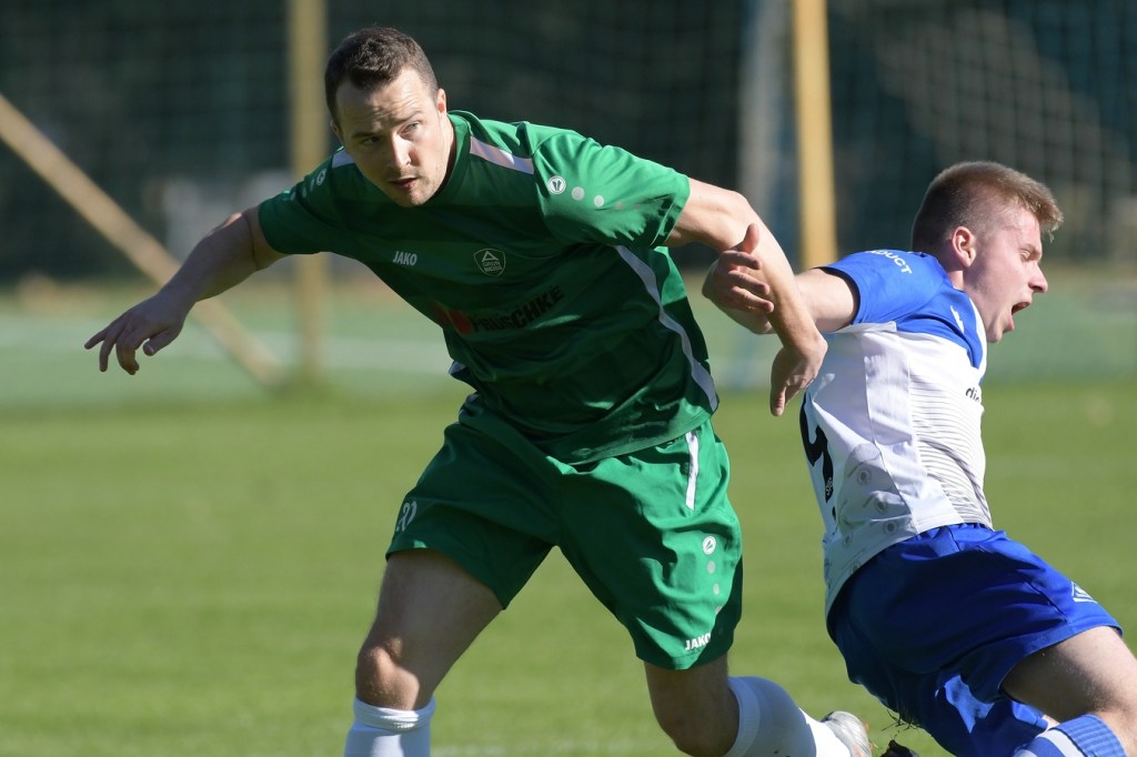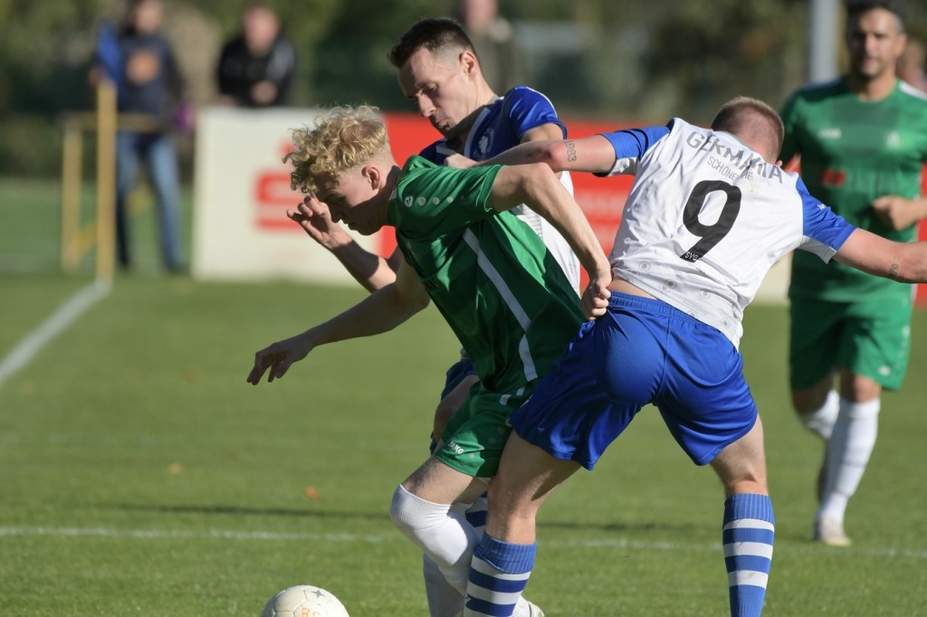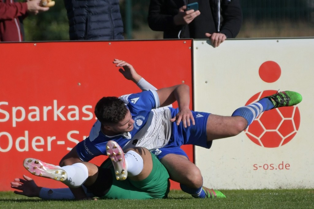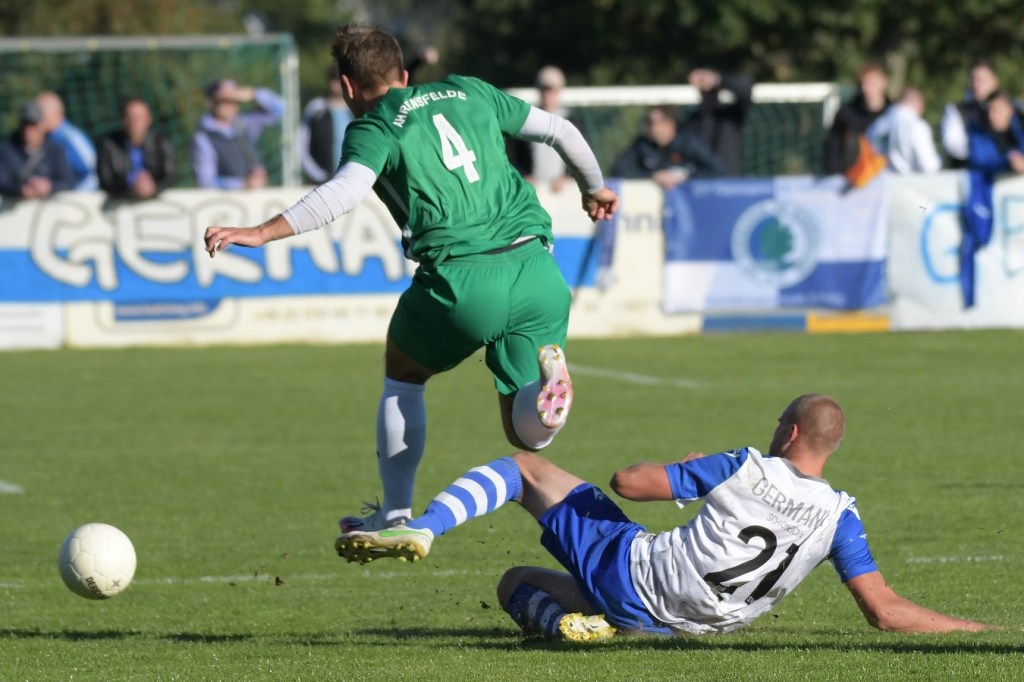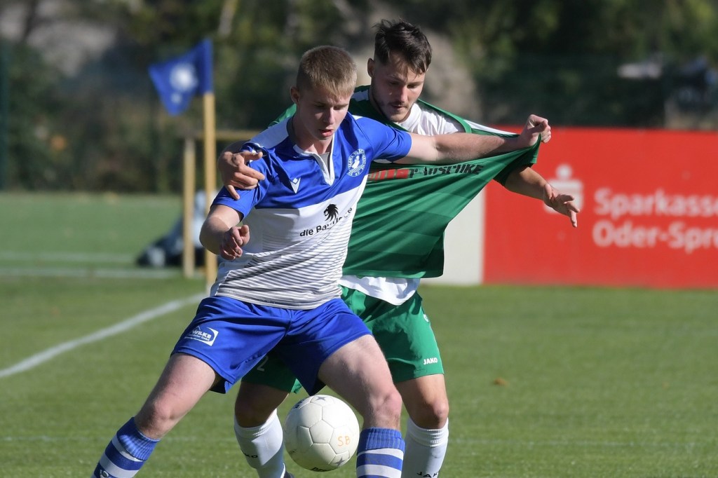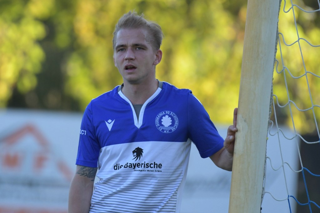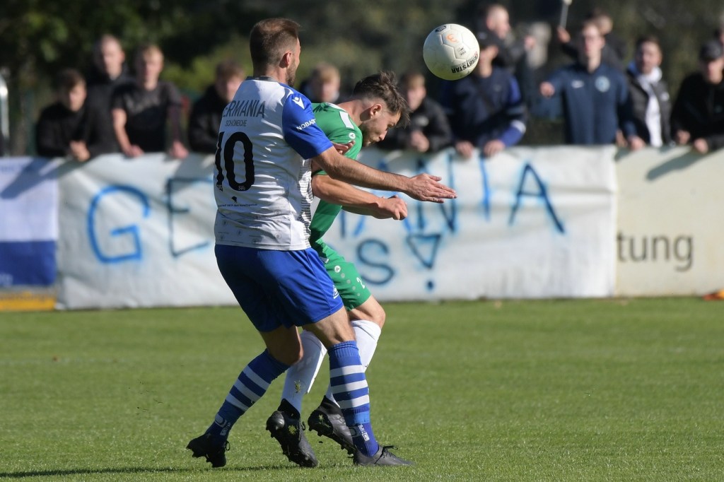 Die Partie begann recht flott und brauchte keine Aufwärm- bzw. Abtastphase. Beide Vertretungen begegneten sich auf Augenhöhe, wobei Ahrensfelde schon etwas mehr investierte und dies auch in Möglichkeiten umsetzte. So war es Tilo Scheffler, der einen Schuss nach einem abgewehrten Eckball aus gut 18 Metern aufs Schöneicher Tor brachte, dabei aber noch nicht genug Zielwasser intus hatte und den Ball doch weit über dem Tor setzte (2.). Die nächste Gästemöglichkeit hatte Steven Knörnschild. Er schraubte sich nach eine Flanke von der linken Seite im Kopfballduell am höchsten, schaffte es aber letztendlich auch nicht, das Spielgerät platziert Richtung Tor zu bringen (8.). Im zweiten Versuch, dann in der 11. Minute, machte es Knörnschild besser. Diesmal benutzte er den Fuß nach einem sehenswerten Anspiel durch Patrick Hamel und ließ mit seinem Schlenzer Germania-Keeper Chris Kütter keine Abwehrmöglichkeit. Dass dies im Endeffekt das Tor des Tages werden sollte, war zu diesem Zeitpunkt überhaupt noch nicht zu vermuten. Denn Ahrensfelde wollte mehr und übernahm in der Folge zusehends die Regie in der Partie. Schöneiche kam überhaupt nicht zur Entfaltung, musste viel hinterherlaufen und war gerade in den Zweikämpfen oft der zweite Sieger. Grün-Weiss war griffig und irgendwie auch immer einen Schritt schneller. Julian Hentschel nahm nur 120 Sekunden später aus der zweiten Reihe maß, aber auch sein Abschluss landete in der oberen Etage des Schöneicher Kastens. Die Begegnung tauchte Mitte der Halbzeit in eine Phase ein, in der auch die Gästebemühungen verflachten und Höhepunkte immer seltener wurden. Germania suchte weiterhin die Tür zum Eintritt ins Spiel und schaffte es in der 28. Minute das erste Mal erwähnenswert vors Ahrensfelder Gehäuse zu kommen. Marco Spann sein Schuss von der Strafraumgrenze brachte aber kaum Gefährlichkeit und wurde leichte Beute für Gäste-Torsteher Mateusz Daniel Mika.