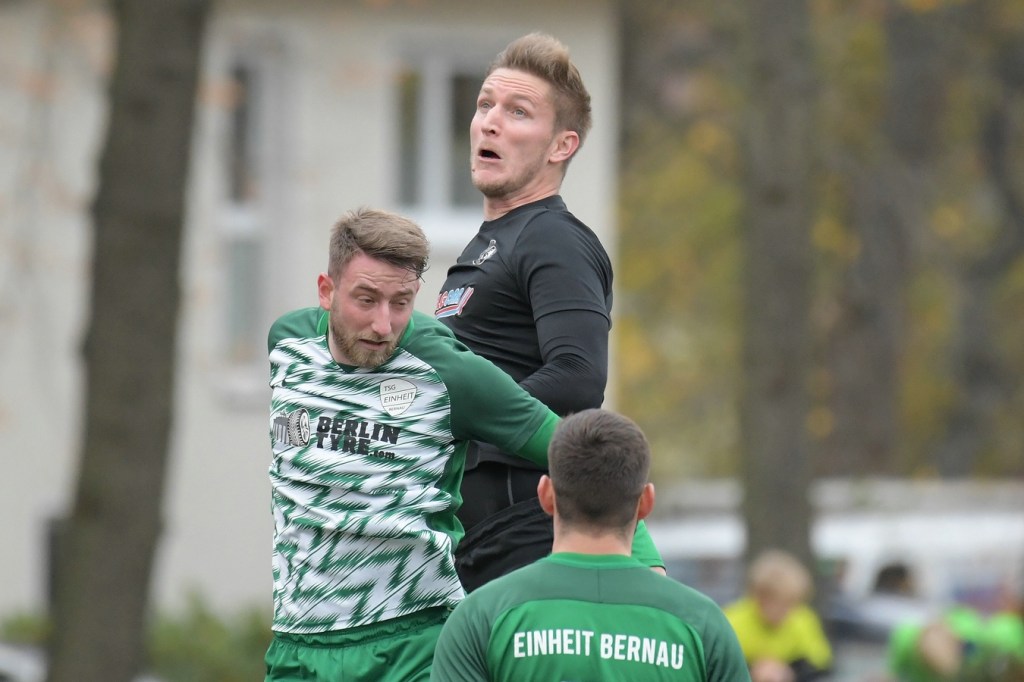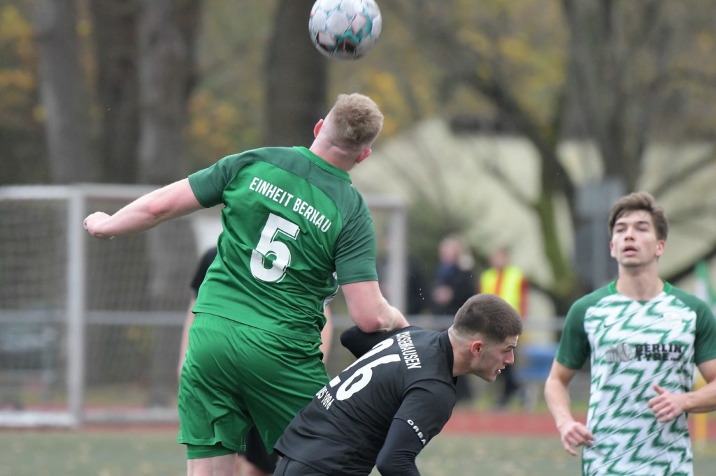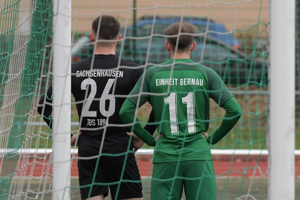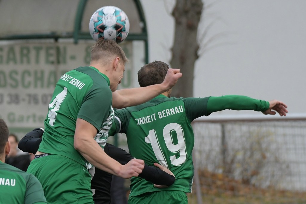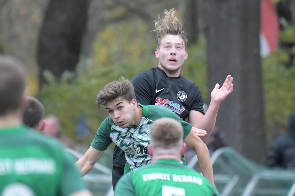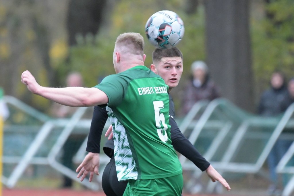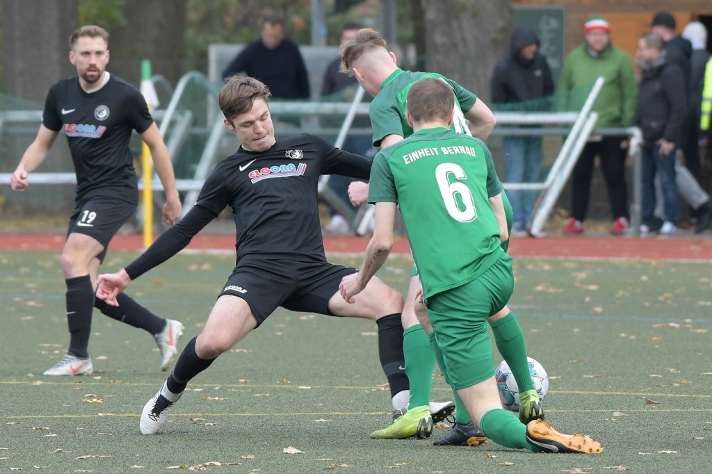 „Der Tabellenführer, die Stars von Morgen, die TSG Einheit Bernau“, so begann der Stadionsprecher seine Offerte zum Spitzenspiel in der Brandenburgliga und sorgte damit schon bei einigen Anwesenden für ein grinsendes Kopfschütteln. Das was dann aber auf den Anpfiff des Berliner Schiedsrichters Sebastian Hornig folgte, war Spitzenfußball ‚par excellence‘. Es wurde eine Begegnung zweier Teams, welche mit absolutem Recht das Prädikat „Oberstes Regal der Liga“ tragen dürfen. Aufwärmphase war für beide Vertretungen ein Fremdwort, die Visiere wurde sofort heruntergelassen und Vollgas gegeben. Rasse, Leidenschaft, spielerische Intelligenz und körperliches Knowhow waren die Attribute, die das Spiel prägten, welches keine Sekunde Unaufmerksamkeiten erlaubte. Mit der eigentlich ersten Möglichkeit für die Hausherren fiel auch das 1:0. Torschütze war Frederick Fiebig, der von der rechten Strafraumecke per Flachschutz im langen Eck einnetzte (6.). Artur Sajfutdinov hatte dann zwei Minuten später den nächsten Treffer auf dem Fuße. Doch in der Vorbereitung dazu, als er versuchte in eine noch bessere Position zu kommen, verhaspelte er sich etwas und sein Schuss ging dann doch recht eindeutig am Gästekasten vorbei. Ein Einwurf und einer daraus folgenden Flanke in den Fünfer der Hausherren brachte den Ausgleich zum Tragen. Christopher Groll, als Kopfball-Torschütze wird sich schon etwas gewundert haben, dass er so frei zwischen zwei Abwehrspielern zum Abschluss kam (10.). Wenn die Begegnung nicht auf Kunstrasen stattgefunden hätte, wäre das oft zitierte „Grasfressen“ viel passender gewesen. Gerade im Mittelfeld wurde kein Zentimeter preisgegeben. Beide Mannschaften lebten dabei vom Teamgeist und bewiesen in vielen Aktionen, dass im modernen Fußball, neben der Qualität auch diese Tugend extrem an Gewicht gewonnen hat. Ein langer Ball in der 23. Minute bereitete dann die erneute Führung der Hausherren vor. Die Kugel, welche an der Strafraumkante aufsetzte und im Handling damit die TuS-Abwehr schlecht aussehen ließ, brachte Maximilian Walter in die Position mit einen Heber Sachenhausens Keeper Nick Schrobback viel umjubelt zu überwinden. Obwohl die Begegnung in der Folge nur noch ein paar Halbchancen in der Präsentation hatte, blieb das Niveau weiterhin im oberen Level. Von TuS-Torgarant Andor Müller war nicht viel sehen, der zwar viel versuchte, aber im ersten Durchgang recht glücklos agierte. Ein Gästekopfball, den Bernaus Sam-Rene Bartz auf der Linie stehend in letzter Konsequenz entschärfte, beendete dann die erste Halbzeit (47.).
