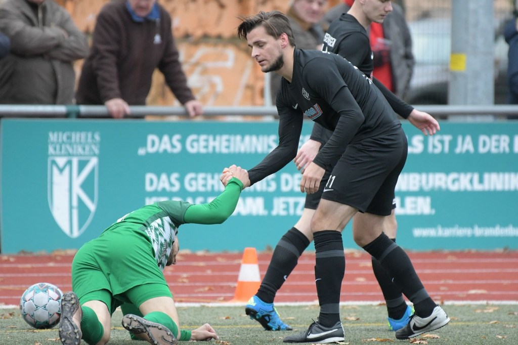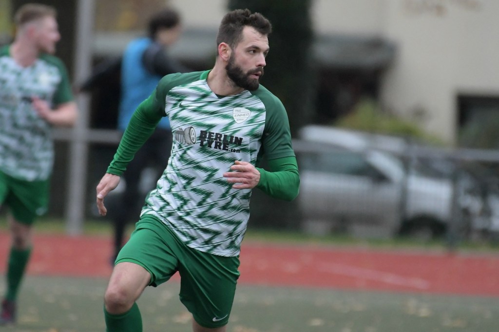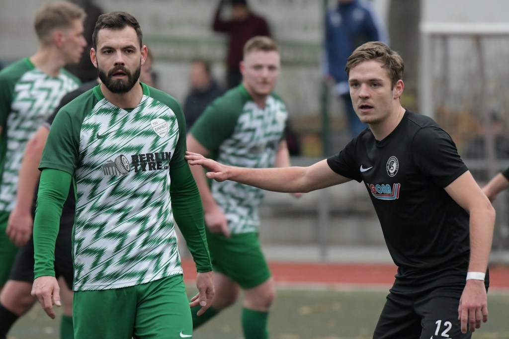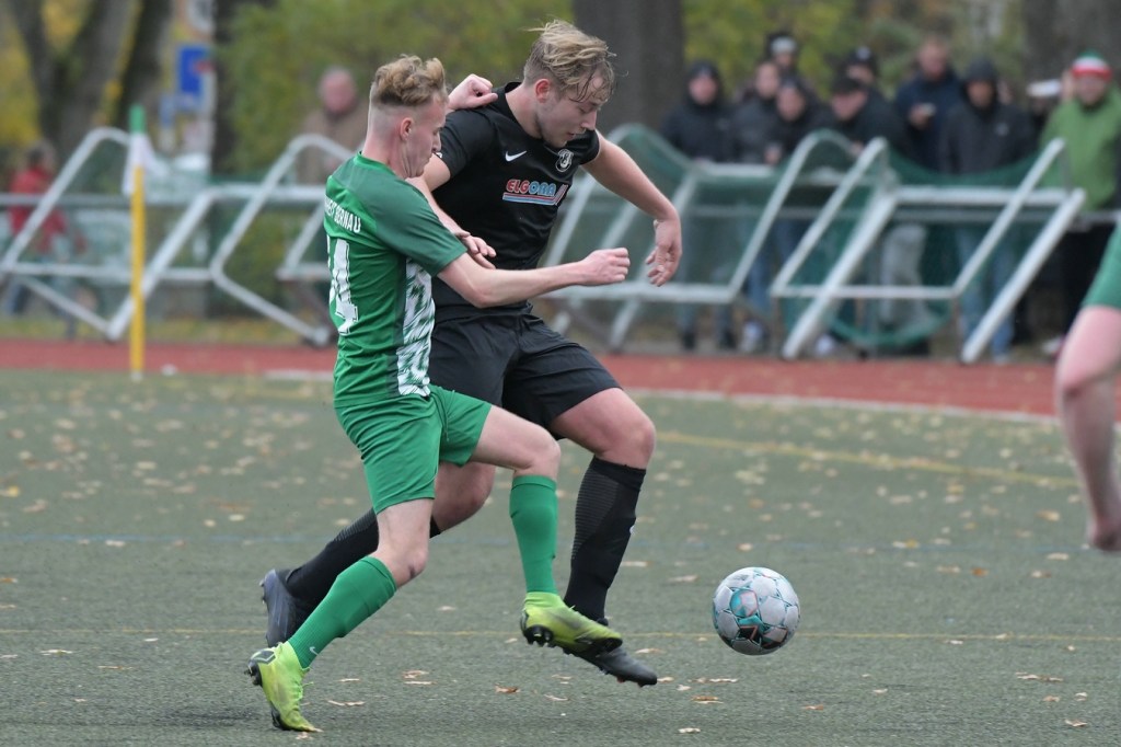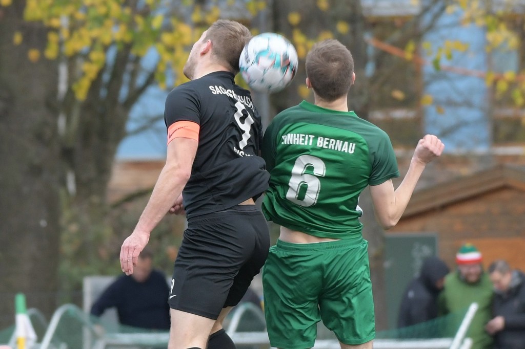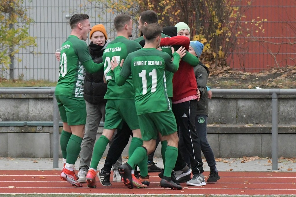 „Der Tabellenführer, die Stars von Morgen, die TSG Einheit Bernau“, so begann der Stadionsprecher seine Offerte zum Spitzenspiel in der Brandenburgliga und sorgte damit schon bei einigen Anwesenden für ein grinsendes Kopfschütteln. Das was dann aber auf den Anpfiff des Berliner Schiedsrichters Sebastian Hornig folgte, war Spitzenfußball ‚par excellence‘. Es wurde eine Begegnung zweier Teams, welche mit absolutem Recht das Prädikat „Oberstes Regal der Liga“ tragen dürfen. Aufwärmphase war für beide Vertretungen ein Fremdwort, die Visiere wurde sofort heruntergelassen und Vollgas gegeben. Rasse, Leidenschaft, spielerische Intelligenz und körperliches Knowhow waren die Attribute, die das Spiel prägten, welches keine Sekunde Unaufmerksamkeiten erlaubte. Mit der eigentlich ersten Möglichkeit für die Hausherren fiel auch das 1:0. Torschütze war Frederick Fiebig, der von der rechten Strafraumecke per Flachschutz im langen Eck einnetzte (6.). Artur Sajfutdinov hatte dann zwei Minuten später den nächsten Treffer auf dem Fuße. Doch in der Vorbereitung dazu, als er versuchte in eine noch bessere Position zu kommen, verhaspelte er sich etwas und sein Schuss ging dann doch recht eindeutig am Gästekasten vorbei. Ein Einwurf und einer daraus folgenden Flanke in den Fünfer der Hausherren brachte den Ausgleich zum Tragen. Christopher Groll, als Kopfball-Torschütze wird sich schon etwas gewundert haben, dass er so frei zwischen zwei Abwehrspielern zum Abschluss kam (10.). Wenn die Begegnung nicht auf Kunstrasen stattgefunden hätte, wäre das oft zitierte „Grasfressen“ viel passender gewesen. Gerade im Mittelfeld wurde kein Zentimeter preisgegeben. Beide Mannschaften lebten dabei vom Teamgeist und bewiesen in vielen Aktionen, dass im modernen Fußball, neben der Qualität auch diese Tugend extrem an Gewicht gewonnen hat. Ein langer Ball in der 23. Minute bereitete dann die erneute Führung der Hausherren vor. Die Kugel, welche an der Strafraumkante aufsetzte und im Handling damit die TuS-Abwehr schlecht aussehen ließ, brachte Maximilian Walter in die Position mit einen Heber Sachenhausens Keeper Nick Schrobback viel umjubelt zu überwinden. Obwohl die Begegnung in der Folge nur noch ein paar Halbchancen in der Präsentation hatte, blieb das Niveau weiterhin im oberen Level. Von TuS-Torgarant Andor Müller war nicht viel sehen, der zwar viel versuchte, aber im ersten Durchgang recht glücklos agierte. Ein Gästekopfball, den Bernaus Sam-Rene Bartz auf der Linie stehend in letzter Konsequenz entschärfte, beendete dann die erste Halbzeit (47.).
