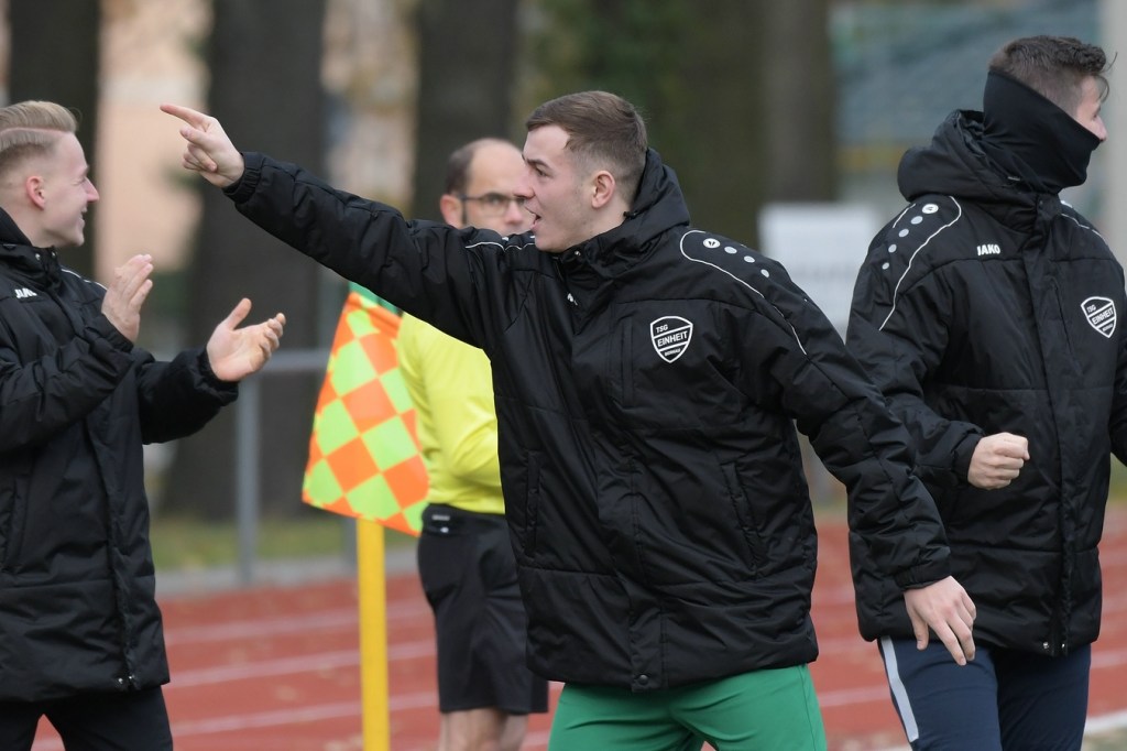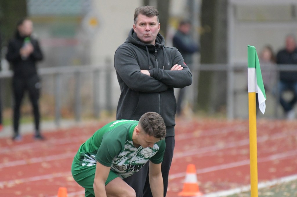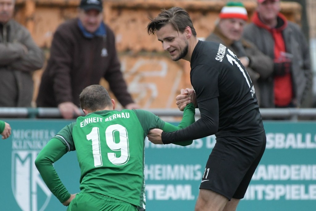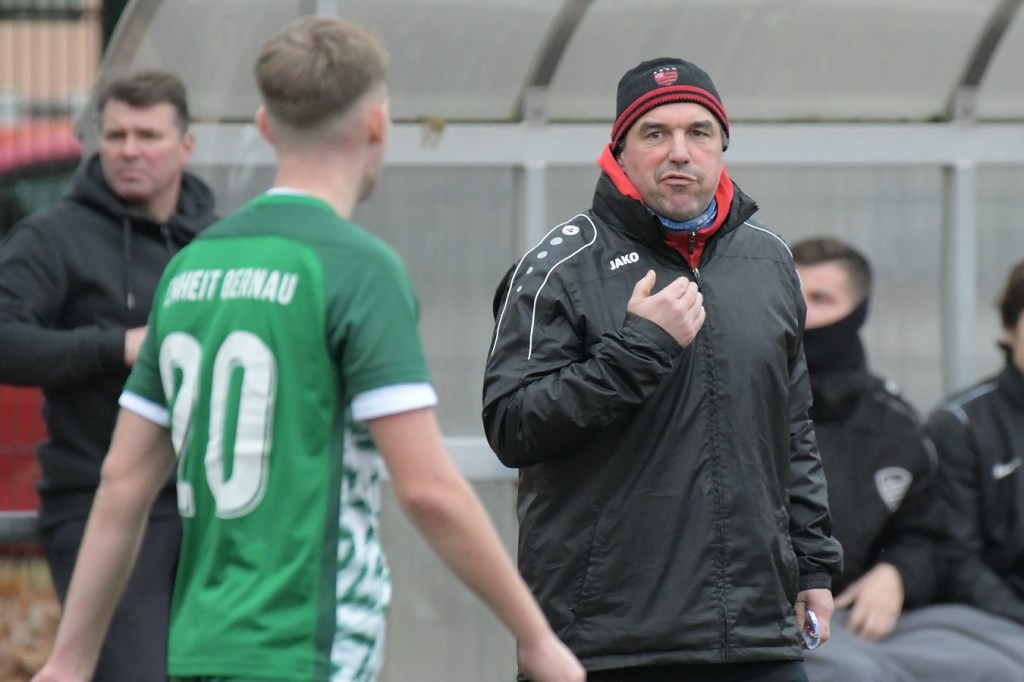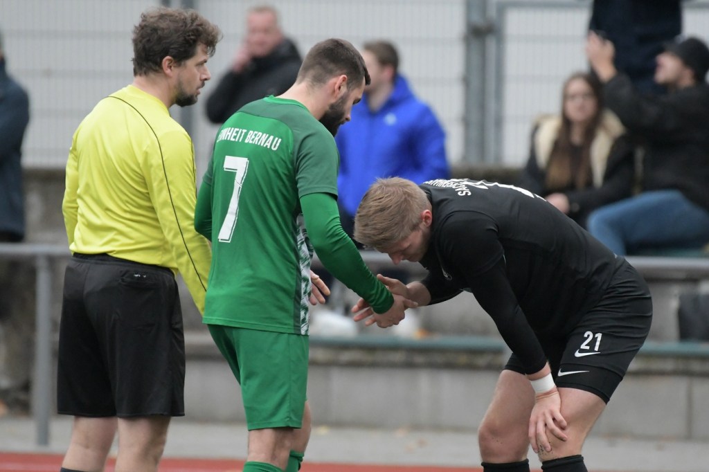 Mit dem Wiederanpfiff setzte das „Spektakel“ dort an, wo es vor dem Pausentee aufgehört hatte. Nur gab es jetzt einen kleinen, aber nicht unwichtigen Unterschied. Denn Sachsenhausen legte noch eine Schippe drauf und drängte Einheit mehr und mehr in die Defensivarbeit. Eine etwas unübersichtliche Zweikampfaktion im Bernauer Strafraum, welche in einem Foulspiel mündete, brachte den Referee auf den Plan, der mit guter Sicht zum Geschehen ohne Umschweif auf den Strafstoßpunkt zeigte. Andor Müller hatte sich den Ball zurechtgelegt und halbhoch Richtung rechten Pfosten geschossen. Steve Jarling roch den Braten und war zur Stelle, um das Spielgerät zur Ecke abzuwehren (53.). Doch der gut aufgelegte Jarling konnte schlussendlich den nun verdienten Ausgleich in der 60. Minute nicht mehr verhindern. Andor Müller, mit dem Rücken zum Tor, legte ein Zuspiel per Kopf auf Denis Duraku zurück, der seinerseits nicht lange fackelte und direkt abzog. Der Tor-Jubel kannte keine Grenzen und zeigte, welcher Druck in dieser Spitzenbegegnung lag. TuS blieb weiter am Drücker und war der eigenen Führung näher als der bis dato Tabellenführer. Doch ausgerechnet Maximilian Walter, der wegen einer Verletzung schon fast ausgewechselt worden wäre und darum gebeten hatte, es noch einmal zu versuchen, erzielte per Konter-Solo die erneute Heimführung (70.). Der Nackenschlag für Sachsenhausen blieb aber ohne Wirkung und trieb das Team weiter in den Vorwärtsgang. Dabei wurde Steve Jarling in einigen Situationen zum „Festhalter“ der knappen Führung, als er mit guten Paraden glänzen konnte. Intensive Minuten, in denen Bernau mit großer Leidenschaft verteidigte und kaum noch in die Entlastung kam, bestimmten die Schlussphase. Schiedsrichter Hornig zeigte fünf Finger für die Nachspielzeit, in der es noch einmal sehr hektisch und vor allem hoch emotional wurde. Denn sein Strafstoßpfiff in der 93. Minute, wegen eines aus seiner Sicht vermeintlichen Handspiels, Julian Graf hatte den Ball aus Nahdistanz an die Hand bekommen, löste große Diskussionen aus. Einheits Trainer, Nico Thomaschweski, eigentlich bekannt als recht nüchtern und ruhig agierender Übungsleiter, konnte sich kaum noch im Zaum halten. Hornig verwarnte ihn und ließ den Elfmeter ausführen. Dominic Schöps übernahm die Verantwortung und machte mit dem unhaltbaren Treffer seine Kollegen und den Anhang überaus glücklich. Nur Tomaschewski konnte und ließ sich nicht beruhigen. Sein emotionales Statement nach Spielende mit dem Referee quittierte Hornig mit Gelb/Rot, was den Trainer wohl im nächsten Spiel in Falkensee zum Zuschauen zwingen wird. Meinungsbilder nach Spielende waren kaum einzuholen. Nur Bernaus Kapitän, Tom Schneider, der emotional stark gescholten folgende Worte fand. „Wenn Du in letzter Minute solch einen Elfmeter kassierst, ist das natürlich sehr ärgerlich. Unsere kämpferische Leistung war heute super, wir haben unsere Chancen konsequent genutzt. Das zerrt schon sehr an einem.“