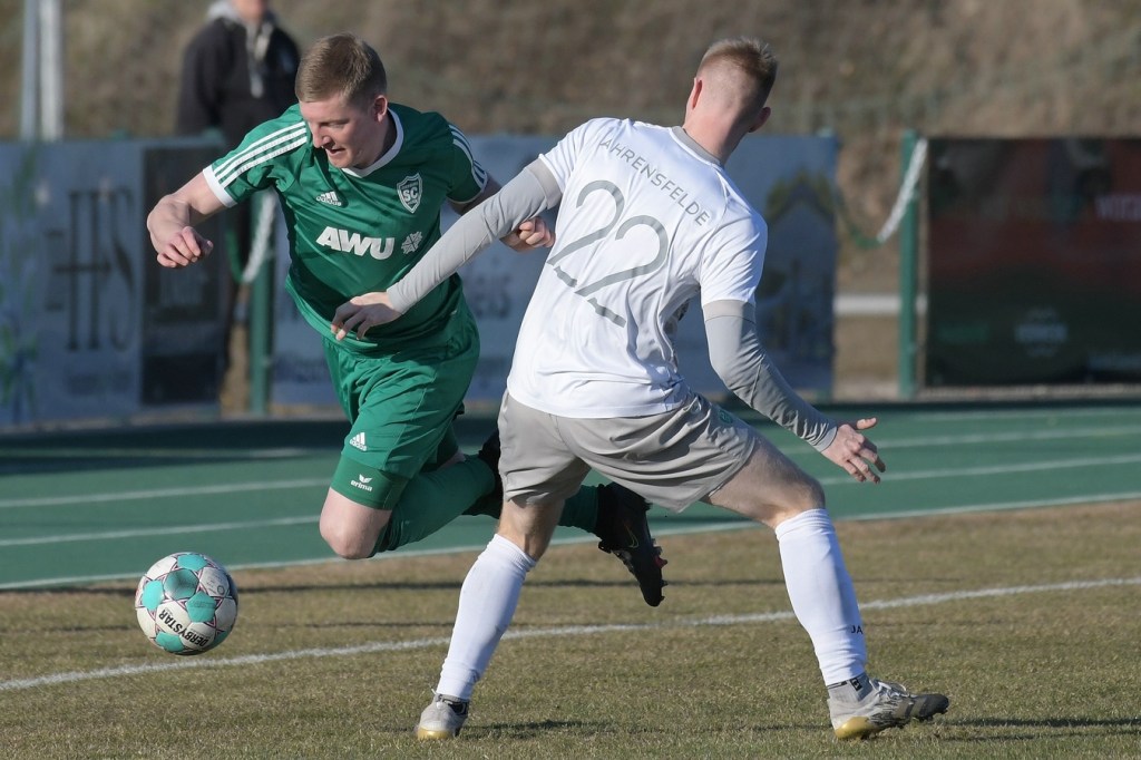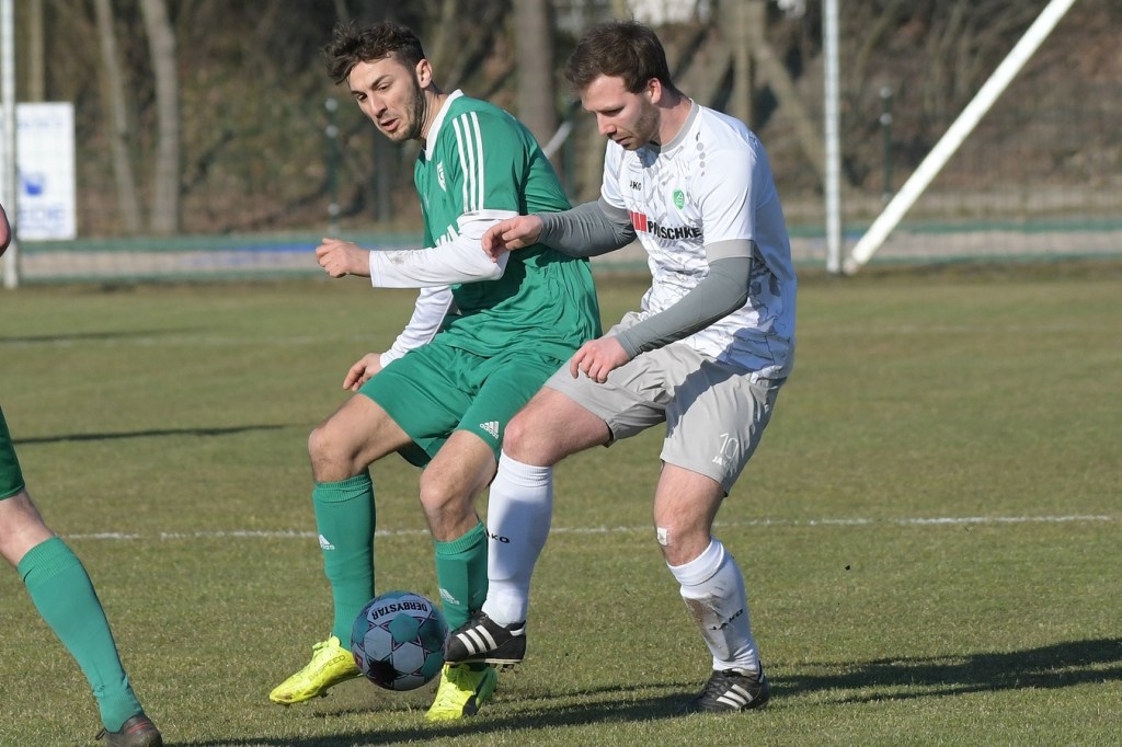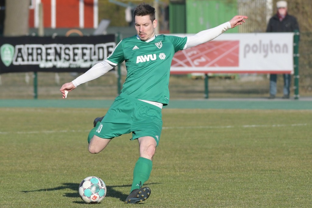 Es wurde eine ganz zähe Angelegenheit. Und eines wurde schon kurz nach dem Anpfiff des jungen Referees Michel Sieh ganz klar. Ahrensfelde würde nur zum Erfolg kommen, wenn man es schaffen würde, über Schnelligkeit und Spielwitz den mit breiter Brust angetretenen Gästen (2 Siege in Folge) beizukommen. Doch genau diese zwei Attribute wurden besonders im ersten Durchgang zu Fremdworten. Hinzu kam noch der Fakt, dass auch in der Körpersprache einiges im Argen lag und auch von der Trainerbank nicht wirklich viel Konstruktives kam um dem Abhilfe zu schaffen. Trotzdem wurde auch noch Fußball gespielt. Velten demgegenüber machte gerade in der Defensive vieles richtig, zeigte Leidenschaft, schaffte es aber auch viel zu selten Offensives auf die Platte zu bekommen. So beförderte sich Julian Hentschel mit einem Freistoß aus achtzehn Metern und der Wirkung, dass Veltens Keeper Christian Strehk ordentlich abtauchen musste, um die Kugel um den Pfosten zu lenken, als Erster auf die Liste der nennenswerten Möglichkeiten (9.). In der Folge machte Grün-Weiss schon das Spiel, aber mehr als eine paar laue bis windige Halbchancen sprangen dabei nicht heraus. Velten hingegen kam seltener zu Möglichkeiten, an denen aber auch die Heimtruppe ihre Anteile hatte, wie bei der Kopfballrückgabe von Sebastian Simon auf seinen Keeper im Fünfmeterraum. Dabei übersah er wohl, dass Hugo Paschen schon hinter ihm stand, er diesen überspielte und dazu zwang in aller letzter Not den Ball ins Aus zu befördern (26.). Was den Grün-Weissen ebenfalls sprichwörtlich auf die Füße viel, war der Umstand der Verkomplizierung der eigenen Offensivaktionen. Anstatt mal den Instinkt zu nutzen und Mut zu beweisen, kamen schlussendlich Notabspiele zum Tragen, welche wirklich gute Möglichkeit im positiven Ansatz zunichtemachten. Die Partie schob sich mit zunehmender Dauer immer mehr in die Zerfahrenheit und man wurde irgendwie das Gefühl nicht los, dass die Gäste näher an der Führung waren als der große Staffelfavorit. Der Konter in der 35. Minute, welcher über zwei Stationen bei Robert Schöniger landete und in letzter Not noch der Abschluss verhindert werden konnte, untermauerte diese Hypothese.
