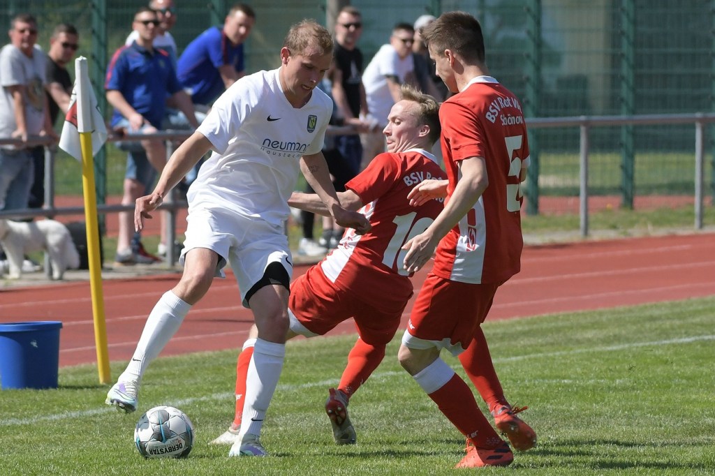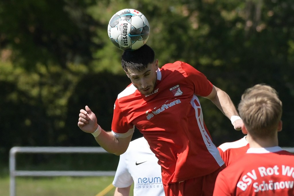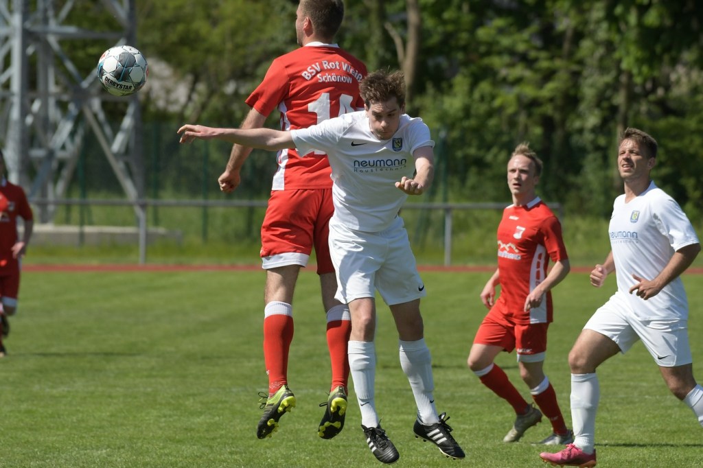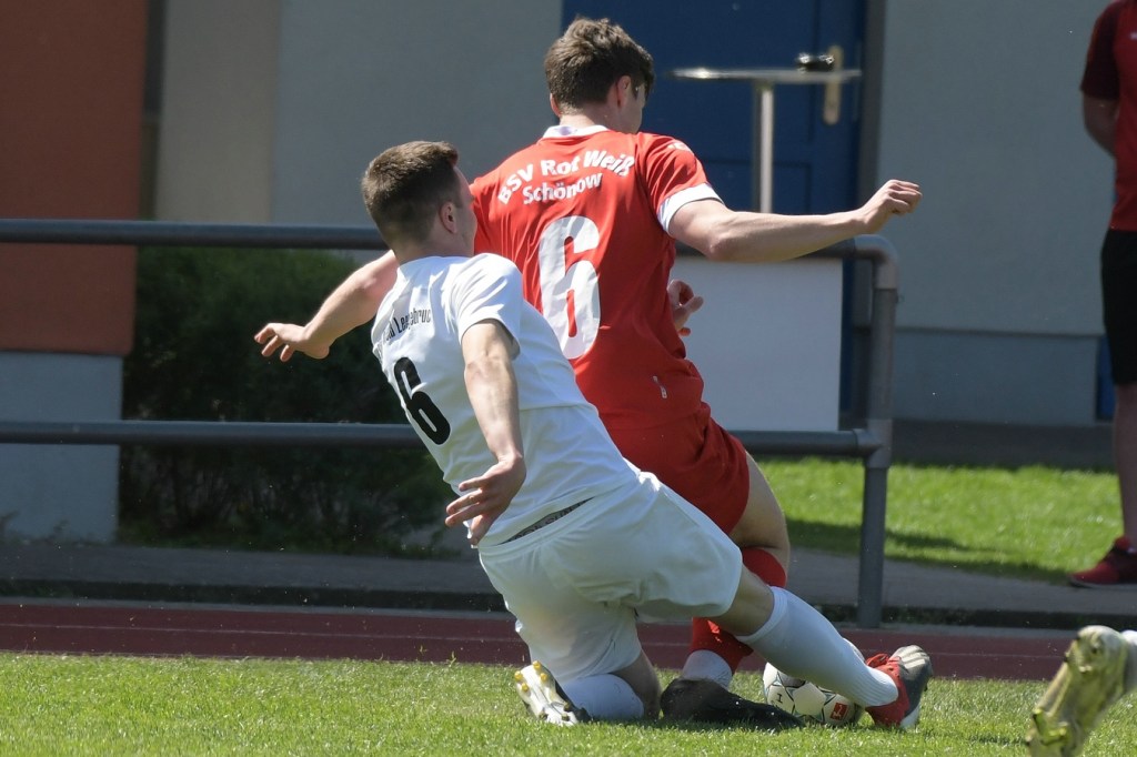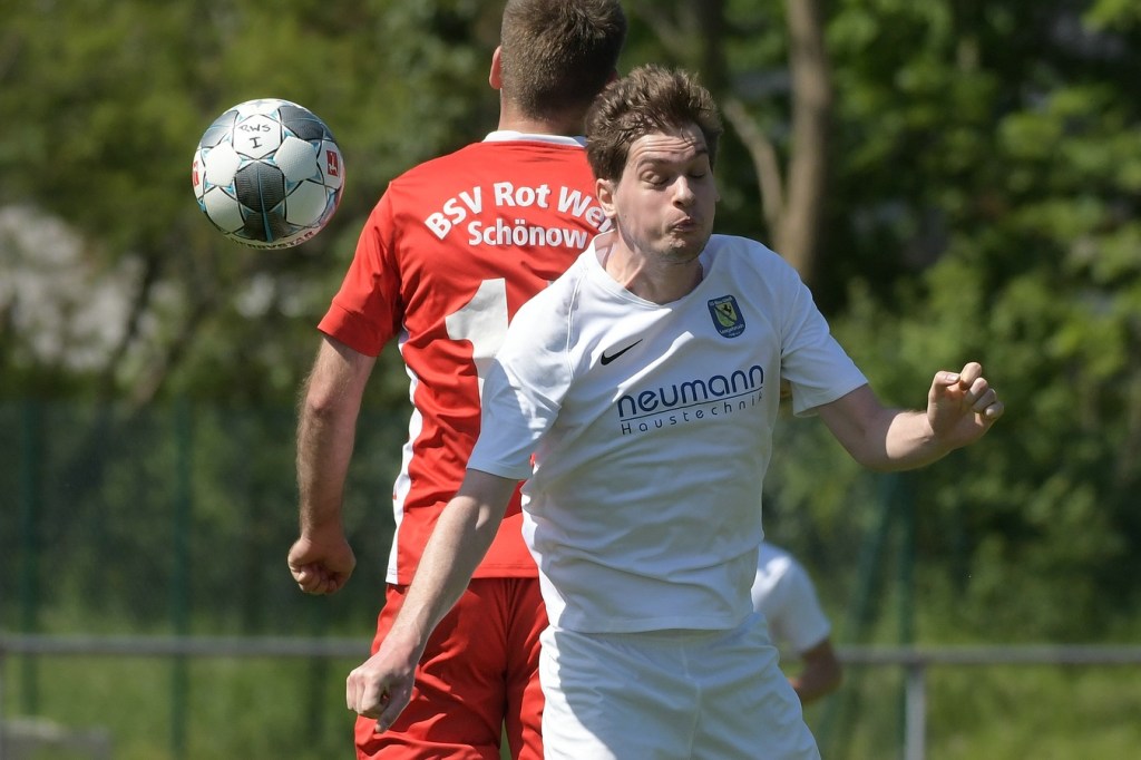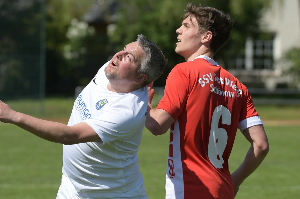 Es knisterte auf dem gut präparierten Rasen. Das Schönower Einschwören im Kreis wurde mit lautem Gebärden beendet, ehe es dann zum Anstoß ging. Intensität, Leidenschaft, Wille und Emotionen waren die Attribute, welcher der Partie den Stempel aufdrücken und das Ganze zum wirklichen Spitzenspiel machten. Dabei zeigte Rot-Weiß in der Anfangsphase die größeren Krallen und hatte mit der Mehrzahl an gewonnen Zweikämpfen so ein wenig die Oberhand im Mittelfeld übernommen. Mit der ersten Ecke für die Hausherren, aus der der Ball nach einem Kopfballduell ans linke Lattenkreuz prallte, war zumindest die Hoffnung gegeben, dass Tormöglichkeiten von dieser Qualität noch mehr auf die Tagesordnung hätten kommen können (4.). Doch leider kam es auf Schönower Seite nicht so. Leegebruch hingegen wirkte in der Anzahl der Abschlüsse etwas lebhafter, doch mehr als ein paar halbe Möglichkeiten sprangen dabei nicht heraus. Das Spiel war extrem intensiv, zwischen den Strafräumen wurde förmlich Gras gefressen, kein Halm preisgegeben und trotzdem fair miteinander umgegangen. Ein Konter in der 16. Minute, den Blau-Weiß über die linke Seite einleitete und daraus eine flache Eingabe in den Strafraum produzierte, wäre für Tim Matzat, wenn er den Ball richtig getroffen hätte, eine gute Möglichkeit gewesen. So musste sich Heimkeeper Hubertus Zschorlich nicht groß anstrengen, um die Kugel wegzufangen. Zur Mitte der Halbzeit kippte das Verhältnis der gewonnen Zweikämpfe in Gästerichtung, die nun ihrerseits ein wenig mehr Offensivkraft entwickeln konnten. Doch wie auch bei den Schönowern fehlte schlussendlich das Zählbare. Zwei Freistöße aus dem Linken Halbfeld, wo nicht ganz klar wurde, welche Absichten dahintersteckten, war die einzig zu erwähnenden Abschlüsse der Hausherren Richtung Halbzeitpfiff. Die Gäste hingegen blieben da durchaus gefährlicher. Nick Matzat bekam die Kugel nach einigem Hin und Her im Schönower Strafraum im Rückraum serviert, zog gleich ab und zwang Zschorlich schon mal sich etwas mehr in die Streckung zu begeben (28.). Als sich dann alle schon auf eine torlose Halbzeit eingestellt hatten, bekam Marcus Croonenbrock nach einem Einwurf mit mehreren Zwischenberührungen und Anspielversuchen den Ball aufgelegt. Sein verdeckter Schuss aus achtzehn Metern ließ alle Schönower Dämme brechen, nach dem das Spielgerat im rechten unteren Eck eingeschlagen hatte (44.). Da war es wieder, das berühmtberüchtigte psychologische Momentum kurz vor dem Pausentee, dass die einen positiv stimmt und den anderen einen Dämpfer versetzt.