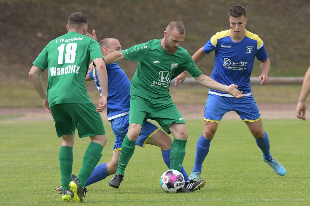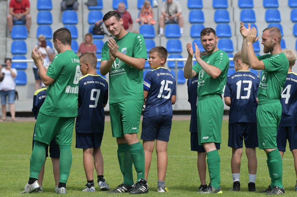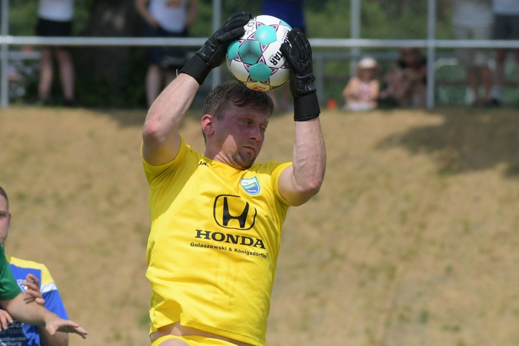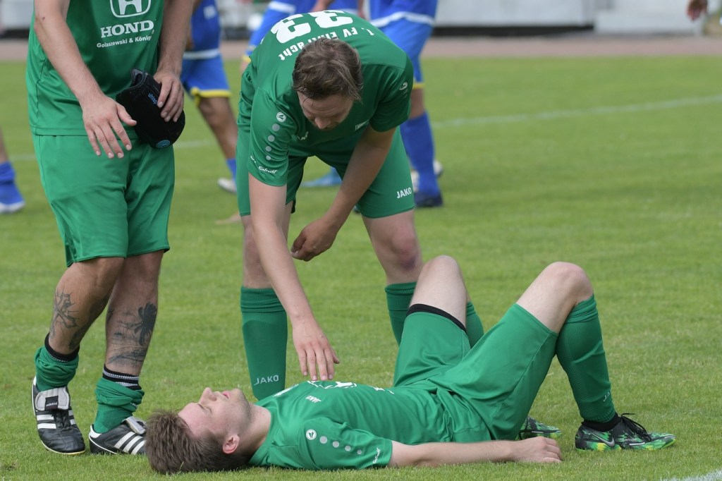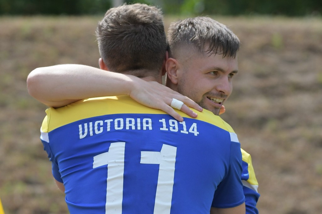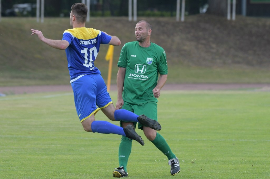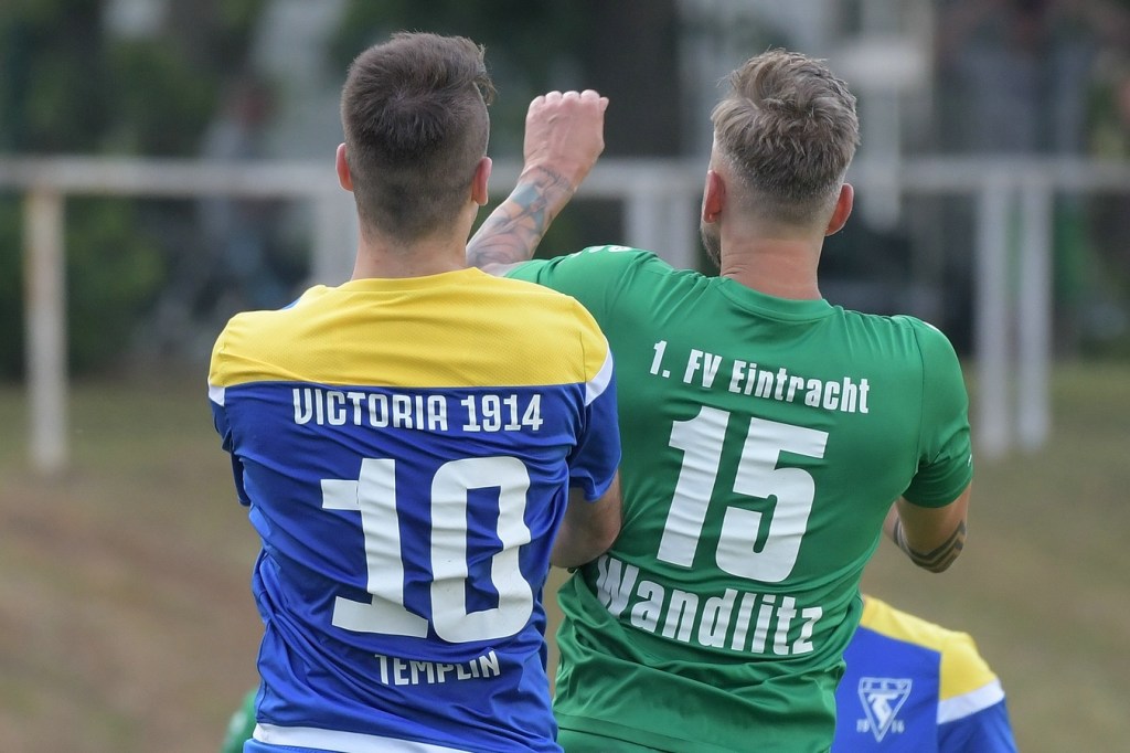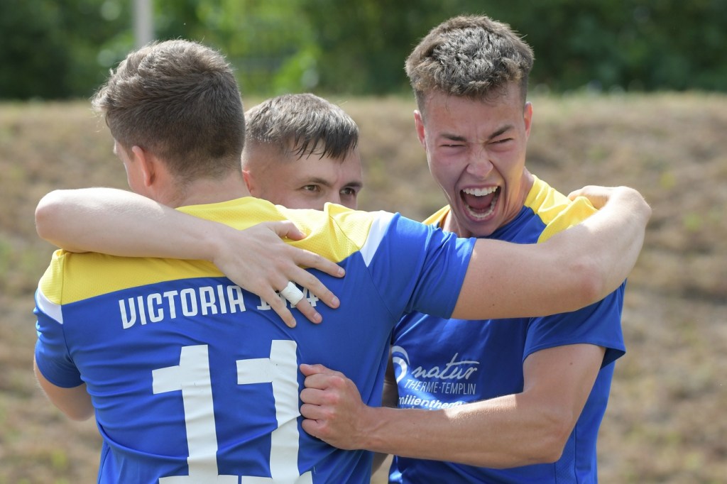 Unter den Augen der „Jungs von der Couch“ aus Zepernick begann die Partie, hitzebedingt und taktisch darauf sicherlich abgestimmt, relativ verhalten. Die Gäste, bei denen Paul Roller und Dennis Plaumann erst eine Viertelstunde vor Spielbeginn eintrudelten, formierten zwei Abwehrreihen, genau wie in der Vorwoche gegen Einheit Zepernick. Dies funktionierte wiederum recht gut, weil Victoria schon früh gezwungen wurde, Lösungen zu finden. Eine Maxime waren die lange Bälle, welche vornehmlich Mannschaftskapitän Johannes Collin auf den Weg brachte. Trotzdem hatte Wandlitz nach zwanzig Sekunden den ersten Abschluss zu verzeichnen, welchen Roman Schmidt doch recht eindeutig neben den Kasten setzte. Zwei Minuten später war dann die Heimelf dran und konnte aus diesem Angriff gleich ein paar Schlüsse für sich ziehen. Zum Einem zeigte sich die Gästeabwehr recht wackelig, wenn es mal schnell auf sie zurollte, zum anderen waren eigene Kollegen gefragt, die aus dem Rückraum abgewehrte Bälle platziert und mit Kraft aufs Wandlitzer Gehäuse bringen können. Im Letzteren probierte sich Lukas Trapp, dem der Ball an der Strafraumgrenze vor die Füße sprang und er diesen im Anschluss mit einem Hauch von Kläglichkeit neben das Tor jagte. In der 8. Minute dann eine Möglichkeit für Dennis Plaumann, doch auch sein Schuss nach einem abgewehrten Eckball flog weit über die Querlatte des Templiner Kastens. Victoria hatte nun die Spielkontrolle übernommen, zelebrierte weiter den „Kick and Rush-Stil“ und kam auch zu Möglichkeiten. Und wieder war es eine Flanke von der rechten Seite, mit im Anschluss klärenden Versuchen der Gäste das Spielgerät zu entfernen. Nutznießer dieses Tohuwabohu war Maciej Piotr Czyzewski, der kurz hinter dem Elfmeterpunkt geparkt und alle Möglichkeiten hatte, die frühe Führung zu erzielen. Doch sein Schuss verhungerte ein wenig und passierte die Torlinie neben dem Tor (11.). Dass Wandlitz sich als gute Gäste präsentierten, zeigte sich in der 15. Minute. Versuche einen Flankenball an der linken Strafraumgrenze zu klären, endeten mit einer Slapstick-Einlage und hoher unkontrollierter Ballweiterleitung Richtung eigenem Keeper. Maciej Piotr Czyzewski hatte in dieser Situation den richtigen Riecher. Er tauchte vollkommen frei im Strafraum auf, nahm die Kugel und schob sie am armen Michael Lehmann vorbei zum vielumjubelten 1:0. Dass dieses Tor den Aufstieg bedeuten würde, war zu diesem Zeitpunkt nicht zu erahnen. Gerade weil Victoria die Partie weitestgehend im Griff und im Nachgang auch Möglichkeiten hatte, nachzulegen, war an einer Veränderung der Kräfteverhältnisse kaum zu denken. Allein der Torschütze wäre mit mehr Konsequenz und Kaltschnäuzigkeit ein noch größerer Held geworden. Im Endeffekt schien der Truppe nun doch etwas die Nervosität auf die Füße zu fallen. Denn mit zunehmender Dauer erarbeitete sich Eintracht die Augenhöhe und zum Ende des ersten Durchganges auch die Oberhand. Doch mit den Chancen blieb es Mangelware, mit viel gutem Willen konnte man die wenigen Möglichkeiten als Halbchancen bezeichnen. Auch die Heimelf funktionierte nicht mehr so richtig. Die langen Bälle verpufften, weil diese nun zum Teil unplatziert waren und ganz nebenbei die Stürmer in unnötige Sprintduelle verwickelten, welche bei den vorherrschenden klimatischen Bedingungen als auch nicht sinnvoll und effektiv erschienen. Zwar zuckte die Offensiv-Maschinerie der Hausherren sporadisch, ab wirklich zwingend wurde es nicht. Die einzig noch nennenswerte Möglichkeit vor dem Pausenpfiff hatte Eintrachts Adrian Fischer, der aus der zweiten Reihe abzog und Heim-Torsteher Philipp Leupold dazu zwang, sein ganzes Können aufzubringen (31.).
