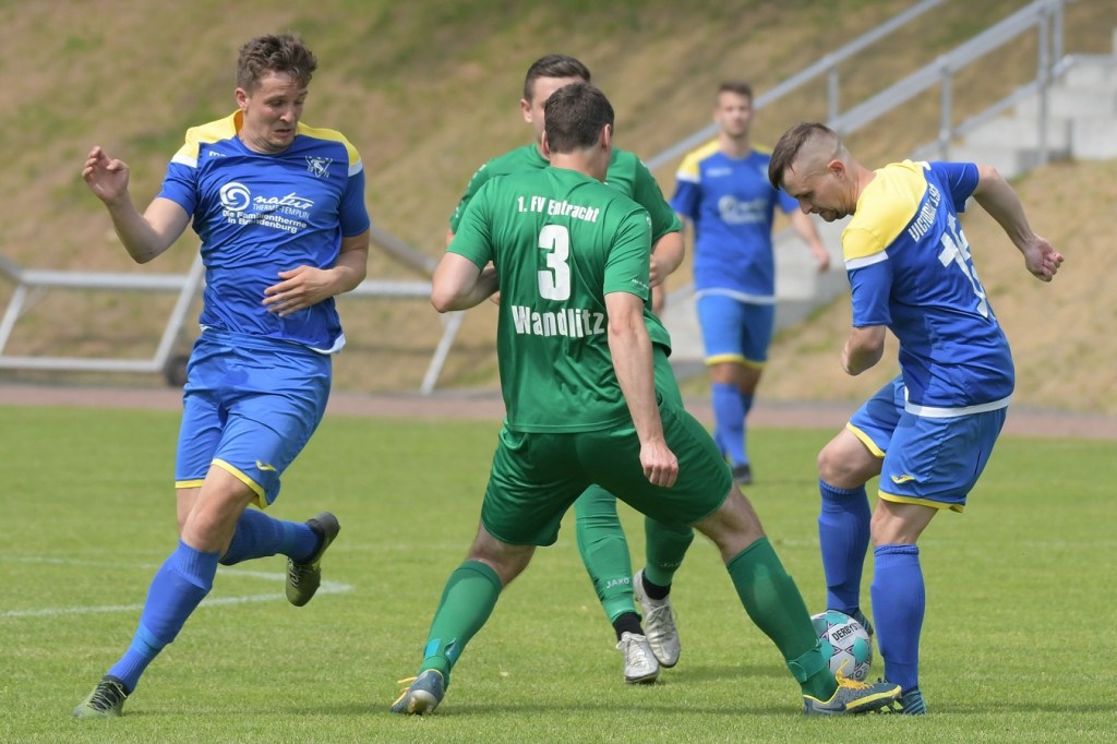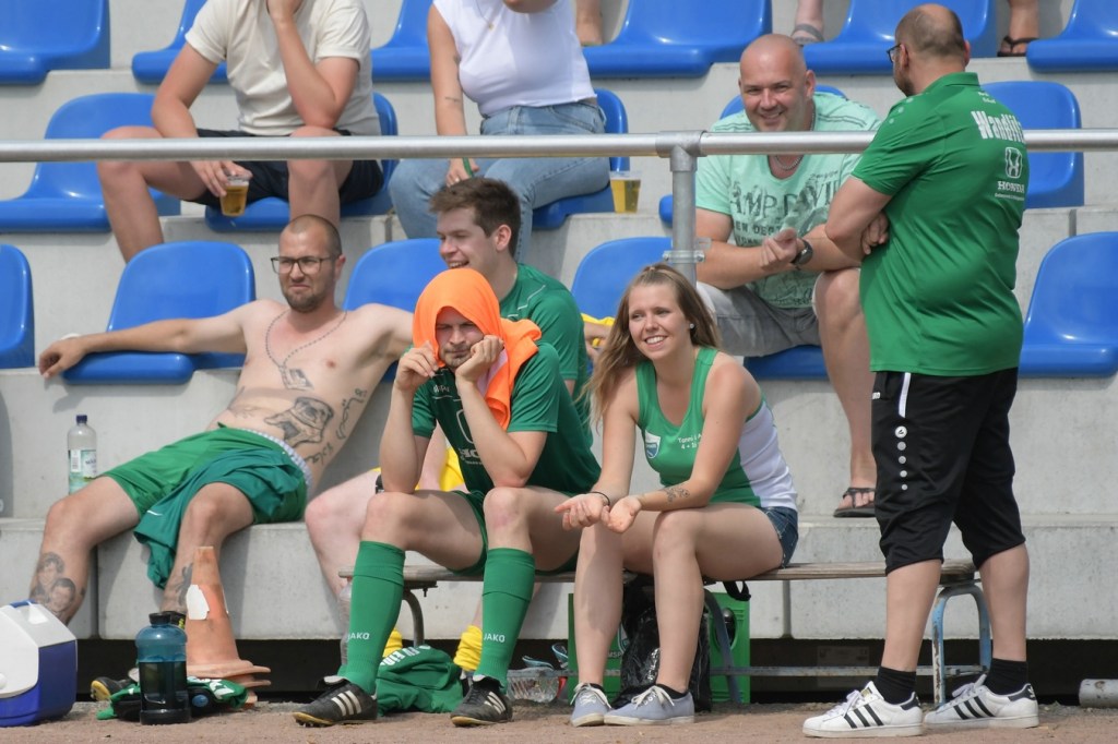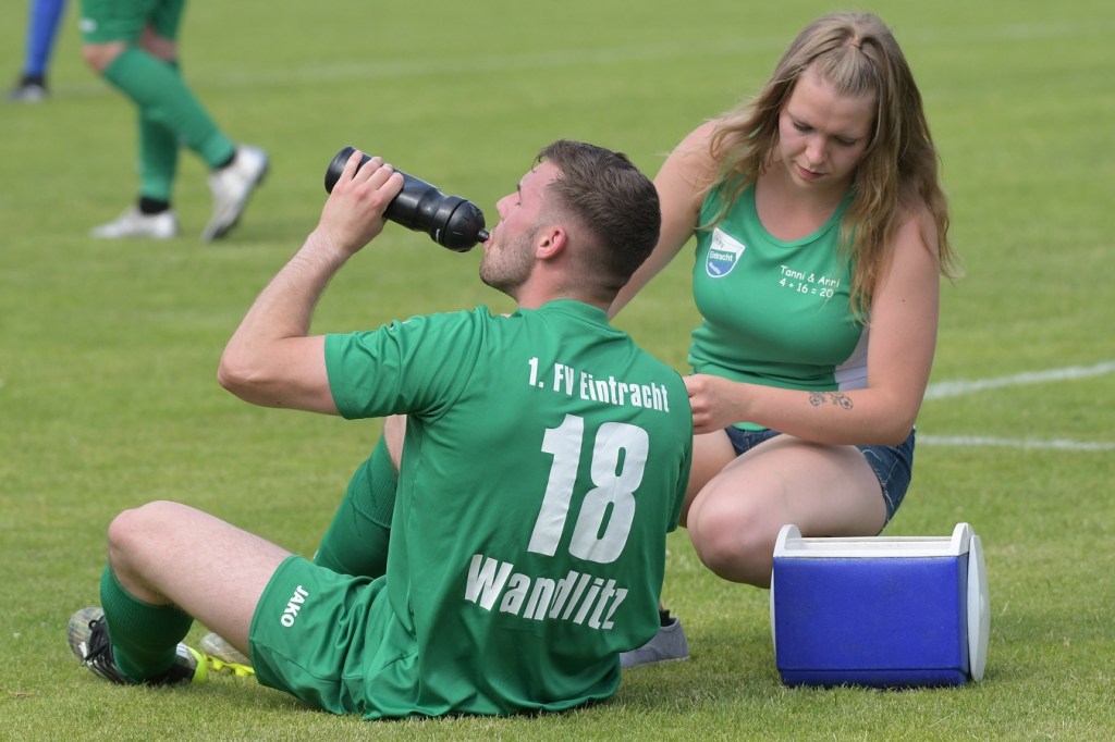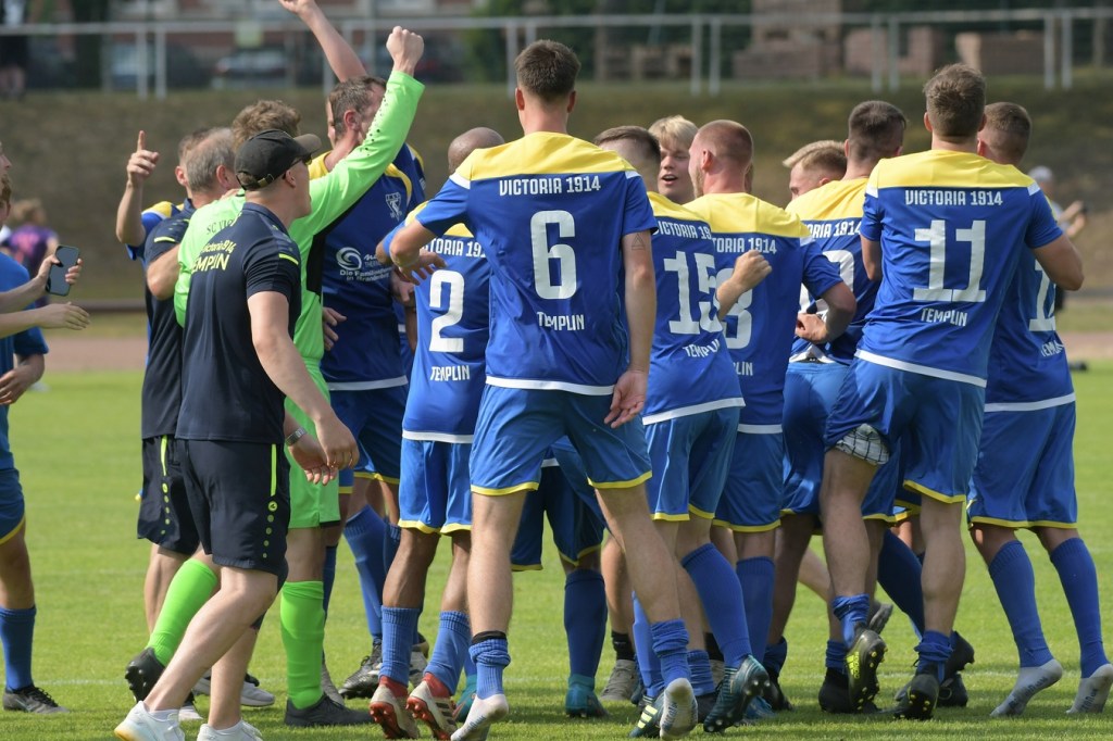 Mit der Erkenntnis noch im Spiel und mit Paul Rollers Einwechslung im Bereich Attacke noch flexibler aufgestellt zu sein, begann Eintracht die zweite Halbzeit unter dem Motto „Aufholjagd“. Doch die Hitze machte noch mehr zu schaffen und nagte an der Kondition und vor allem auch an der Konzentration. Auch Victoria blieb in seinen Reihen davon nicht unberührt. In den Halbzeitgesprächen fiel schon das Wort vom „Grotten-Kick“ und man war davon, sicherlich nicht so extrem ausgedrückt, nicht weit entfernt. Spannend war es allemal, denn Wandlitz gab nicht auf. Auch nicht, nach dem Dennis Plaumann mit einem absichtlichen Handspiel im Mittelfeld, vorverwarnt, per Ampelkarte das Feld räumen musste (68.). Die Partie schleppte sich und Victoria schob die abnehmende Zeit mit dem knappen Vorsprung vor sich her. So motivierte der Stadionsprecher den Anhang und die eigenen Jungs mit der turnusmäßigen Angabe der verbleibenden Spielzeit. Schlussendlich erlöste Referee Andre Schuler die Probanden und löste damit alles aus, was für so einen Aufstieg in der Planung war. Pyro, Freudentänze, Siegerehrung und Feierlichkeiten.
