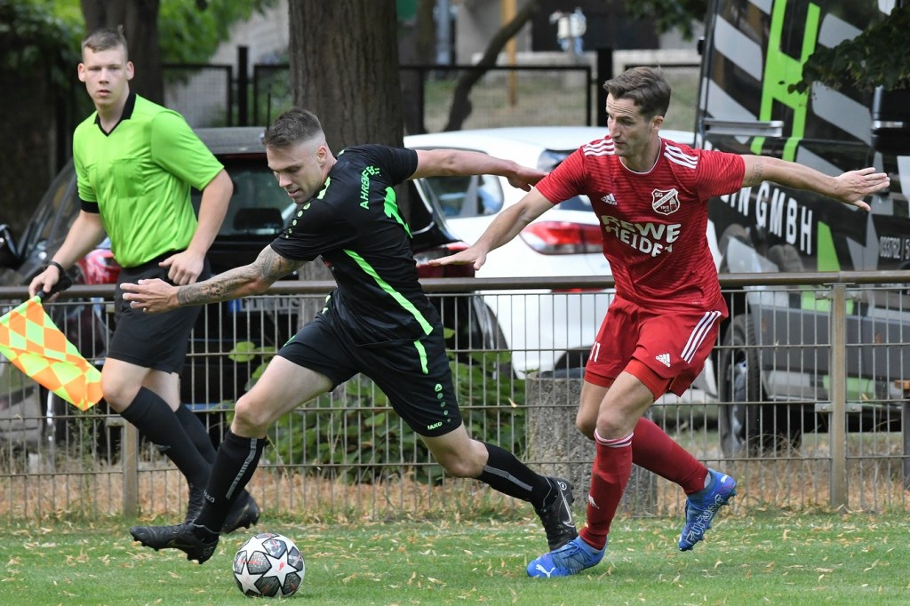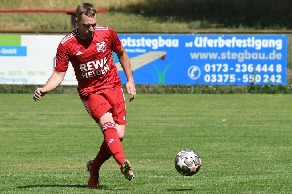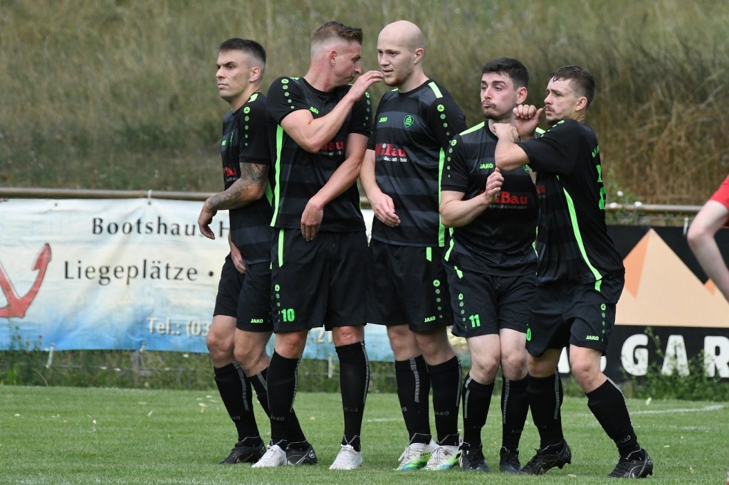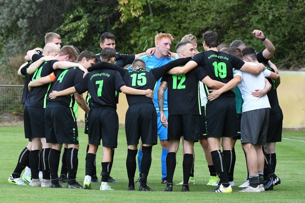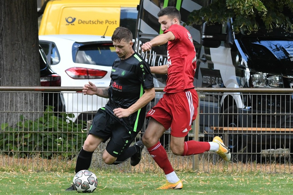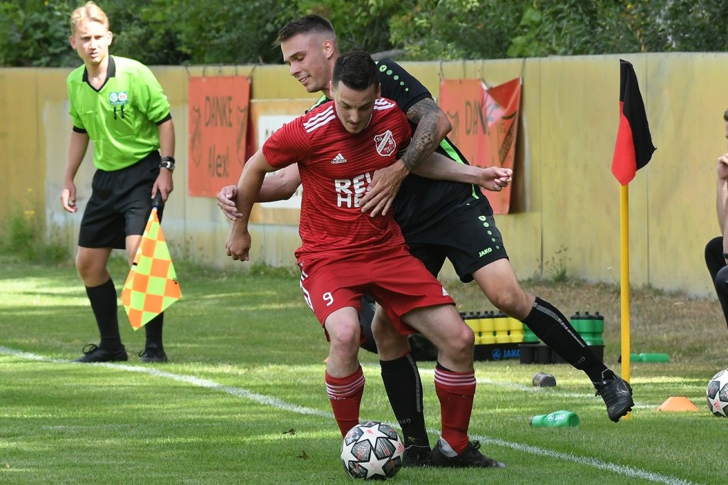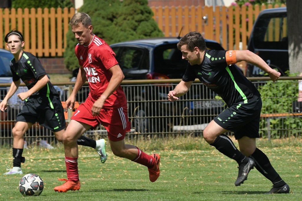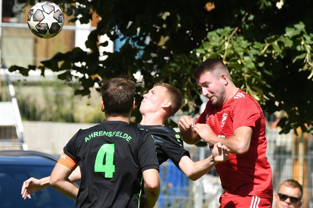 Personaltechnisch konnten beide Trainer nicht aus dem Vollen schöpfen, bei den Gästen fehlten sogar elf Aktive. „Es waren schon einige wichtige Stammkräfte nicht dabei“, sagte Ahrensfeldes Trainer Daniel Lüß und zeigte sich trotzdem mit dem Auftritt seiner Jungs sehr zufrieden. Besonders die Anfangsminuten zeigte Ahrensfelde Spiellaune und bewegte sich mit der Heimtruppe auf Augenhöhe. Es war intensiv, aber auch hektisch. Florian Redder setzte als Erster die Gästeflagge mit einer Möglichkeit in der 3. Minute, doch sein Schuss verunglückte aus guter Position dermaßen, dass aus diesem schlussendlich nur ein Einwurf für die Heimtruppe auf die Rechnung kam. Niederlehme brauchte etwas länger für die erste Torgefahr, welche Niklas Hentschel mit einem Geschoss aus der zweiten Reihe für sich verbuchte (8.). In der Folge wurde das Mittel der Abschlüsse aus dem Rückraum so ein wenig das Probateste. Nach gut zehn Minuten übernahm das Landesklassenteam zusehends die Spielkontrolle, drängte Grün-Weiss immer mehr in deren Hälfte und kam auch zu guten Möglichkeiten. Die größte Chance in dieser Phase hatte „k.A.“ in der 15. Minute, als nach einer Ecke die Abwehr von Gäste-Keeper Patrick Hilliger nicht sehr sattelfest wirkte und der Ball „k.A.“ direkt vor die Füße sprang. Mit allen Freiheiten ausgestattet, schaufelte er die Kugel Richtung Tor, aber nicht platziert genug, sodass Marcel Riemer den Ball auf der Torlinie stehend per Kopf aus der Gefahrenzone bugsieren konnte. Die SG drängelte und hatte genug Möglichkeiten, das Zählwerk auf mindestens 3:0 zu stellen. „Das ist unser Problem, die schlechte Chancenverwertung. In der vergangenen Saison waren wir lange im Abstiegskampf, das war auch eine der Ursachen dafür“, hatte Heim-Trainer Stephan Rosenberg im Nachgespräch den genannten Umstand moniert, ansonsten aber eine starke Halbzeit seiner Jungs gesehen. Ahrensfelde blieb nicht chancenlos, hatte in einer Situation aber Pech, dass Andrew Neumann sich von der rechten Seite kommend vor der Strafraumgrenze irgendwie versuchte eine Schussposition für den rechten Fuß zu finden, dies ihm aber nicht gelang (18.). Die Druckphase der Hausherren mit den vielen guten Möglichkeiten überstand die Brandenburgliga-Reserve schadlos und kam nach einer halben Stunde wieder mehr in die Entlastung. Justin Lauterbach hatte sich in der 38. Minute an der linken Eckfahne festgesetzt und den Ball, trotz einiger Versuche des „Abluchsens“, behauptet und straff geflankt. Marcel Riemer war im Anschluss am kurzen Pfosten mit der Stirn zur Stelle und verfehlte den Kasten letztendlich nur knapp.