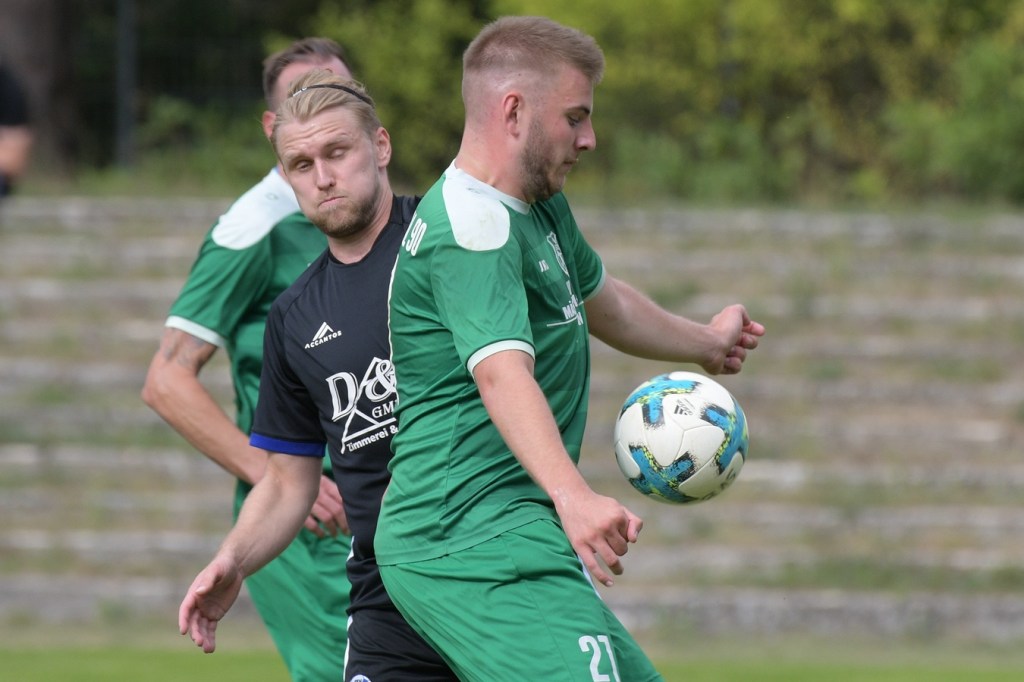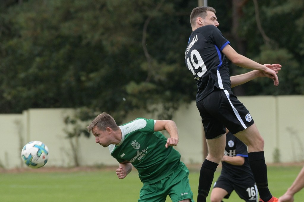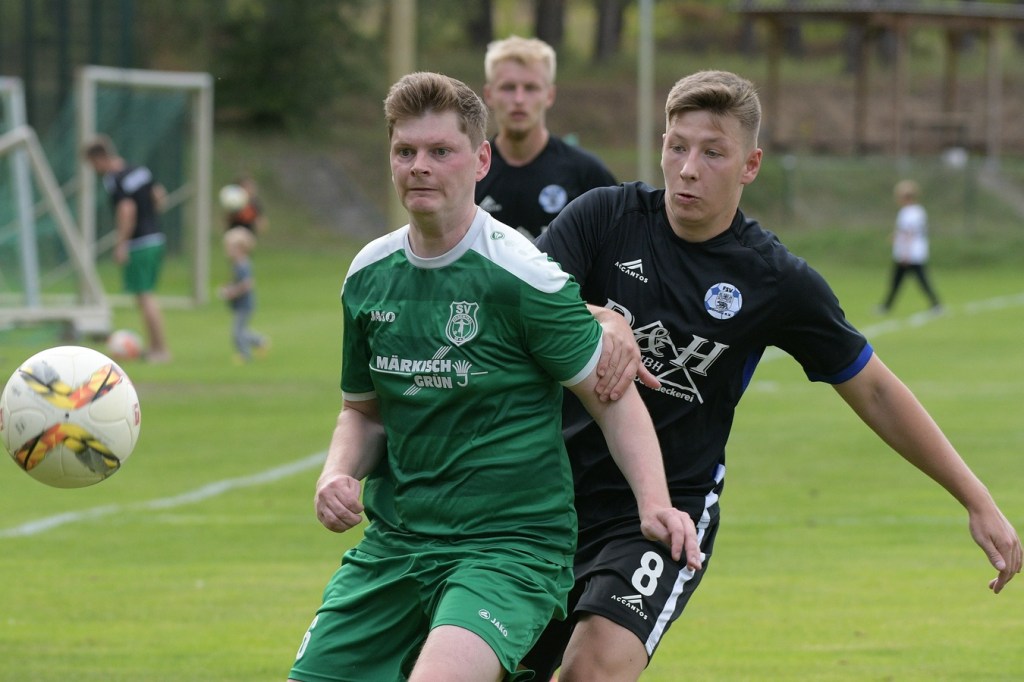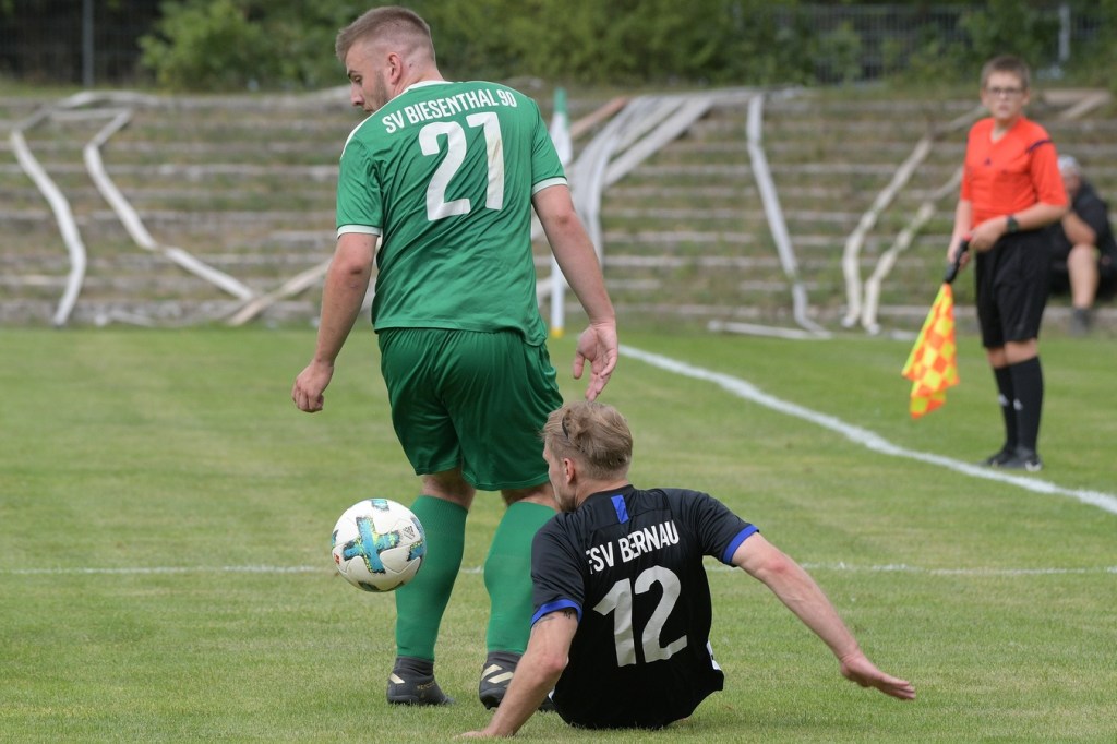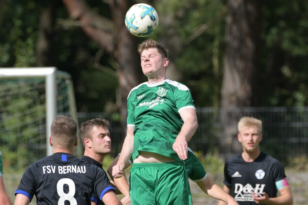 In dieser genannten Anfangsphase zeigte sich die Heimtruppe extrem nervös, verstolperte die eigenen Angriffsbemühungen, präsentierte sich im Abwehrverhalten recht fehlerhaft und musste in der 5. Minute das Spielgerät zum ersten Mal aus dem eigenen Netz holen. Romano Fieting bekam den Ball sauber aufgelegt, zog kurz hinter der linken Strafraumgrenze ab und ließ mit seinem strammen Geschoss Heimkeeper Paul Sternbeck keine Chance. Keine zwei Minuten später kam auch die Spielgemeinschaft zum ersten Abschluss, den Dennis Sommer nach einer Flanke von der linken Seite und Kopfballverlängerung dann aus spitzem Winkel rechts am Tor vorbei jagte. Die frühe Führung spielte der Landesliga-Reserve natürlich scharf in die Karten. In der Folge brannte es einige Male im Biesenthal/Marienwerder-Strafraum lichterloh. Zu nennen ist die Doppelchance von Piet Dübel, der seine Schuss-Möglichkeit verstolperte und Jan Markhoff, welcher an Sternbeck scheiterte (11.). Aber auch die beiden Chancen durch Anton Ollesch, dessen direkt getretener Freistoß wiederum von Sternbeck entschärft wurde und der Nachschuss von Cedric Himm, welcher schon recht kläglich weit neben dem Tor im Aus landete (15.), hätten eine positive Ergebniskorrektur erzeugen können. Besser machte es dann Max Schulz sechzig Sekunden später. Dieser zeigte sich hellwach als er in einen verhungernden SpG-Pass hinein sprintete, in Stürmermanier sich den Ball zurechtlegte und unhaltbar einnetzte. Von den Hausherren war in dieser Phase offensiv rein gar nichts zu sehen. Bernau offenbarte gerade im Spielverständnis, im Kampf gegen den Ball und in der Qualität einen so nicht zu erwartenden Ligaunterschied. Doch mit zunehmender Dauer verflog dieser positive Nimbus, was die Heimmannschaft immer mehr auf den Plan brachte. Nach gut einer halben Stunde war der Unterschied wettgemacht. Die Gefühlswelt des Bernauer Übungsleiters, inklusive einer Vorahnung, wurde von seinen Jungs hart auf die Probe gestellt. Seine Intuition wurde Realität als Jompe Lischewski aus neunzehn Metern abzog und der Ball sehenswert im Gästekasten einschlug (37.). Bernau wackelte und schaffte es kaum noch in die Entlastung. Die Defensivabteilung fing auch an die Bälle aus der eigenen Hälfte im Sinne von Befreiungsschlägen herauszubolzen und konnte von Glück reden, dass Biesenthal/Marienwerder nur noch zu Halbchancen kam und der Treffer von Kevin Brömer wegen einer Abseitsstellung keine Anerkennung fand (40.).