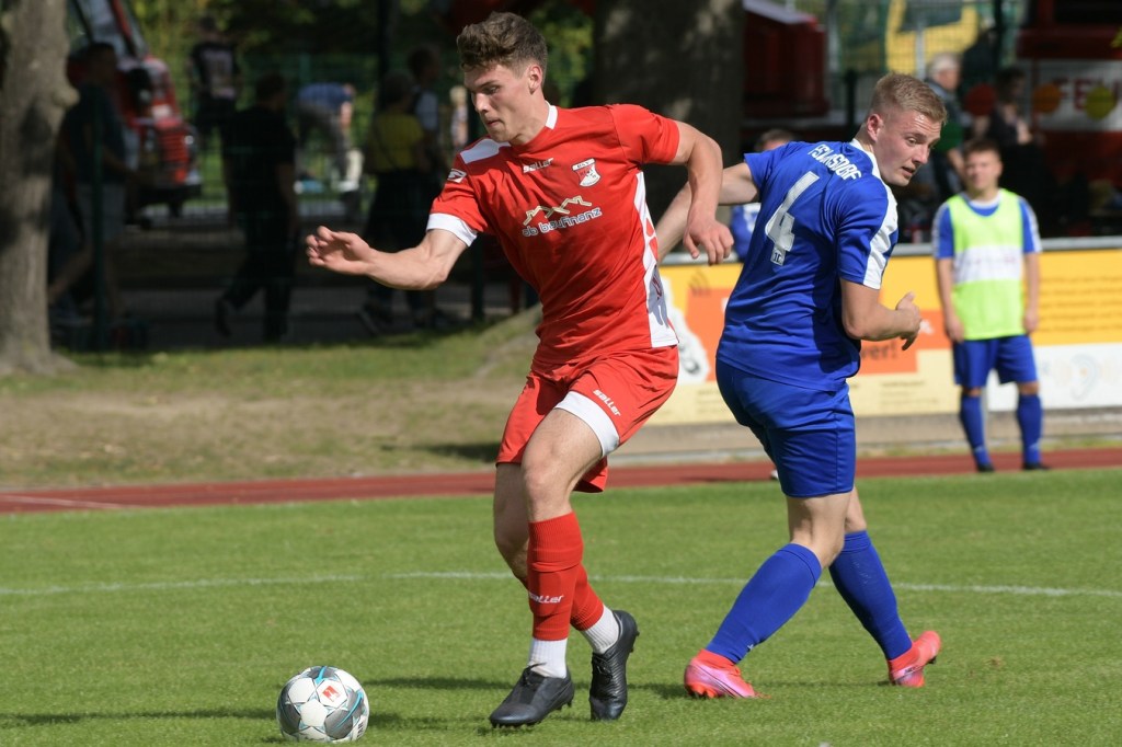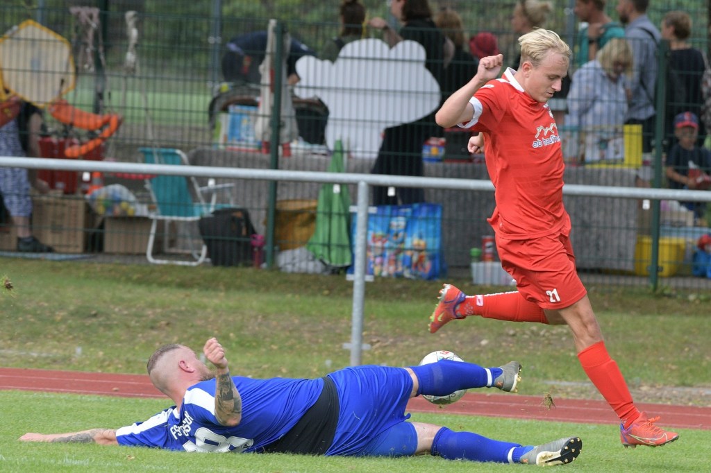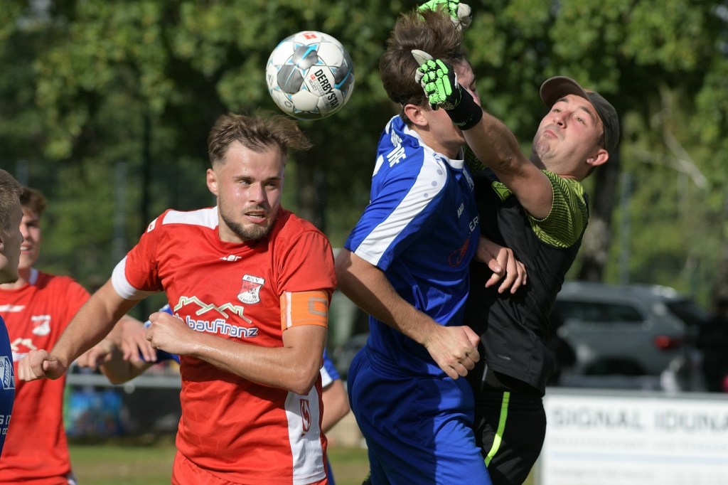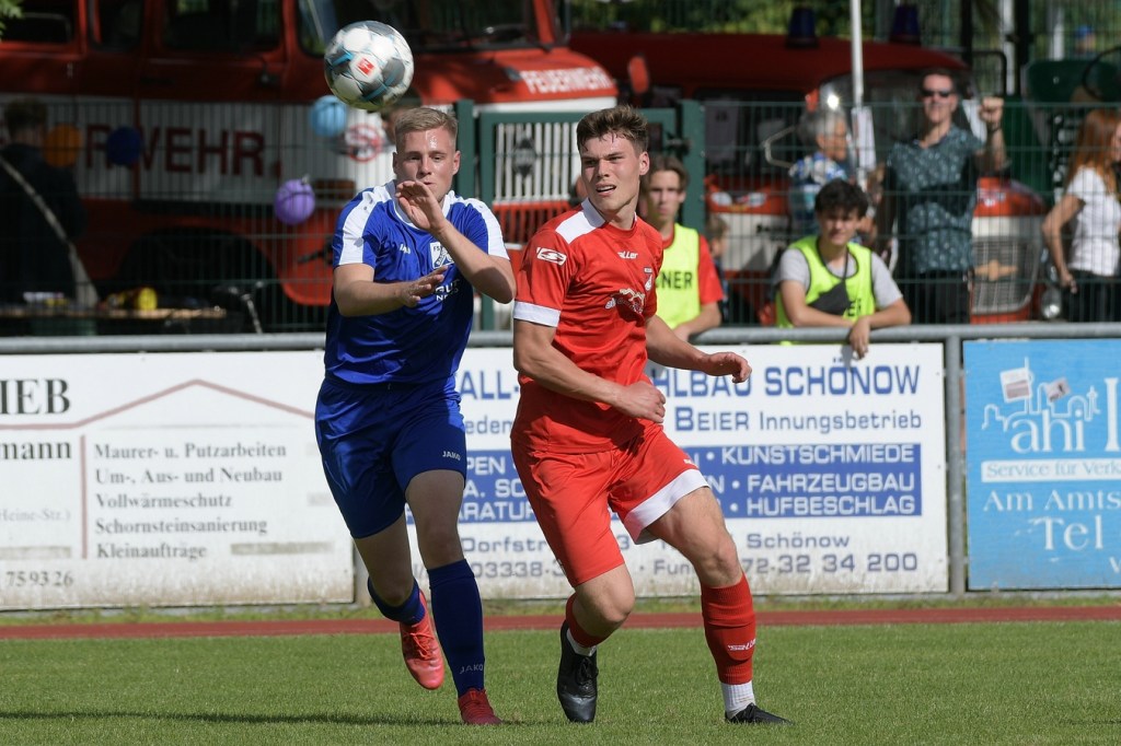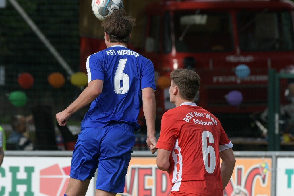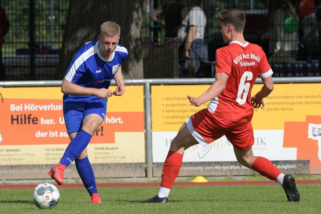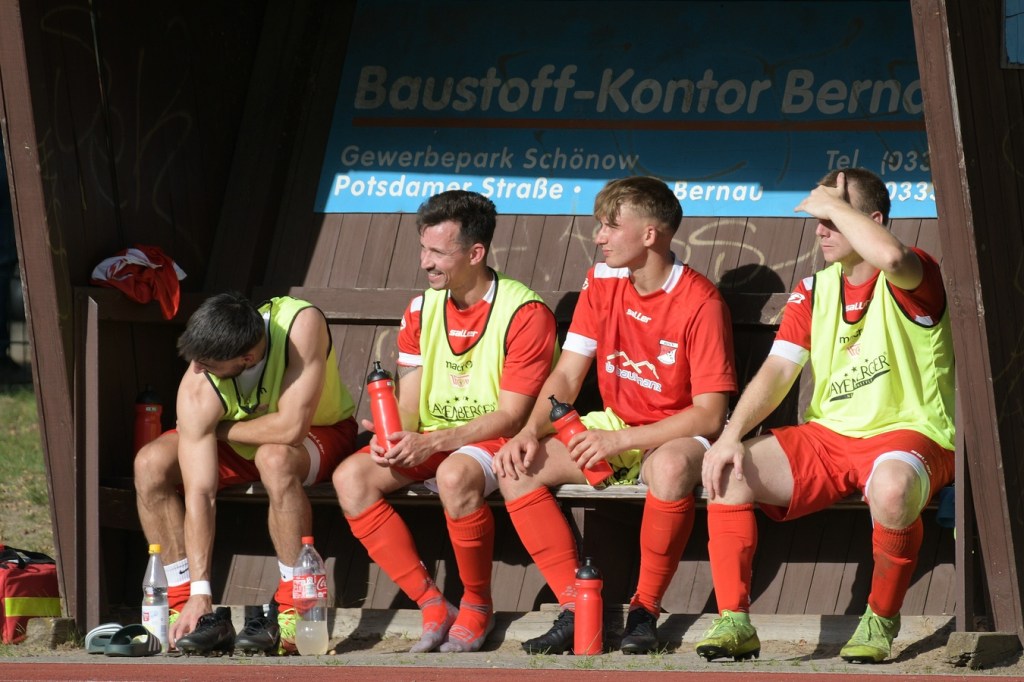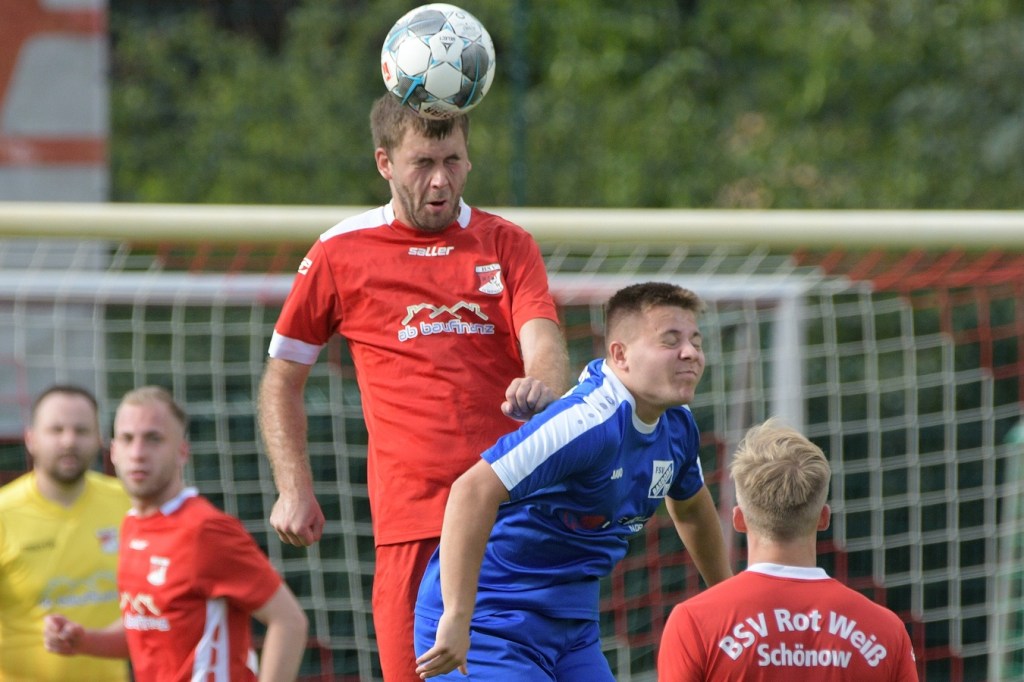Heidefest in Schönow rund um die Sportanlage der BSV Rot-Weiß, der Rahmen für ein Niederbarnim-Derby war damit gesetzt. Doch so richtige Festtagsstimmung schwappte nicht in die Zuschauerreihen. Allein schon der Blick in die Mannschaftsaufstellung der Gäste ließ nicht Gutes erahnen. Ganze zwölf Aktive wurden dort aufgeführt, was einem schon das Wort „Rumpfelf“ in die Unterhaltung trieb. Gäste-Co-Trainer Hartmut Kregelin, der seinen Chef Dietmar Kallweit urlaubsbedingt vertrat, hatte dafür die passende Erklärung im Vorgespräch parat. „Wir haben sechs Bundespolizisten in unseren Reihen, welche auch Stammspieler sind, die heute Dienst schieben müssen und uns deshalb schmerzlich fehlen. Zusätzlich kommen auch noch einige zusammen, die privat verhindert sind. Dann spielt heute auch noch unsere Zweite, auf die wir auch nicht zurückgreifen können. Damit müssen wir irgendwie klarkommen. Die Jungs sind aber motiviert, mal schauen was draus wird.“