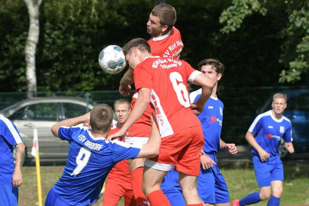 Doch seine Hoffnung, die Partie lange offen zu halten, wurde in der 3. Minute schon begraben. Nachdem Maximilian Bachnick sechzig Sekunden vorher an „Man of the Match“, Gäste-Torsteher Tibor Kreiger, gescheitert war, machte er es in dieser nächsten Situation besser. Den Durchstecker von Tobias Münchberg verwertete er vollkommen kompromisslos zur frühen Führung. Basdorf präsentierte sich aber trotz des personellen Notumstandes keineswegs geschockt. Engagiert arbeitete die Truppe weiter, so wie man es von Beginn an sichtbar auf der Agenda hatte. „Wir hatten heute einige junge Spieler auf dem Platz, denen noch etwas die Erfahrung fehlt. Die Abstände zu den Gegenspielern waren einfach zu groß, sodass Schönow seine volle Qualität ausspielen konnte“, war die Erklärung von Kregelin für die zu überstehenden Druckphasen der Hausherren. Denn Rot-Weiß machte in der Folgezeit schon ganz schön „Bambule“. Offenbarte dabei aber eine nicht unbekannte und schon länger im Rucksack verstaute Abschlussschwäche. Vor allem Bachnick und auch seine Kollegen Münchberg, Murla und Molkentin stellten sich in die Reihe der „Chancen-Auslasser“. Hinzukam, dass im Tor der Gäste ein Keeper aufgestellt war, der fast alles richtig machte. Schönow kratze an den Torerfolgen, zeigte aber noch einen Mangel, dass gut vorbereitete Halbchancen nicht konsequent vergoldet wurden. Basdorf hatte die Anfangsviertelstunde ohne weitere Kratzer gut überstanden und wurde nun gegen etwas nachlassende Hausherren mutiger. Jubeln hätten die Gäste in der 20. Minute können. Dan Steinhagen, eigentlich Stammspieler der Basdorfer Reserve, kam im rechten Strafraum nach einem Freistoß zum Abschluss und schien dabei schon etwas überrascht zu sein, so frei abschließen zu können. Letztendlich brachte er die Kugel nicht aufs Tor, sondern links neben den Kasten. Das fleißige Auslassen der Torerfolge der Heim-Offensive setzte sich weiter fort. Und wenn sich Dan Steinhagen und Michael Niklas Roskosch im linken Strafraum nach einem Anspiel nicht gegenseitig behindert hätten, wäre ein Eintrag zum 1:1 im Spielformular durchaus möglich gewesen (24.). Mit dem 2:0 nach neunundzwanzig Minuten untermauerte der BSV dann seinen bis dato überlegenen Auftritt. Torschütze wurde Emurla Musa, der Nutznießer eines wiederholt missglückten Abschlusses von Maximilian Bachnick wurde. Wieder hatte Kreiger mit toller Parade den Versuch vereitelt, war dann aber gegen den Flachschuss von Murla aus gut achtzehn Metern machtlos (29.). Das Chaos, welches Stefan Schulz mit seinem „Durchtanker“ zur rechten Grundlinie und anschließendem Pass in den Rückraum verursachte, passte irgendwie in die Labor-Welt der Hausherren. Mehrere Versuche, den Ball im Basdorfer Tor unterzubringen, scheiterten zum Teil an Überhast. Schlussendlich war es wieder Schulz, der mit einem Schlenzer die Kugel dann an den linken Außenposten setzte (33.). Die letzte nennenswerte Möglichkeit in Halbzeit eins konnten die Gäste für sich notieren. Max Prollius hatte nach einem langen Einwurf direkt abgezogen und dann Pech, dass Stefan Schulz seinen Fuß dazwischen bekam und damit einen möglichen Einschlag verhinderte (43.).