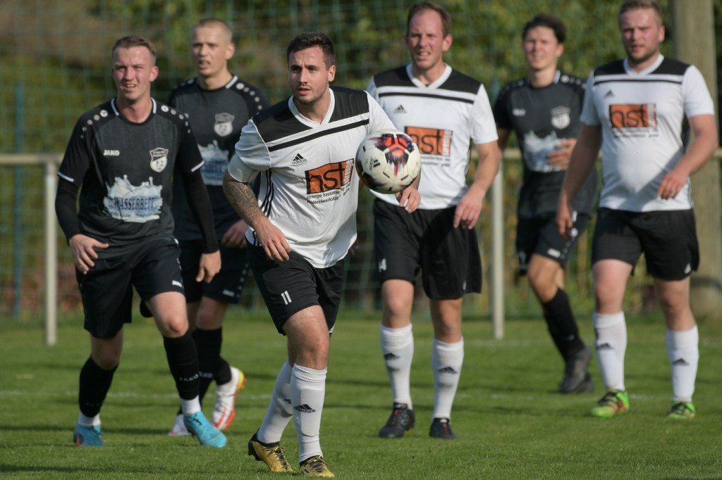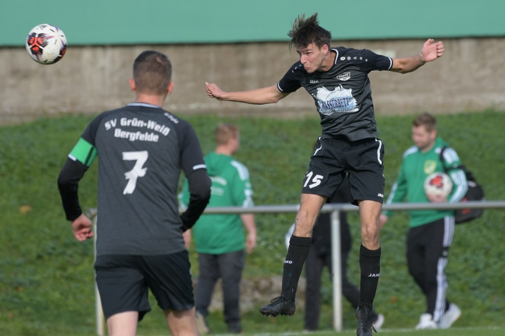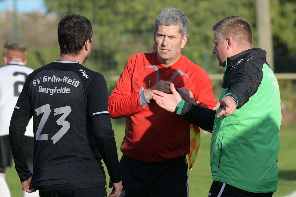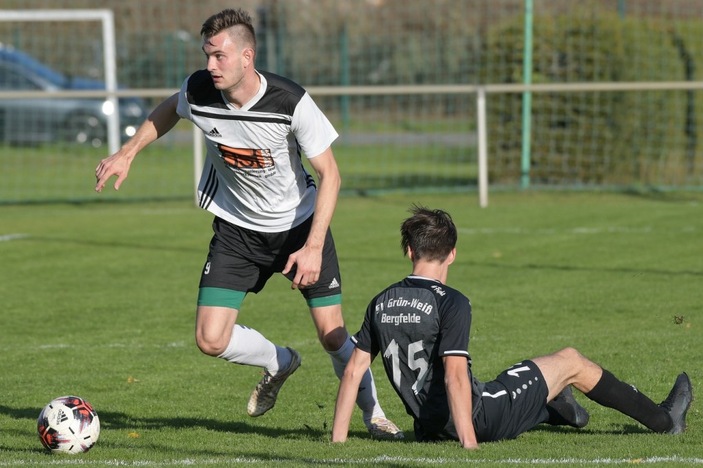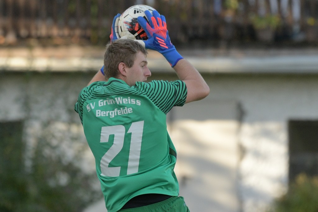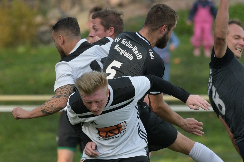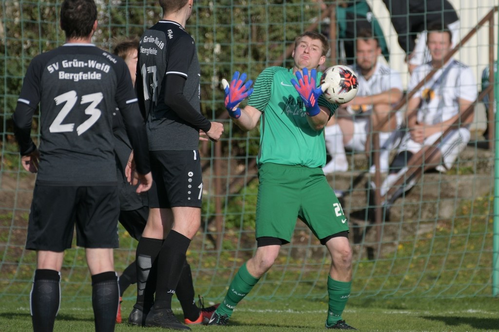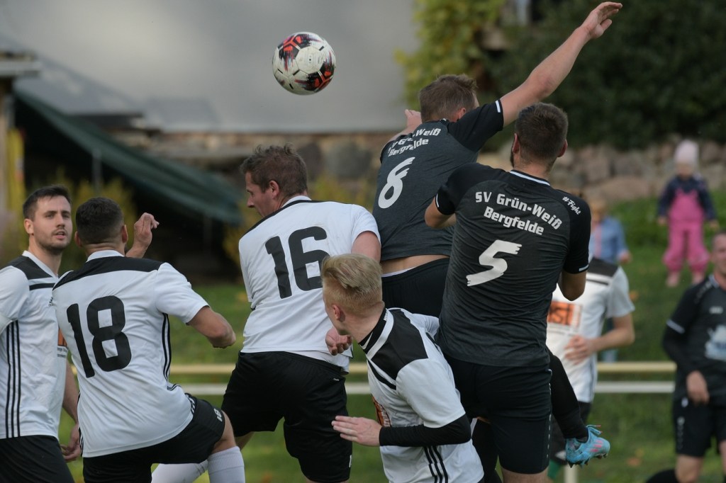 Wenn man der Qualität der Anfangsphase ein Prädikat verabreichen wollte, wäre man sicherlich in der unteren Schublade fündig geworden. Bei bestem Herbstwetter und einem Grün, welches zu einem Kampfspiel einlud, begegneten sich zwei Teams, die nur schwer in die Partie kamen. Vor allem den Gästen gelang so gut wie gar nichts. Für die SpG hätte dieser Umstand sicherlich förderlich sein können, aber auch denen fehlten die klaren Ideen und eine zielstrebige Umsetzung. So bestimmten sporadisch angesetzte „Fifty-Fifty-Chancen“ die Szenerie. Ein Einwurf, welcher im Anschluss in eine Flanke umgewandelt wurde, bereitete das 1:0 vor. Der Ball wurde abgewehrt und landete dann bei Johannes Bester, der sofort abzog und die Kugel abgefälscht im Gäste-Kasten unterbrachte (9.). Die Tafel war nun bereitet, um der Partie den endgültigen Anschub zu geben. Bergfelde nahm diese Aufforderung an, arbeitete sich immer mehr ins Spiel und kam jetzt auch verstärkt zu Möglichkeiten. Erst war es ein Freistoß, der zwar platziert, aber ohne Schmackes in den Armen von Torwart-Oldie Olaf Pospieszny landete (12.), dann eine Flanke mit anschließendem Kopfball durch den baumlangen Sören Paul, der ebenfalls keine große Gefahr ausstrahlte (15.). Für Lichterfelde/Finow organisierte Grün-Weiß-Keeper Florian Julius Radtke eine Möglichkeit, als er in der Spieleröffnung zögerte und den heransprintenden Bester anschoss und Glück hatte, nicht zum zweiten Mal hinter sich greifen zu müssen (14.). Das Spiel beider Teams war schon sehr fehlerbehaftet. Diagonalbälle ohne Präzision, eroberte Bälle wurden postwendend zurückgegeben und Unkonzentriertheiten im Spielaufbau ließen die Begegnung verkrampft und zerfahren wirken. Auch Versuche aus der zweiten Reihe verpufften in den Fangzäunen hinter den Toren oder in den Armen der Torsteher. Trotzdem wurde es intensiver, weil Grün-Weiß gerade im Mittelfeld kämpferisch gut dagegenhielt. Ein Schuss aus der zweiten Reihe wurde in der 27. Minute für Olaf Pospieszny zum Problem. Dieser setzte kurz vor ihm auf, sodass er den Ball recht unglücklich prallen lassen musste. Niklas Kohl hatte spekuliert, gewann sein Laufduell und hatte den Nachschuss unhaltbar im Netz zum 1:1 untergebracht. Der Ausgleich beflügelte die Gäste. Ein ungeahndetes Foulspiel gegen die SpG eröffnete per flachem Anspiel Paul Becker eine hundertprozentige Chance. Doch versagtem ihm die Nerven, als er vollkommen frei den Ball neben das Tor setzte (31.). Der Treffer zum 1:2 durch Sören Paul brachte Lichterfelde/Finow noch mehr ins Wanken. Paul stieg bei einem Eckball am höchsten und nagelte das Spielgerät mit der Stirn ebenfalls unhaltbar in die Maschen (32.). Grün-Weiß blieb am Drücker und hatte noch einige Möglichkeiten, das eigene Zählwerk höher zu drehen. Bedanken konnte sich die Heimelf letztendlich bei ihrem Keeper, der zweimal überragend regierte und damit seine Kollegen weiterhin in der Partie hielt. Eine langer Diagonalball in den Gästestrafraum endete mit einem Fauxpas von Torwart Radtke. Er konnte die Kugel nicht kontrollieren, ließ sie fallen, versuchte mehrmals nachzufassen, musste aber schlussendlich hinterherschauen, wie das Spielgerät von Henning Peach über die Linie gedrückt wurde (38.). Die Heimelf hatte ausgeglichen und in den Schlussminuten bis zum Halbzeitpfiff die Druckphase der Gäste abgeschüttelt. In der 43. Minute dann ein großes Gestochere im Strafraum der Bergfelder, welches mit einem klaren Foulspiel an Tobias Köpenick endete. Schiedsrichter Tommy Jäkel zögerte keine Sekunde, um auf den ominösen Punkt zu zeigen. Frank Niemann übernahm die Verantwortung und stellte mit dem 3:2 die erhofften Verhältnisse wieder her (43.).