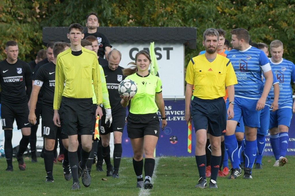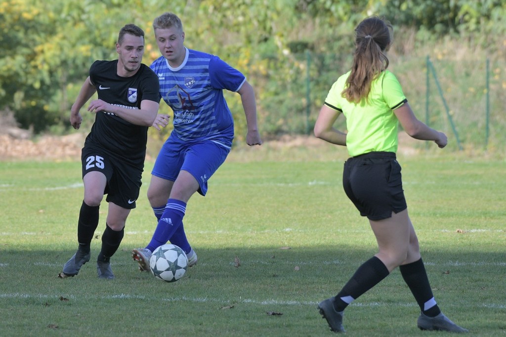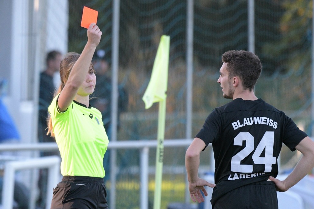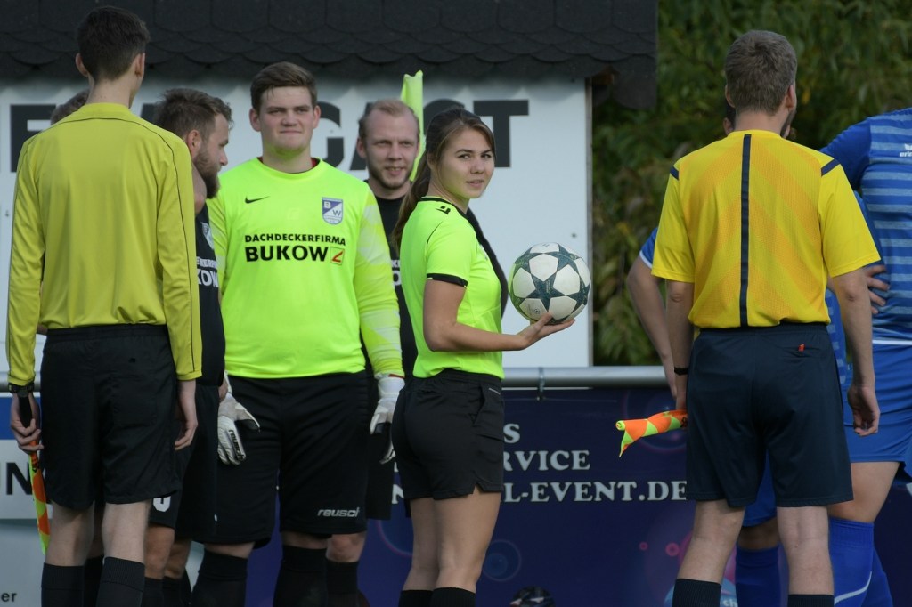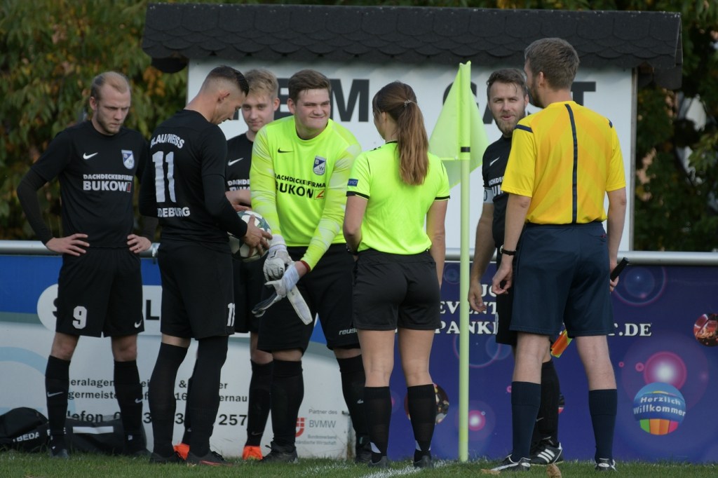 Die Anfangsminuten des zweiten Durchganges gehörten den Gästen. Es brauchte keine dreißig Sekunden, dass Alexander Berth schon stark Richtung rechten Pfosten abtauchen musste. Denn genau dorthin hatte Thorben Wagner seinen Schuss gesetzt, welcher dann von Berth um den Pfosten gelenkt wurde. In der 48. Minute war Leon Lieschke aussichtsreich nach Anspiel auf die Reise geschickt worden. Letztendlich wurde er am linken Fünfereck recht unsanft von Justin Weiß abgeräumt. Eine Situation, in der mancher Schiedsrichter auf den Punkt gezeigt hätte. Ladeburg hatte die leichte Vorherrschaft verloren. Nach einem Eckball, bei dem Ladeburgs Pascal Lutze als Adressat die Entscheidung Kopf oder Fuß zu nehmen, wohl schwerfiel, war eine sehr gute Möglichkeit. Am Ende kam ein kläglicher Abschluss heraus, der weit neben dem Tor im Aus landete (53.). Ein sehenswerter FC-Angriff über die rechte Seite endete mit dem Tor des Tages. Jeaneau Kersten machte den Anfang, indem er Kevin Domroes schickte, der dann mit flacher Eingabe in den Strafraum glänzte, wo sich schlussendlich Leon Lieschke im Abwehrknäuel durchsetzte und das Spielgerät über die Linie drückte (55.). Der Treffer zeigte für den Ladeburger Auftritt Wirkung. Die spielerische Linie ging verloren. Stattdessen hatte man in Schiedsrichterin Jeannine-Chantalle Roß eine Person gefunden, die scheinbar zum Frust abladen passte. Es war aber auch so, dass die junge Spielleiterin mit ihrem immer unsicher werdenden Auftreten und Agieren dem Negativtrend Nahrung gab. So musste der gerade ausgewechselte Rico Dumke, der sich beim Abgang nicht von der sportlich fairsten Art zeigte, mit glatt Rot unter die Dusche gehen (68.). Auch die Verantwortlichen beider Teams, Tommy Benndorf und Frank Gartzke sahen berechtigterweise den gelben Karton, weil man sich nicht immer im Griff hatte (43.). Zwei Ampelkarten, Jeaneau Kersten (Finowfurt) wegen übertriebener Härte (71.) und Mikel Nitsche (Ladeburg), der außerhalb des Blickfeldes der Schiedsrichterin eine Rangelei provozierte, machten den Fußball zeitweise zu einer Nebensache. Nun aber das ganze Negative im Spiel auf die Schiedsrichterin abzuwälzen, wäre vollkommen falsch gewesen und auch viel zu einfach gedacht. Im Endeffekt reagierte sie sehr konsequent und schaffte damit auch den Umstand der zeitweise wieder beruhigten Gemüter. Nebenbei wurde auch noch Fußball gespielt. Dies aber immer noch verkrampft und unansehnlich. Finowfurt hatte noch zwei, drei gute Möglichkeiten, um davon zu ziehen. Ladeburgs Keeper Berth verhinderte einiges, tat sich auch zweimal sehr weh und musste behandelt werden.
