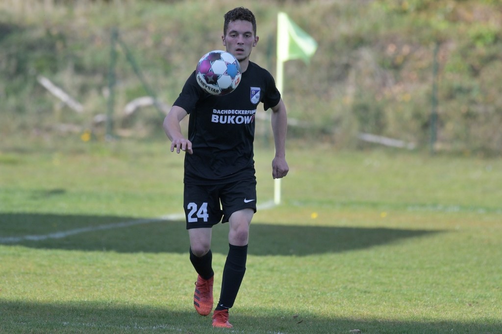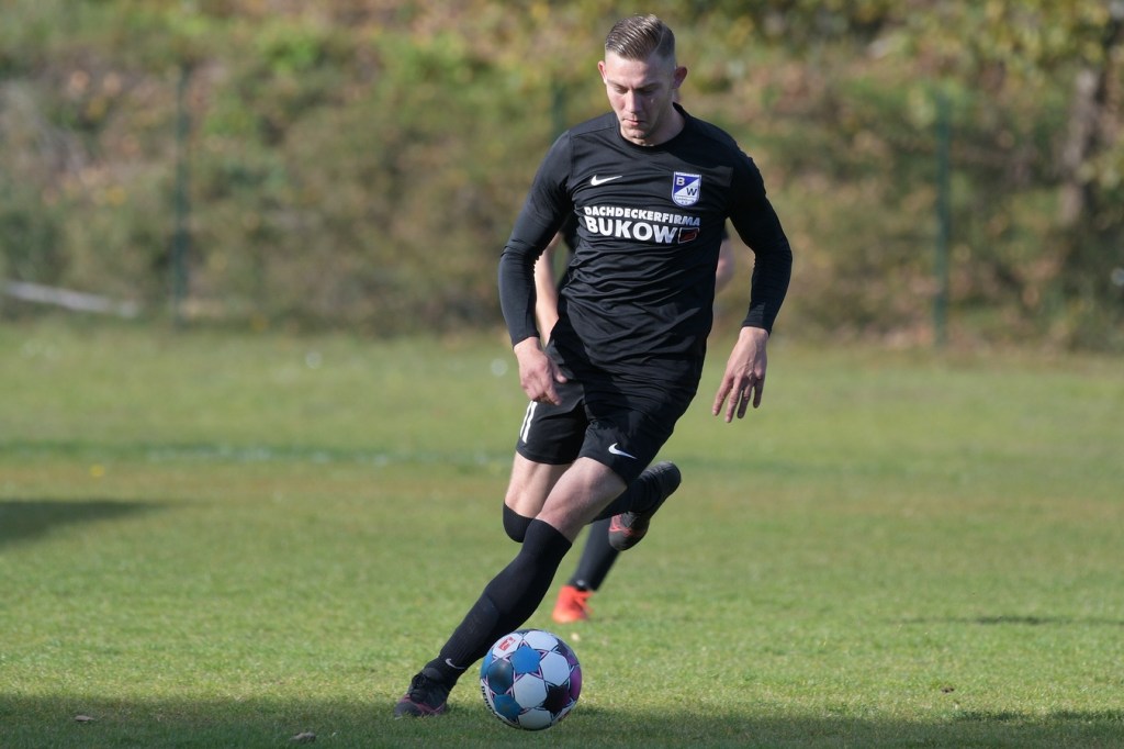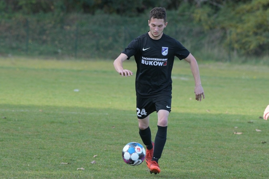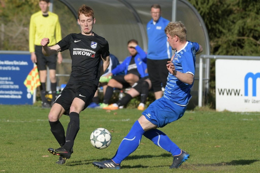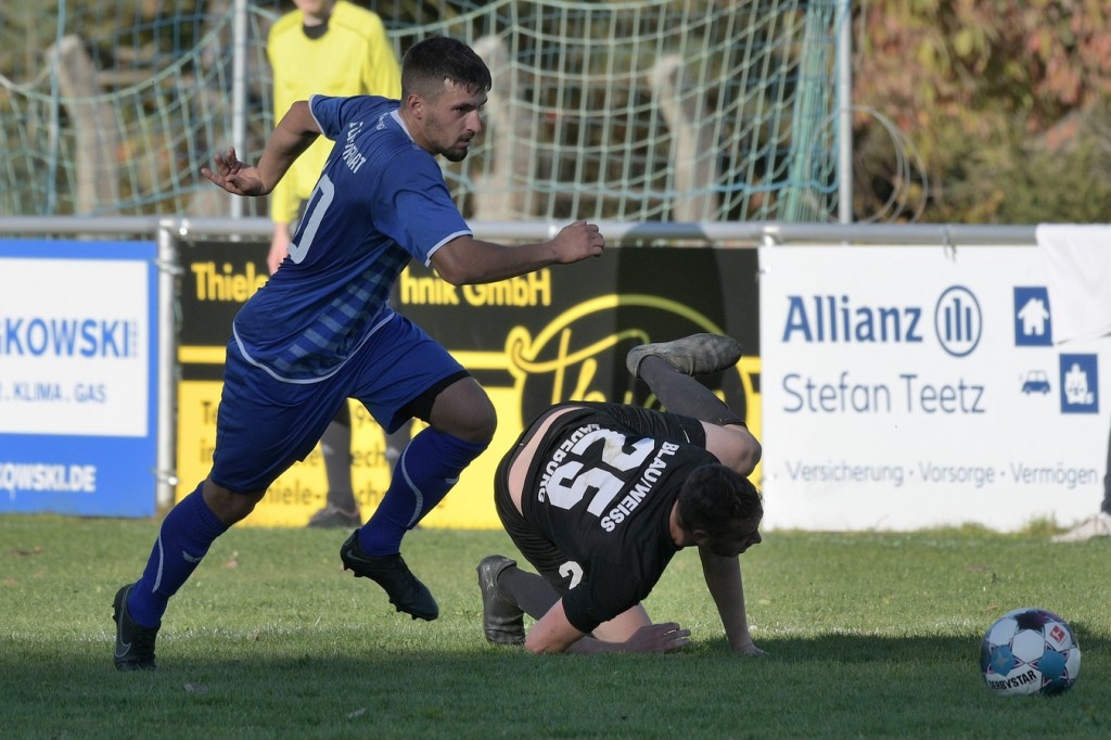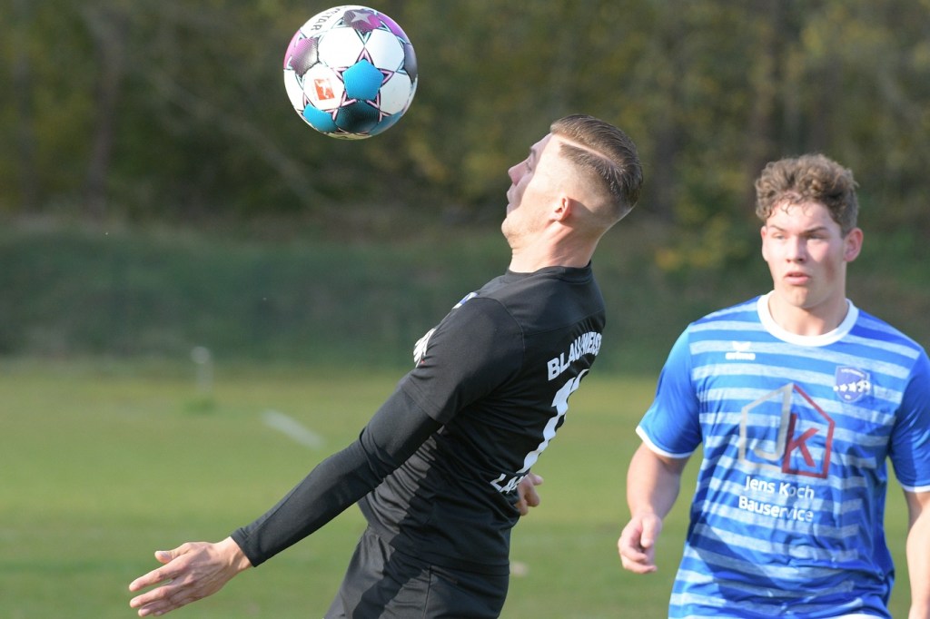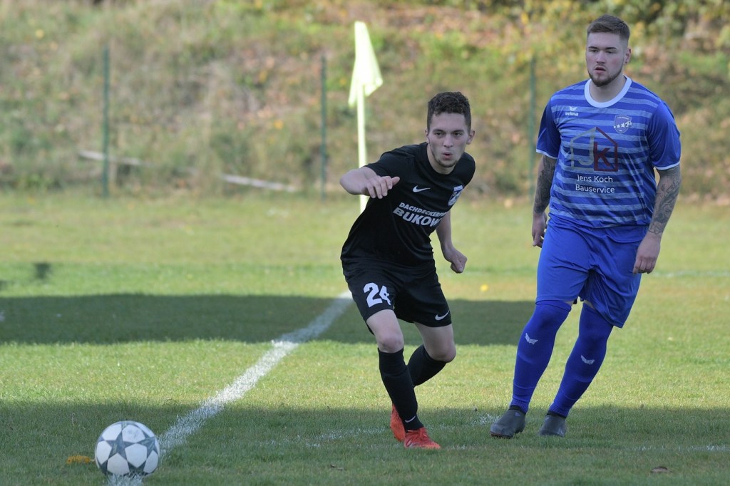 Das Spiel begann intensiv und vor allem leidenschaftlich. Beide Teams hatten offensichtlich, zumindest in der Defensive, die gleiche Taktik gewählt. Die letzte Abwehrreihe wurde weit nach vorne verschoben und somit war das Betätigungsfeld auf dem kleinen Platz schon recht eingeschränkt. Blau-Weiss zog dabei die qualitativ ansehnlichere Klinge und bekam dadurch ein kleines Übergewicht, welches aber an der Finowfurter Strafraumkante endete. Viele Zweikämpfe prägten die Szenerie, die fast im Sekundentakt Sieger und Verlierer präsentierten. Im Fachjargon würde das Wort ‚Zerfahrenheit‘ am besten dazu passen. In der 4. Minute versuchte es Justin Weiß mit einem Fernschuss, welcher in den Armen von Gäste-Keeper Eric Kretke landete. Keine sechzig Sekunden später wackelte die FC-Abwehr ein wenig. Erst scheiterte Jöran Reich aus spitzem Winkel an Kretke, dann war Christopher Knoll einen Wimperschlag zu spät und rutschte am Querpass an der Fünferlinie vorbei. Der Fight im Mittelfeld ebbte nicht ab. Dazu gesellte sich auch noch Hektik, was irgendwie auch noch eine Ursache der spielerischen Konfusion darstellte. Die nun folgende ereignislose Phase dauerte bis zur 24. Minute. Ladeburgs Philipp Noack, einer der Aktivposten im Mittelfeld, hatte den Ball über die rechte Seite kommend zu Rico Dumke durchgesteckt. Schlussendlich hatte Eric Kretke den Winkel verkürzt und damit Dumkes Torschussmöglichkeit abgewehrt. Der daraus resultierende Eckball brachte die nächste Blau-Weisse Chance, welche Pascal Lutze per Kopfball knapp über das Tor bugsierte (25.). Für Finowfurt gab es eine Minute später die erste Möglichkeit. Leon Lieschke wurde die Kugel aufgelegt, doch nahm er sichtbar den falschen Fuß und setzte den Ball recht unkontrolliert und klar neben das Tor (26.). Zwei Abschlüsse aus der zweiten Reihe, getreten Niklas Gorgas, fehlten die Präzision, um dem Ladeburger Torsteher Alexander Berth irgendwie gefährlich zu werden (28., 29.). Die Partie lebte eigentlich nur von der Spannung. Den Schlusspunkt des ersten Durchganges markierte Aidan Wrana mit einem Kopfball nach einem lang geschlagenem Freistoß. Aber auch er war in der Peilung noch etwas ungenau, als der Ball gut zwei Meter neben dem Kasten die Auslinie überquerte (44.).
