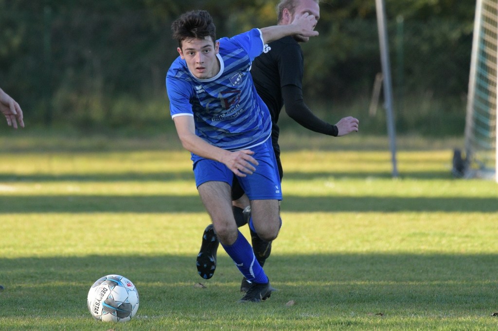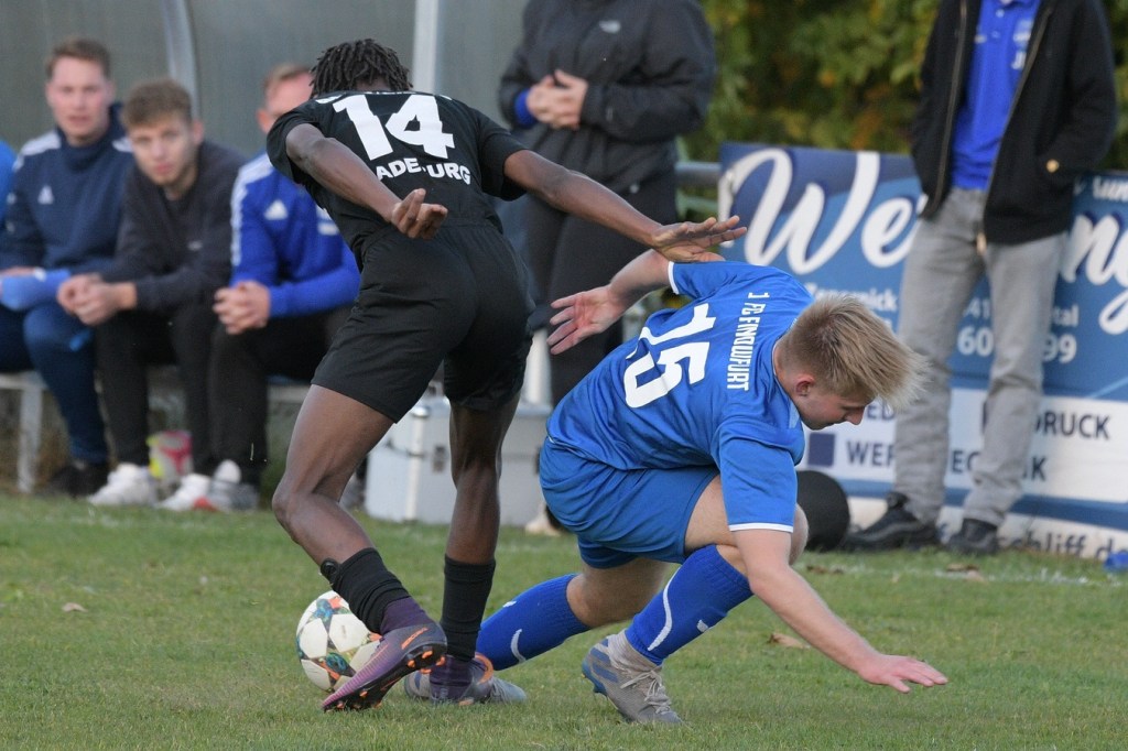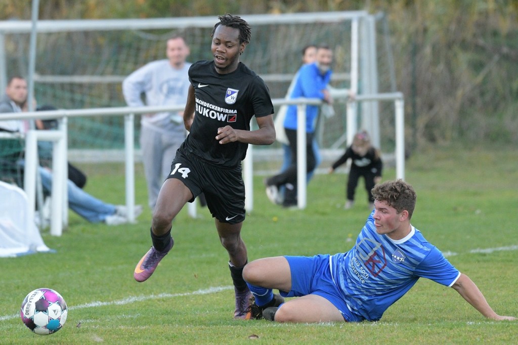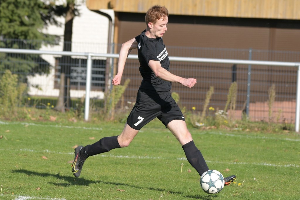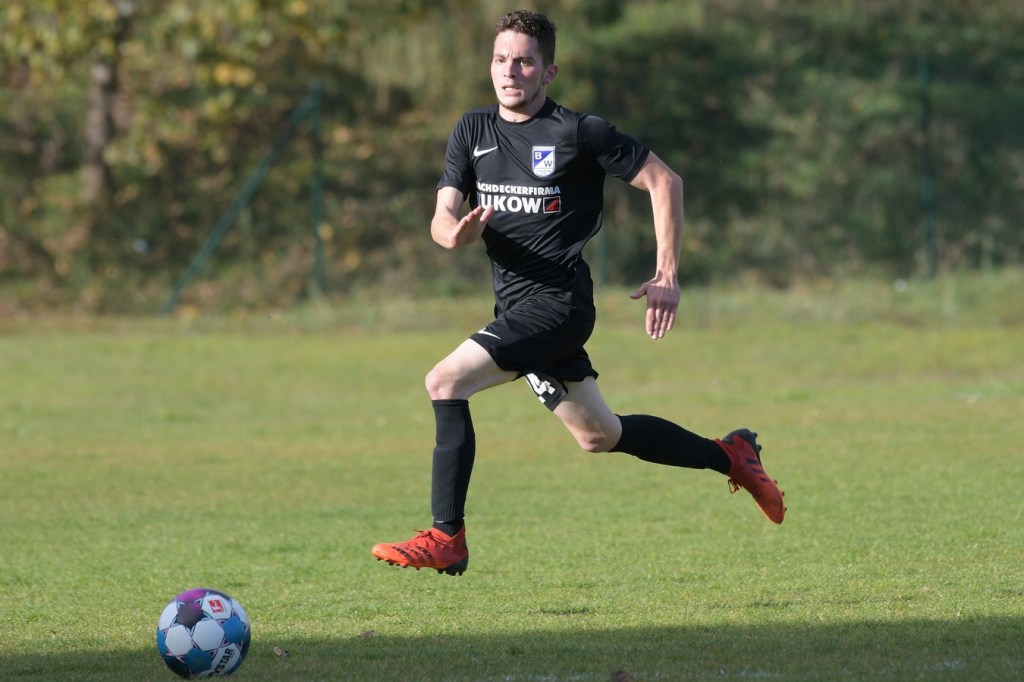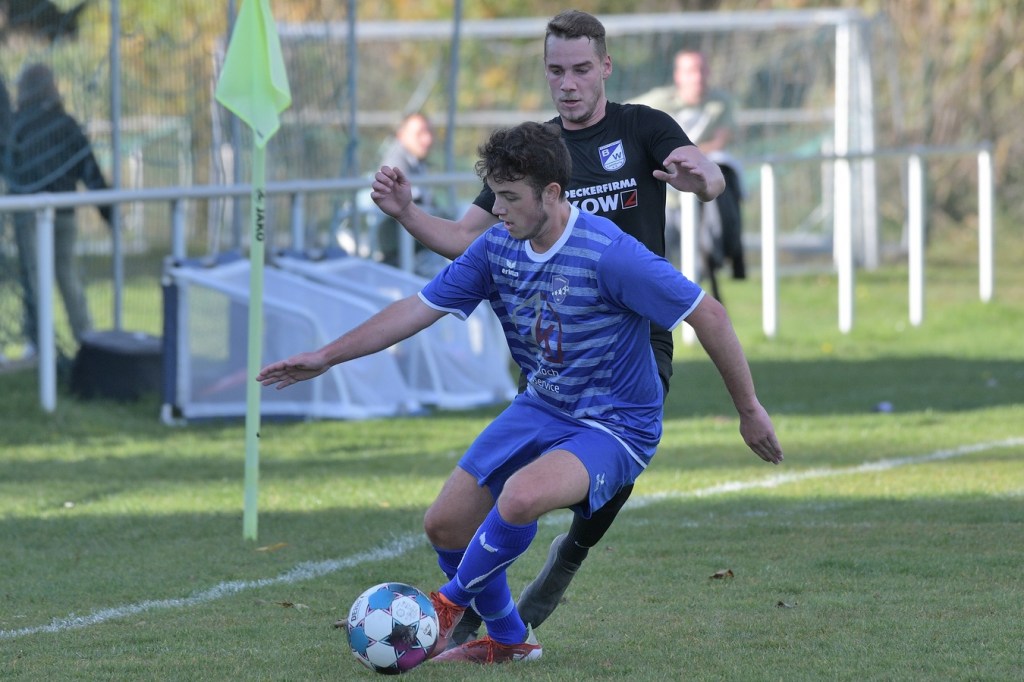 Das Spiel begann intensiv und vor allem leidenschaftlich. Beide Teams hatten offensichtlich, zumindest in der Defensive, die gleiche Taktik gewählt. Die letzte Abwehrreihe wurde weit nach vorne verschoben und somit war das Betätigungsfeld auf dem kleinen Platz schon recht eingeschränkt. Blau-Weiss zog dabei die qualitativ ansehnlichere Klinge und bekam dadurch ein kleines Übergewicht, welches aber an der Finowfurter Strafraumkante endete. Viele Zweikämpfe prägten die Szenerie, die fast im Sekundentakt Sieger und Verlierer präsentierten. Im Fachjargon würde das Wort ‚Zerfahrenheit‘ am besten dazu passen. In der 4. Minute versuchte es Justin Weiß mit einem Fernschuss, welcher in den Armen von Gäste-Keeper Eric Kretke landete. Keine sechzig Sekunden später wackelte die FC-Abwehr ein wenig. Erst scheiterte Jöran Reich aus spitzem Winkel an Kretke, dann war Christopher Knoll einen Wimperschlag zu spät und rutschte am Querpass an der Fünferlinie vorbei. Der Fight im Mittelfeld ebbte nicht ab. Dazu gesellte sich auch noch Hektik, was irgendwie auch noch eine Ursache der spielerischen Konfusion darstellte. Die nun folgende ereignislose Phase dauerte bis zur 24. Minute. Ladeburgs Philipp Noack, einer der Aktivposten im Mittelfeld, hatte den Ball über die rechte Seite kommend zu Rico Dumke durchgesteckt. Schlussendlich hatte Eric Kretke den Winkel verkürzt und damit Dumkes Torschussmöglichkeit abgewehrt. Der daraus resultierende Eckball brachte die nächste Blau-Weisse Chance, welche Pascal Lutze per Kopfball knapp über das Tor bugsierte (25.). Für Finowfurt gab es eine Minute später die erste Möglichkeit. Leon Lieschke wurde die Kugel aufgelegt, doch nahm er sichtbar den falschen Fuß und setzte den Ball recht unkontrolliert und klar neben das Tor (26.). Zwei Abschlüsse aus der zweiten Reihe, getreten Niklas Gorgas, fehlten die Präzision, um dem Ladeburger Torsteher Alexander Berth irgendwie gefährlich zu werden (28., 29.). Die Partie lebte eigentlich nur von der Spannung. Den Schlusspunkt des ersten Durchganges markierte Aidan Wrana mit einem Kopfball nach einem lang geschlagenem Freistoß. Aber auch er war in der Peilung noch etwas ungenau, als der Ball gut zwei Meter neben dem Kasten die Auslinie überquerte (44.).