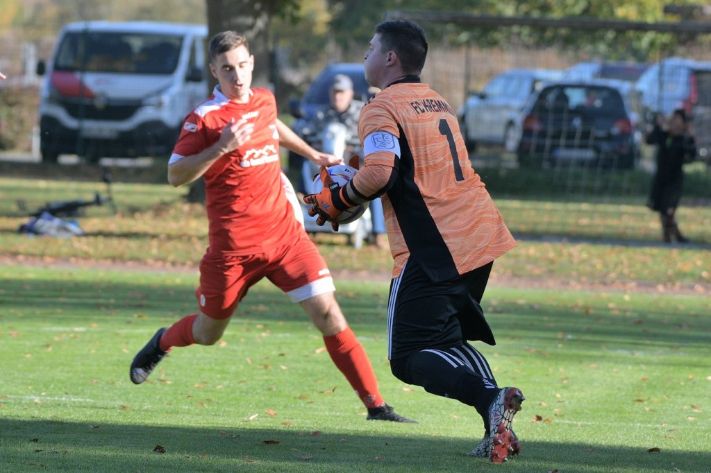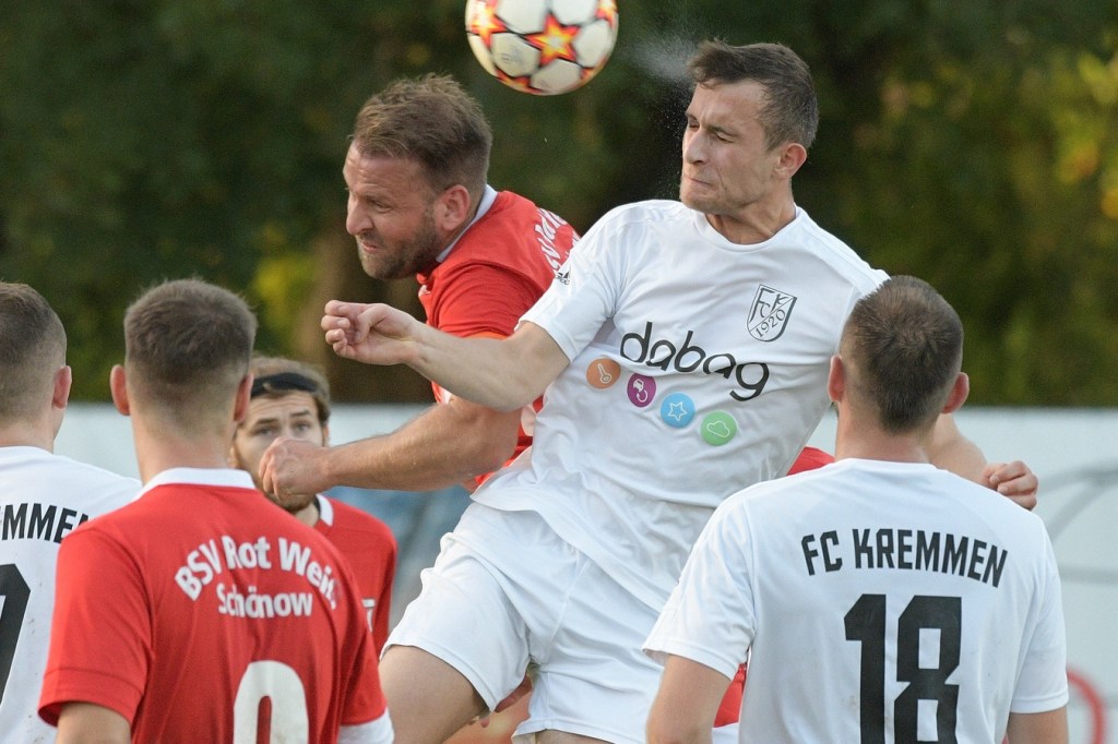 Die Begegnung unter der Leitung von Oberliga-Schiedsrichter Toni Bauer brauchte genau fünfunddreißig Sekunden, um das erste Raunen aus dem FC-Fan-Lager zu vernehmen. Lukas Kraeft tauchte nach Anspiel seines Kollegen Niclas Köpke vollkommen frei im Strafraum auf und versemmelte die Hundertprozentige schon kläglich mit der Landung des Balles im Fangzaun hinter dem Schönower Gehäuse. „Wenn der reingegangen wäre, hätten wir vielleicht einen noch ganz anderen Spielverlauf gehabt“, kommentierte Gäste-Trainer Hendrik Brösel die Situation im Nachgang. Die Hausmarke der Kremmener war gesetzt und ließ in den Folgeminuten eine Druckphase folgen. Mit „Caro einfach“, lange Diagonalbälle als Dosenöffner, organisiert durch die schnellen Außen Heinrich Bredow und Niclas Köpke, versuchte die Janotta-Truppe den Gästen das Fürchten zu lehren. Im Ansatz funktionierte das auch, doch im Zielvorgang fehlte die letzte Präzision und Kaltschnäuzigkeit. Nach gut zehn Minuten hatte sich Schönow auf Augenhöhe begeben und in die Partie reingearbeitet. Denn ohne Leidenschaft, welche besonders die FC-Mannschaft vorlebte, ging gar nichts. Über diese Schiene kam Rot-Weiß auch zu Möglichkeiten, wie der in der 13. Minute. Maximilian Bachnick schob die Kugel in den Lauf zu Christoph Spitze, der dann aber zu überhastet und früh abschloss und somit eine sehr gute Chance liegen ließ. Intensität war nun das Schlüsselwort für die Beschreibung der Zweikämpfe im Mittelfeld. Mit der Doppelchance durch Hannes Krüger und im Nachschuss durch Spitze begann die beste Gäste-Zeit (21.). Bachnick aus kurzem Winkel und wiederum Christoph Spitze, der per Kopfball aktiv wurde, hätten in der 27. Minute das 0:1 bedeuten können. Aber genau, wie auf der Gegenseite, fehlte den Abschlüssen die Genauigkeit. Über die rechte Außenbahn blieb Schönow im Vorwärtsgang am gefährlichsten. Bachnick glänzte hier als Vorbereiter, hatte aber oft Pech, dass keiner seiner Mitstreiter die Strafraumpräsens suchte. Kremmen hingegen kam nur noch sporadisch in die Offensive, schaffte es aber Richtung Halbzeitpfiff noch einmal eine Schippe draufzulegen. Resultat des erhöhten Aufwandes war die Führung, erzielt durch Niclas Köpke, welche sich dann auch angebahnt hatte. Köpke, nach sehenswertem Anspiel, fackelte nicht lange und traf per Flachschuss von der linken Strafraumseite unhaltbar im rechten unteren Eck (39.).
