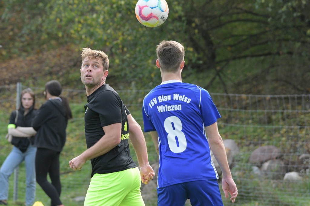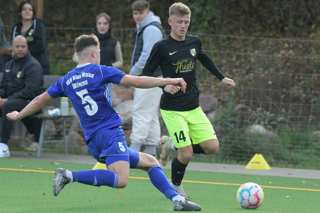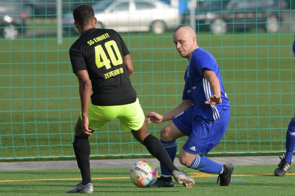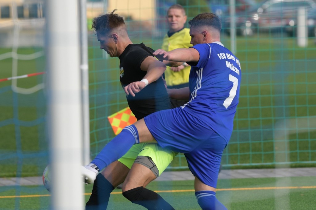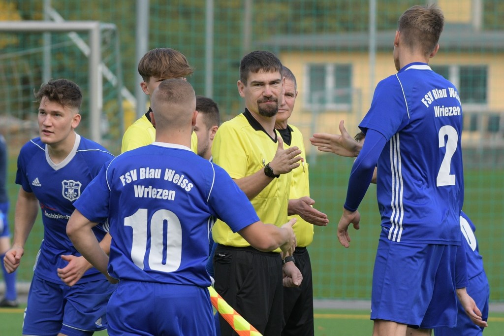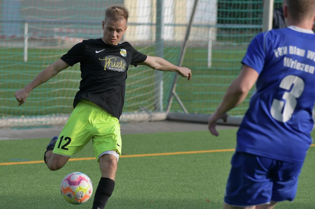 Die sanierte, eigentlich neue Sportanlage der Blau-Weissen präsentierte sich als Schmuckstück, mit einem kleinen Mangel, dass der Rasen sich noch in der Schonung und Wachstumsphase befindet und damit nicht bespielbar war. Laut Aussage des sportlichen Leiters der Hausherren, Christian Wegner, wird es noch eine Weile dauern dürfen, bis der Ball das erste Mal mit dem neuen Geläuf Kontakt aufnehmen kann. Deshalb musste der kleine Kunstrasen den Rahmen vor guter Kulisse für die Begegnung erzeugen, was für die Heim-Truppe sicherlich ein Vorteil war. „Wir wollten defensiv kompakt stehen und mit Nadelstichen Zeichen setzen. Ich denke, dies ist uns ganz gut gelungen“, hatte Wriezens Übungsleiter Kilian Karpe die Marschroute im Nachgespräch preisgegeben und den Gästen damit von Minute eins die Geduldsprobe auferlegt. Dabei stockte den Wrieznern schon nach sechzig Sekunden der Atem, als Philip Opitz aus dem linken Halbfeld in den Gästestrafraum flankte und die Flugbahn immer länger wurde. Dies brachte Keeper Daniel Meinert schon in eine kleine Verlegenheit, denn er musste einige Male nachfassen, um das Spielgerät letztendlich ins Aus zu lenken. Aber auch Zepernick wurde zum Durchatmen gezwungen. Ein Eckball von der linken Seite kam gut getimt im Strafraum an, wo sich Christian Kamp am höchsten schraubte und den Ball mit der Stirn an das rechte Lattenkreuz nagelte (9.). In der 16. Minute waren dann mal die Gäste sehenswert über rechts unterwegs. Ein Pass in den Rückraum verwertete Lesley Park mit strammem Geschoss, jedoch mit breitgefächerter Peilung, dem Resultat der klaren Zielverfehlung. Die Begegnung war intensiv, hatte Rasse und Leidenschaft, von denen qualitätsbedingt die Hausherren einiges mehr in die Waagschale werfen mussten. Die nächste Möglichkeit hatte wiederum Opitz, der von Max Gerhard sehenswert in Schussposition gebracht wurde. Aber auch bei ihm waren die Töppen scheinbar noch nicht richtig geschnürt (18.). Einheit schraubte zunehmend die Ballbesitz-Prozente jenseits der fünfundsiebzig Marke, wirkte aber in vielen Phasen zu verschleppend. Viele Stationen, per One-Touch abgespult, brachten selten den erhofften Raumgewinn, was den Wrieznern das Verteidigen schon erleichterte. Es wurde aber auch eine Begegnung des Spitzenreiters, der, wenn es mal schnell und schnörkellos wurde, die wirklich guten Chancen versiebte. Lukas Grabarek, der Scorer der Einheit mit zehn Treffern, gehörte dazu, wie in der 19. Minute, als er aussichtsreich den Ball knapp neben das Tor setzte. Im Gegenzug probierte es Nick Hildenhagen für seine Blau-Weissen, aber auch sein Geschoss aus achtzehn Metern landete im Aus. Der lange Atem, der den Gästen entgegen hauchte, hatte weiter Bestand. Das Spiel war immens spannend, weil sich keiner eine Auszeit nehmen konnte und auch wollte. Kevin Maek, der Antreiber des Tabellenführers, machte den Unterschied aus. Er schaffte es zwar seine Kollegen einzusetzen, aber die Ertragsgröße, in Form von gefährlichen Abschlüssen, blieb unter den eigenen Erwartungen. Wriezen hingegen blieb weiter defensiv stabil, musste sich aber auch eingestehen, dass es mit den Vorgaben des Trainers zum Nadelstechen immer seltener wurde. Schlussendlich wurde der erste Durchgang zur Nullnummer, weil auch Max Gerhard, einmal aus spitzem Winkel ans Außennetz (38.) und mit einem Freistoß aus achtzehn Metern, das Tor-Glück versagt blieb. Aber auch Luca Grabarek ließ noch etwas liegen, als er einschussbereit von der gemeinsam agierenden Heimabwehr am Vollenden gehindert wurde (45.).