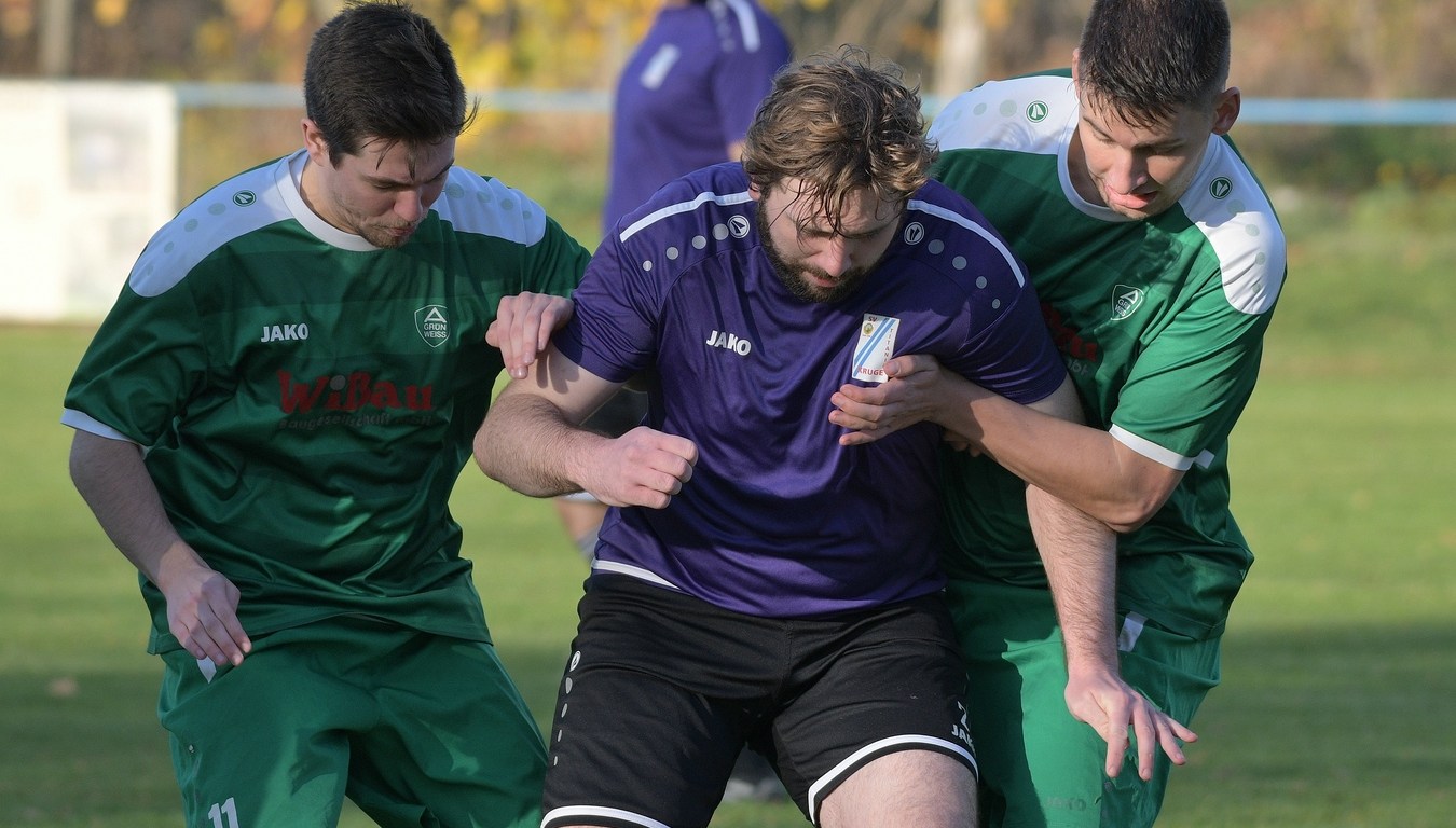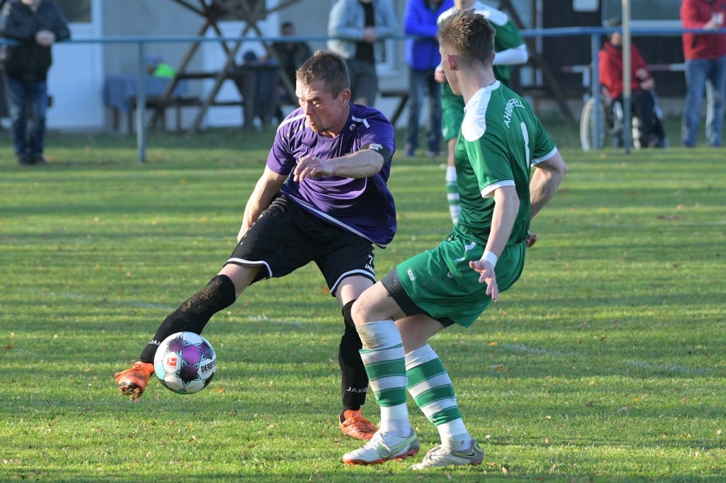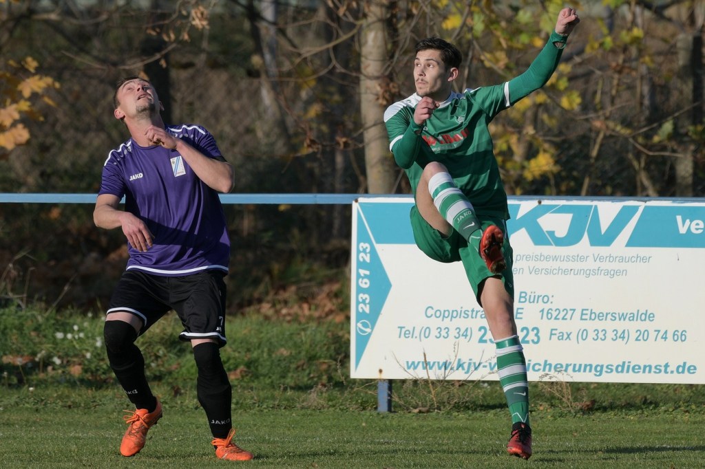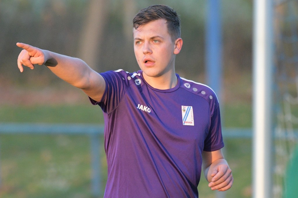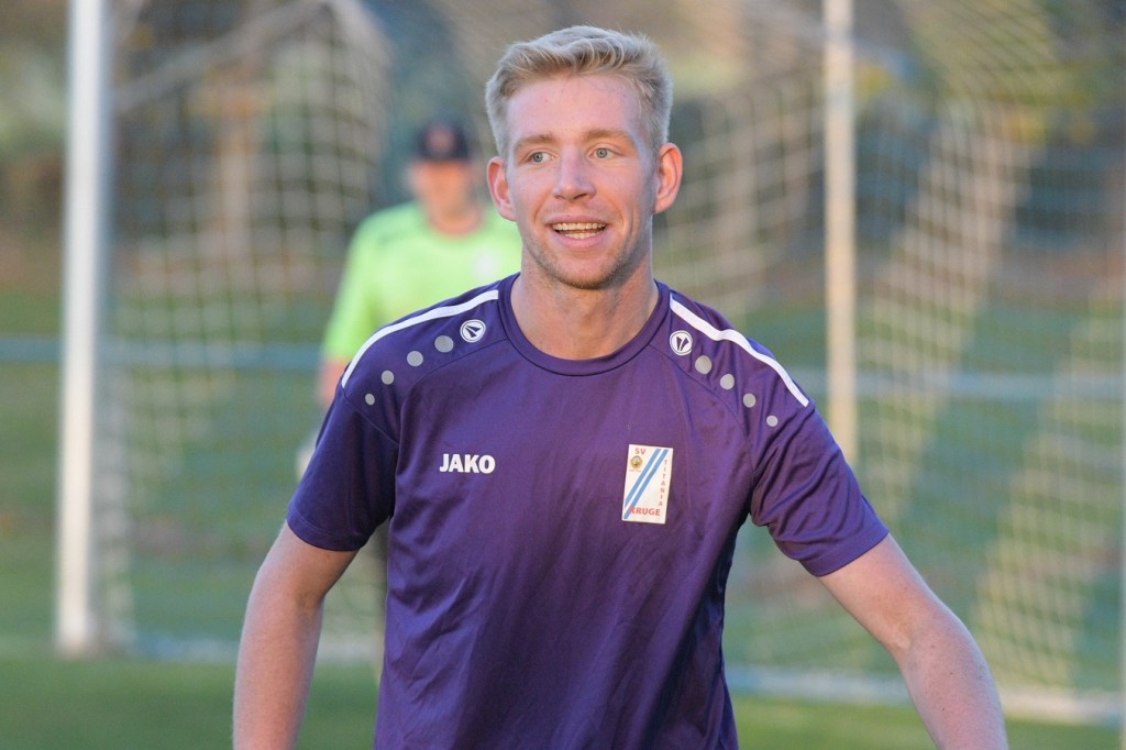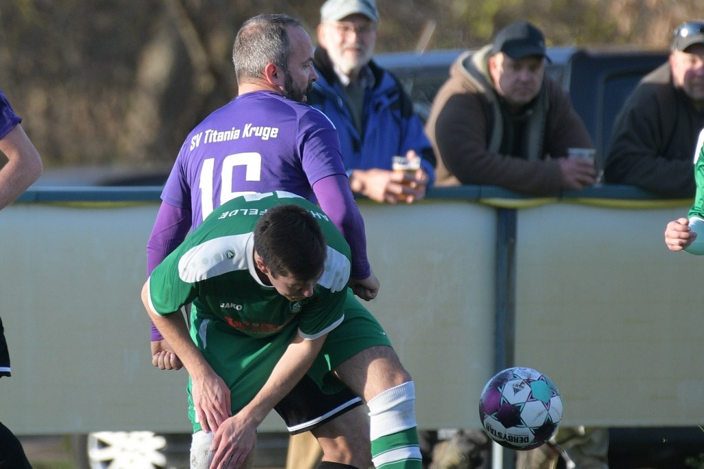 Die Begegnung brauchte eine spürbare Warmwerde-Phase. Während die Gäste lange nach der spielerischen Linie suchten, machte die Kruger Truppe in der Abwehr vieles richtig. Ebenfalls positiv war der Fakt, dass man sich nicht hinten reinstellte, sondern auch versuchte Rauchzeichen zu setzen. Die Nullnummer in den Torabschlüssen auf beiden Seiten beendete Ahrensfeldes Pascal Klinkmann mit einem Fernschuss, welcher weit neben dem Kasten ins Aus ging, in der 17. Minute. In der Folge trat Gäste-Kapitän Marvin Menzel in seiner Präsenz, seine Farben in Front zu schießen, stark in den Vordergrund. Einen langen Ball in den rechten Gäste-Strafraum verwertete er mit einem Schuss aus spitzem Winkel ans Außennetz (18.) und drei Minuten später versemmelte er eine Doppelchance. Beim ersten Versuch scheiterte er am gut aufgelegten Miguel Weinknecht. Den abgewehrten Ball, welcher genau vor seine Füße sprang, schoss er ohne Qualität in die Kruger Nachmittagssonne. Aber auch Menzels Kollegen haderten mit ihrem Schussglück. In der 25. Minute kam eine Flanke von der rechten Seite in den Strafraum, wo Jeremy Schröder vollkommen blank das fast leere Tor vor sich hatte. Schlussendlich fehlte ihm die Körperspannung und die Gier bei seinem Schuss, der an Lattenunterkante landete und im Spiel blieb. Trotz der guten Barnimer Möglichkeiten war Kruge nicht in der Dauerbelagerung. Ansätze von Offensivaktionen waren durchaus vorhanden, wurden aber viel zu schnell wieder hergegeben. Auf Ahrensfelder Seite stockte der Angriffsmotor immer wieder, weil man einfach nicht ins eigene Spiel fand. Statische Phasen, mit zum Teil hoher Fehlerquote in der Ballverteilung, brachten die eigenen Vorwärtsgänge oft zum Erliegen. Dieser Umstand machte es den Titanen aber auch leicht, defensiv kaum aus der Ordnung zu geraten. Sehr gute Möglichkeiten für Grün-Weiss ploppten immer wieder auf: Marvin Menzel, gut an der Strafraumgrenze positioniert, mit einem strammen Geschoß, knapp vorbei (28.). Dann Nico Salvatore Gliese, dessen Kopfball vollkommen verunglückte (34.). Auch der Kopfball von Pascal Knote nach einem Eckball blieb ohne Wirkung (36.). Der sehenswert angesetzte Fallrückzieher von Marcel Adamowicz war dann auch nur für die Galerie (41.). „Schwere Geburt“, hatte Ahrensfeldes Coach Henry Preuß in seinen Bart gebrubbelt und damit genau ins Schwarze getroffen. In der 44. Minute wäre dann der ganze Gäste-Aufwand fast in die Hose gegangen. Alexander Petzold war für seine Titania über rechts unterwegs. Sein Diagonalball in den Gäste-Strafraum flutschte an Keeper Marvin Mähnelt und Oliver Rau vorbei und landete unberührt im Aus. Ein etwas längeres Bein von Rau hätte dem Ball bestimmt die erfolgversprechende Richtung geben können. So ging es torlos in die Halbzeit, in der sich die Gäste mit ihrem Misserfolg an die eigene Nase fassen mussten.