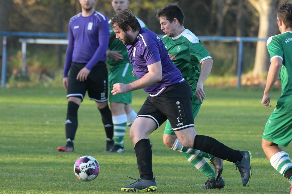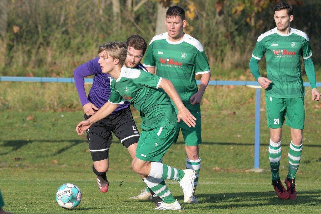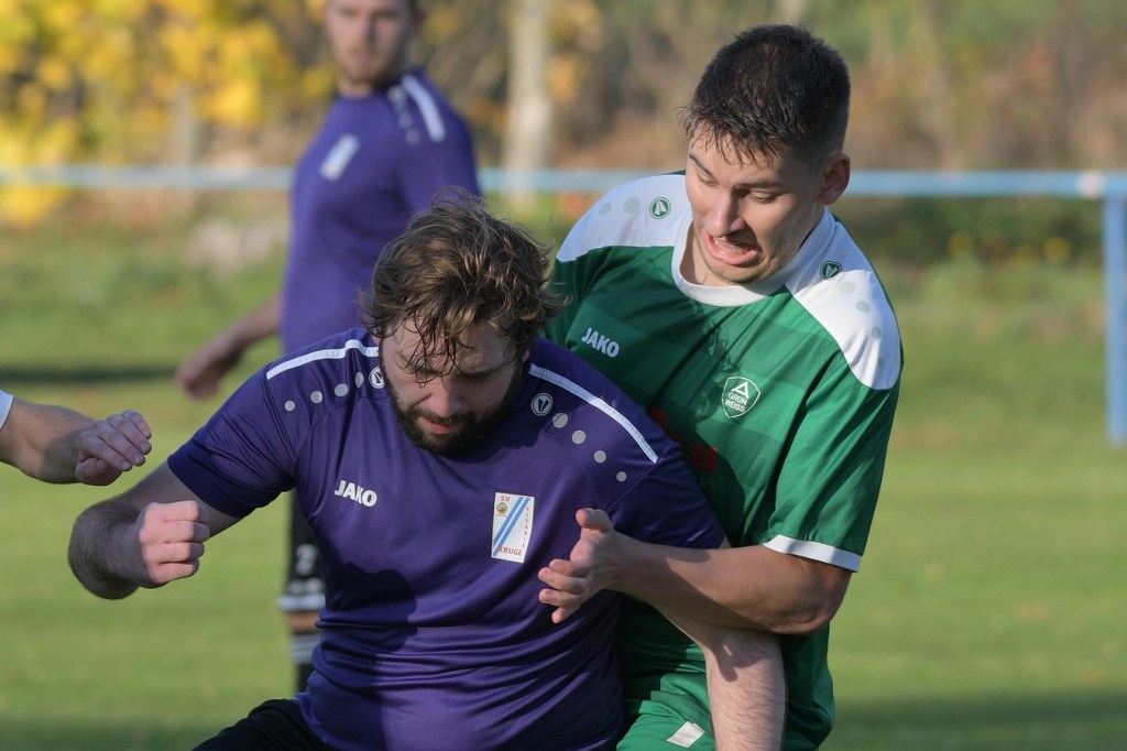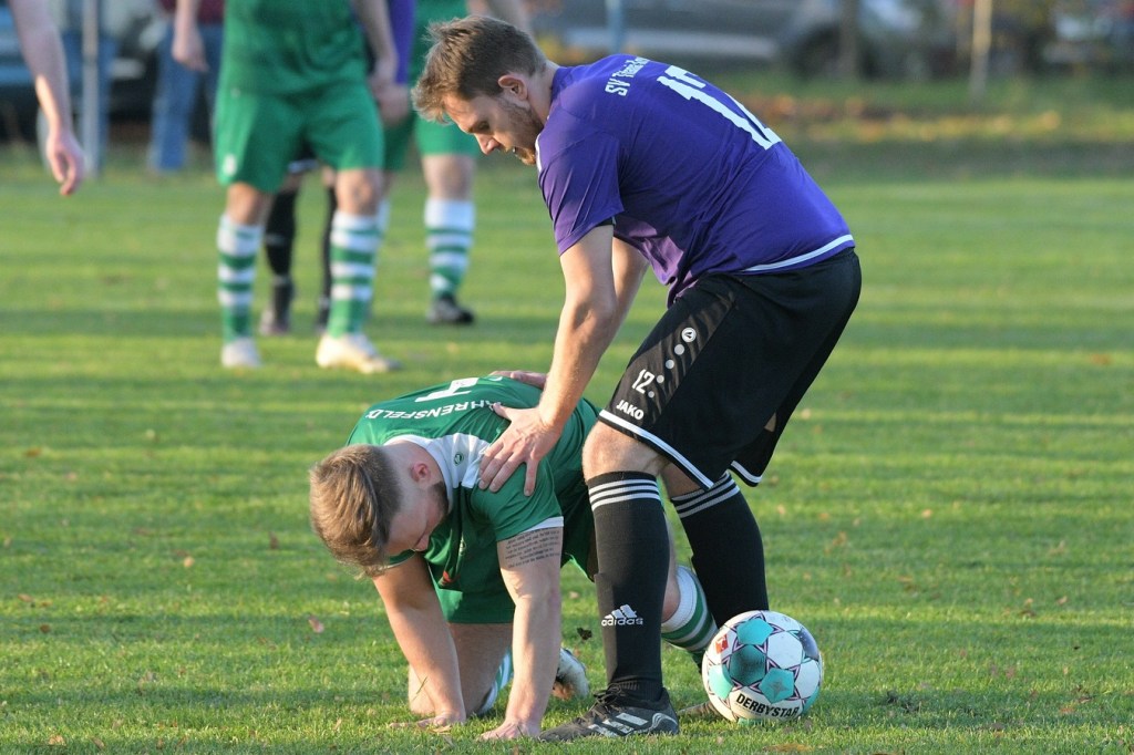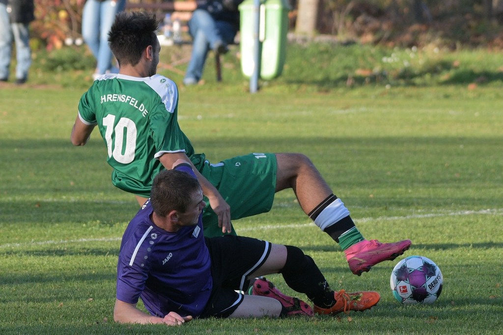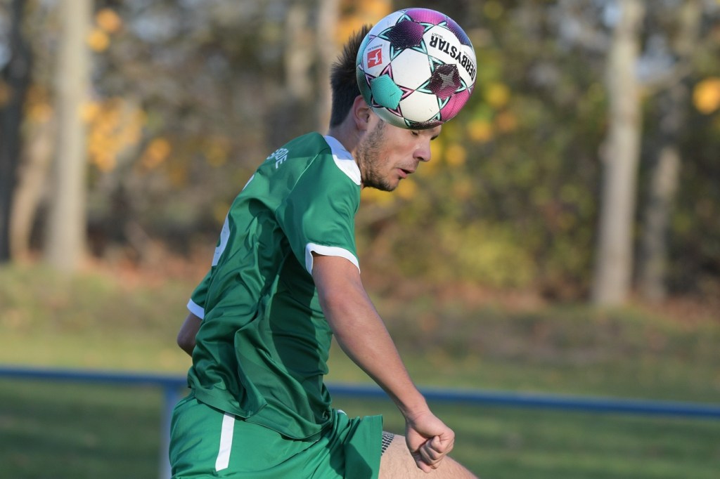 Die Begegnung brauchte eine spürbare Warmwerde-Phase. Während die Gäste lange nach der spielerischen Linie suchten, machte die Kruger Truppe in der Abwehr vieles richtig. Ebenfalls positiv war der Fakt, dass man sich nicht hinten reinstellte, sondern auch versuchte Rauchzeichen zu setzen. Die Nullnummer in den Torabschlüssen auf beiden Seiten beendete Ahrensfeldes Pascal Klinkmann mit einem Fernschuss, welcher weit neben dem Kasten ins Aus ging, in der 17. Minute. In der Folge trat Gäste-Kapitän Marvin Menzel in seiner Präsenz, seine Farben in Front zu schießen, stark in den Vordergrund. Einen langen Ball in den rechten Gäste-Strafraum verwertete er mit einem Schuss aus spitzem Winkel ans Außennetz (18.) und drei Minuten später versemmelte er eine Doppelchance. Beim ersten Versuch scheiterte er am gut aufgelegten Miguel Weinknecht. Den abgewehrten Ball, welcher genau vor seine Füße sprang, schoss er ohne Qualität in die Kruger Nachmittagssonne. Aber auch Menzels Kollegen haderten mit ihrem Schussglück. In der 25. Minute kam eine Flanke von der rechten Seite in den Strafraum, wo Jeremy Schröder vollkommen blank das fast leere Tor vor sich hatte. Schlussendlich fehlte ihm die Körperspannung und die Gier bei seinem Schuss, der an Lattenunterkante landete und im Spiel blieb. Trotz der guten Barnimer Möglichkeiten war Kruge nicht in der Dauerbelagerung. Ansätze von Offensivaktionen waren durchaus vorhanden, wurden aber viel zu schnell wieder hergegeben. Auf Ahrensfelder Seite stockte der Angriffsmotor immer wieder, weil man einfach nicht ins eigene Spiel fand. Statische Phasen, mit zum Teil hoher Fehlerquote in der Ballverteilung, brachten die eigenen Vorwärtsgänge oft zum Erliegen. Dieser Umstand machte es den Titanen aber auch leicht, defensiv kaum aus der Ordnung zu geraten. Sehr gute Möglichkeiten für Grün-Weiss ploppten immer wieder auf: Marvin Menzel, gut an der Strafraumgrenze positioniert, mit einem strammen Geschoß, knapp vorbei (28.). Dann Nico Salvatore Gliese, dessen Kopfball vollkommen verunglückte (34.). Auch der Kopfball von Pascal Knote nach einem Eckball blieb ohne Wirkung (36.). Der sehenswert angesetzte Fallrückzieher von Marcel Adamowicz war dann auch nur für die Galerie (41.). „Schwere Geburt“, hatte Ahrensfeldes Coach Henry Preuß in seinen Bart gebrubbelt und damit genau ins Schwarze getroffen. In der 44. Minute wäre dann der ganze Gäste-Aufwand fast in die Hose gegangen. Alexander Petzold war für seine Titania über rechts unterwegs. Sein Diagonalball in den Gäste-Strafraum flutschte an Keeper Marvin Mähnelt und Oliver Rau vorbei und landete unberührt im Aus. Ein etwas längeres Bein von Rau hätte dem Ball bestimmt die erfolgversprechende Richtung geben können. So ging es torlos in die Halbzeit, in der sich die Gäste mit ihrem Misserfolg an die eigene Nase fassen mussten.