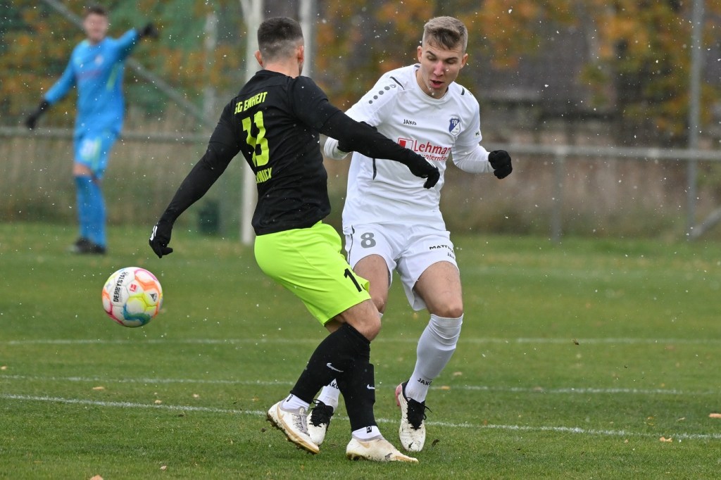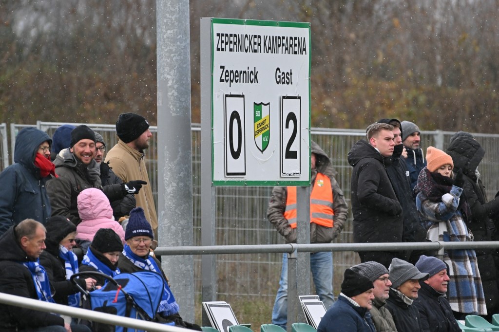 Die Partie begann bei winterlichen Temperaturen, leichtem Schnellfall und etwas rutschigen Bodenverhältnissen recht vielversprechend. Die Gäste hatten vom Anfang weg die Regie übernommen, in der Einheit schon versuchte geschlossen aufzutreten und auch engagiert dagegenzuhalten, was aber nur im Ansatz gelang. Andy Hebler, der Mannschaftskapitän und Torgarant des VfB, eröffnete in der 4. Minute den Reigen der Tormöglichkeiten. Nach einer Ecke von der rechten Seite kam er im Fünfmeterraum zum Abschluss, doch Einheit Keeper Dennis Tietz war hellwach und reagierte stark, sodass die frühe Krieschower Führung verwehrt blieb. Die Agenda, welche Krieschow verfolgte, war klar erkennbar und darauf ausgerichtet, frühzeitig die Verhältnisse geklärt zu haben. Gerade Christoph Pauling, der meistens die rechte Außenbahn nutzte, um extrem sprintfähig Möglichkeiten vorzubereiten, versprühte große Gefährlichkeit. So fütterte er einige Male seinen Kollegen Hebler, der aber noch ein wenig mit seinem Abschlussglück haderte. Dem 0:1, erzielt durch den VfB-Goalgetter Hebler, ging eine recht unglückliche Aktion von Dennis Tietz voraus. Einen leicht aufsetzenden Schuss konnte er nicht kontrollieren und musste diesen prallen lassen. Hebler war zur Stelle und drückte die Kugel mit viel Willen über die Linie (11.). Keine einhundertzwanzig Sekunden später klingelte es zum zweiten Mal im Zepernicker Kasten. Wieder sah Tietz nicht glücklich aus, als er einen Schuss von Christoph Pauling schlecht abwehrte und Pauling nach kurzem Anspiel zum Torschützen wurde. Nach fünfzehn Minuten kam Einheit besser in die Partie. Zum einen, weil man mutiger wurde und zum anderen, weil die Gäste ihren Aufwand dem Ergebnis etwas anpassten und sich mehr aus der Partie nahmen. Die ersten beiden SG-Torschüsse hatte Philip Opitz für sich verbucht. Beide Male versuchte er es aus der zweiten Reihe. Den einen hielt Gäste-Torsteher Fritz Pflug, der, nebenbei erwähnt, in der 4. Minute seinen Kollegen Luca Graf verletzungsbedingt ersetzen musste, der andere ging weit am Kasten vorbei (21., 23.). Ein Freistoß aus dem linken Halbfeld hauchte schon etwas Gefahr in die Gästeabwehrreihen, als Kevin Maek am Ball vorbeigesprungen war und der Ball letztendlich in den Händen von Pflug landete (24.). Zepernick hatte in dieser Phase Augenhöhe erreicht und zum Teil auch mehr vom Spiel. Doch sehr überzeugend wirkte das nicht. Dem Aufzug fehlte ganz einfach Präzision und Geschwindigkeit. Auch der Körpersprache mangelte in der Ausstrahlung nach Gier und Leidenschaft, die es sicherlich gebraucht hätte, um dem Oberligisten richtig weh zu tun. Krieschow hingegen agierte weiter im Wartemodus auf des Gegners Fehler. Und diese bekam der Favorit immer wieder mal präsentiert. Der Zepernicker Mangel, im Spielaufbau zu behäbig und kompliziert unterwegs zu sein, führte dann zum 0:3. Eine vollkommen unnötige Zweikampfniederlage wurde zum Bumerang und offenbarte noch zusätzliche Geschwindigkeitsnachteile im Sprintvermögen. Der Balleroberer, Christoph Pauling, huschte über die rechte Seite mit folgender flacher Eingabe in den Rückraum, wo Filip Hasek eingelaufen war und kompromisslos einnetzen konnte (33). Für den normalen Betrachter war die Partie gelaufen. Nahrung für diese Gedanken gab Zepernick aber auch selber. Immer wieder passierten Fehler und Nachlässigkeiten, welche den Gästen die Möglichkeiten präsentierten, die Partie in Richtung schmerzhafter Niederlage zu schieben. Einheit im Gegensatz dazu blieb weiterhin offensiv zu harmlos. Wie Philip Opitz, der für seinen finalen Abschluss einfach zu lange brauchte und damit leben musste, dass sein Geschoss in der gut sortierten Abwehr hängen blieb (38.). Auch Lesley Park mit seinem Schuss aus der zweiten Reihe nach einer abgewehrten Ecke fehlte jegliche Gefährlichkeit, als der Ball neben dem Kasten im Aus landete (39). Im Endeffekt konnte die Geral-Truppe sich glücklich schätzen, nur mit einem drei Tore-Rückstand in die Kabine gegangen zu sein.