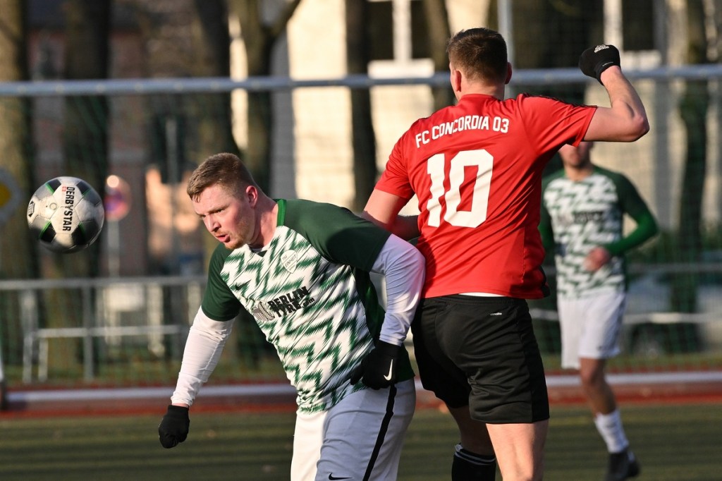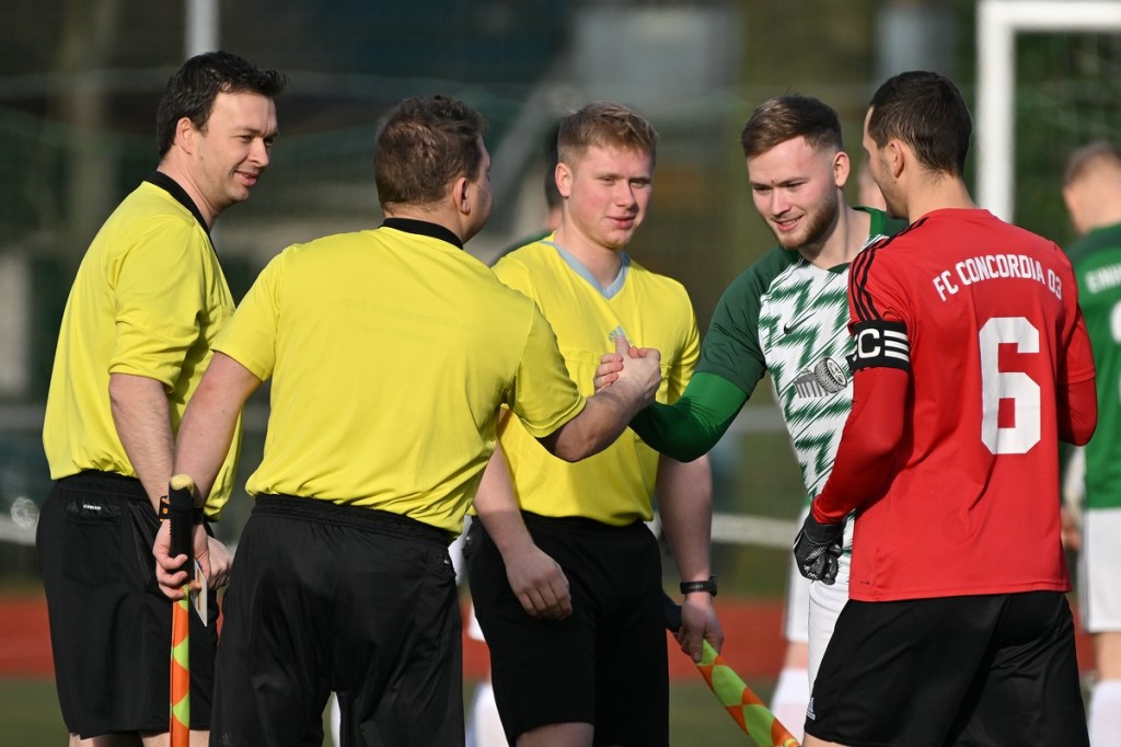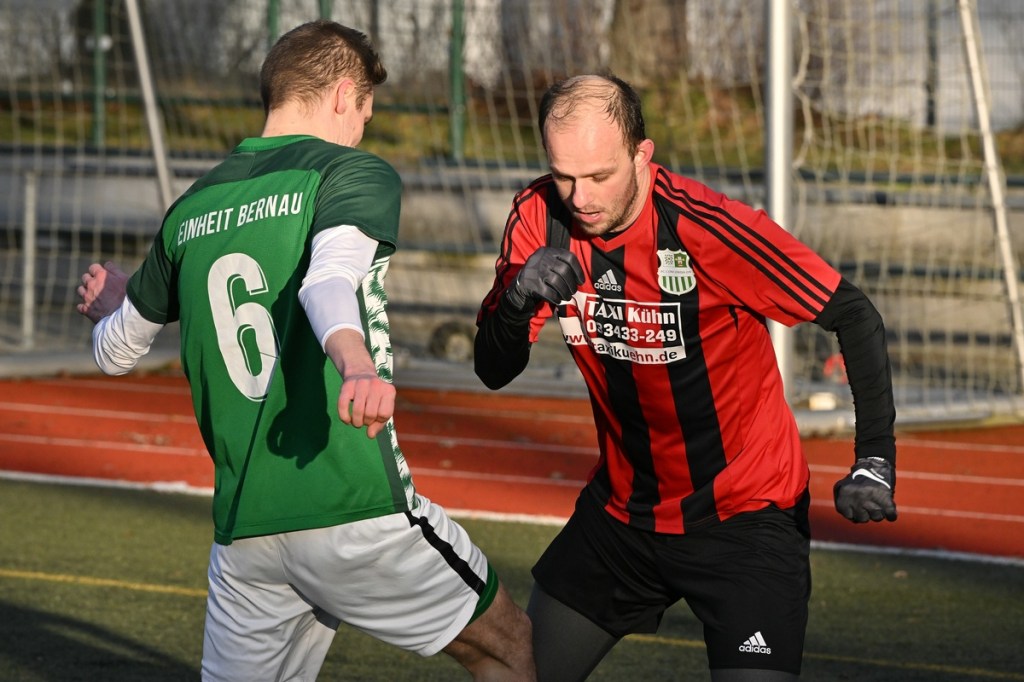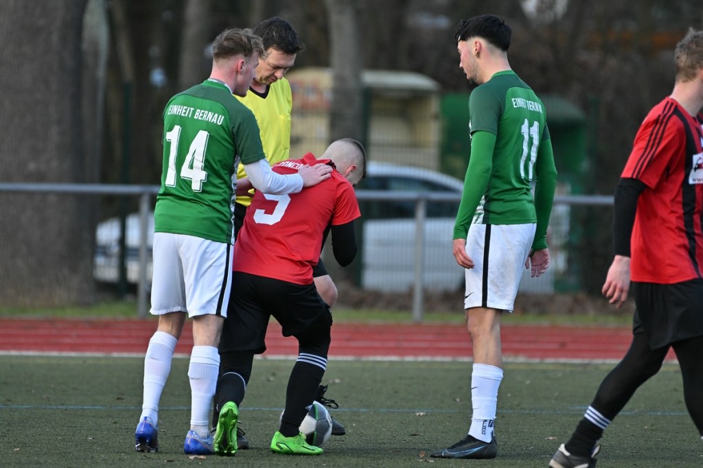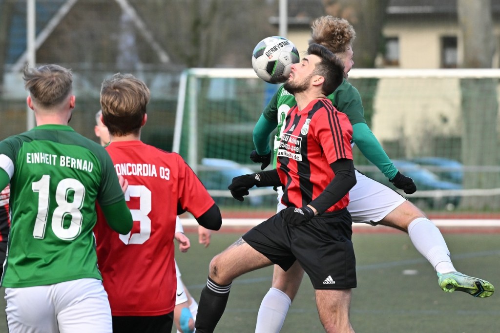 Wider erwartend begann die Partie sehr intensiv. Vor allem die Concorden machten mächtig Betrieb, gerade im Anlaufen und Pressing Richtung Aufbauversuche der Heimtruppe. Doch lahmte der ganze Aufwand am Ertrag, denn der blieb gänzlich aus. Einheit verteidigte sehr gut und probierte es in der Offensive mit langen Bällen, was ebenfalls nur in Ansätzen funktionierte. Trotzdem war die Begegnung nicht unansehnlich. Allein das „Gefighte“ im Mittelfeld hielt die Spannung am Laufen. Die erste nennenswerte Möglichkeit der Partie hatte Bernaus Lucas Steinert mit einem Freistoß, halb links vor dem Strafraum. Sein Schuss war gut platziert und rauschte knapp am linken Pfosten vorbei (23.). In der 31. Minute machte dann Bernau zum zweiten Mal in puncto Torgefährlichkeit von sich reden. Mario Farruku bekam an der Strafgrenze die Kugel aufgelegt, doch sein Abschluss war zu ungenau und landete in den Armen von Gästekeeper Dominik Vogt. Während sich die Doppeldörfler weiterhin vergebens mühten, etwas Positives im gegnerischen Strafraum zu erzeugen, war Einheit im Gegensatz gefährlicher unterwegs. Ein langer Abschlag kam bis in den Gästestrafraum durch, den Frederick Fiebig erlaufen auch konnte. Schlussendlich setzte er ein Geschoss ab, doch der spitze Winkel und der aufmerksame Vogt ließen die gute Möglichkeit verpuffen (35.). Für die Gäste dauerte es ganze zweiundvierzig Minuten, ehe man Zählbares auf die Platte bekam. Ein Freistoß von der linken Seite wurde abgewehrt. Christopher Fehrmann wurde zum Nutznießer, fackelte nicht lange und zog kurz vor Strafraumgrenze ab. „Zu unplatziert“, war das Resümee der Aktion, als der Ball in den Händen von Jarling landete (42.). Bartosz Barandowski beendete die torlose Halbzeit, als er ebenfalls glücklos abzog und wiederum der Einheit-Torsteher seine Hände abwehrend im Spiel hatte (42.).