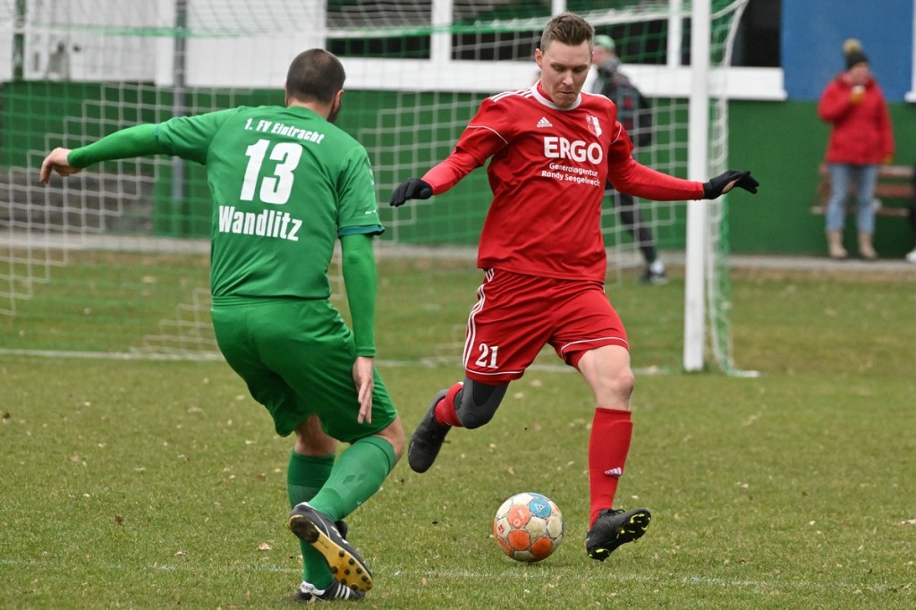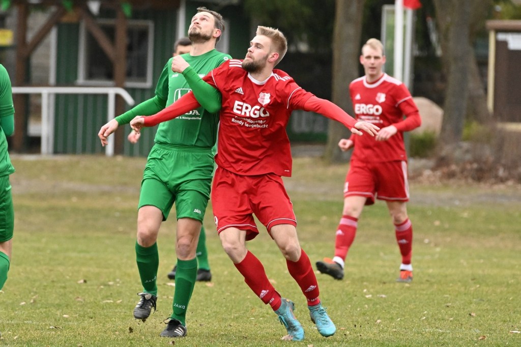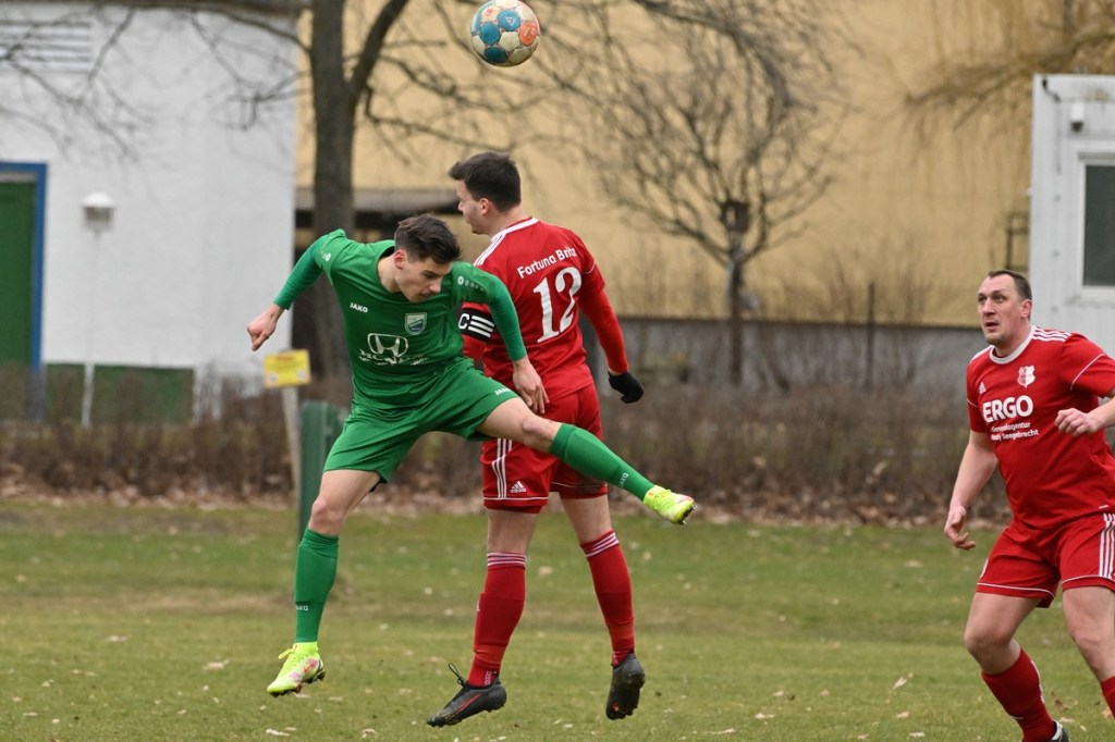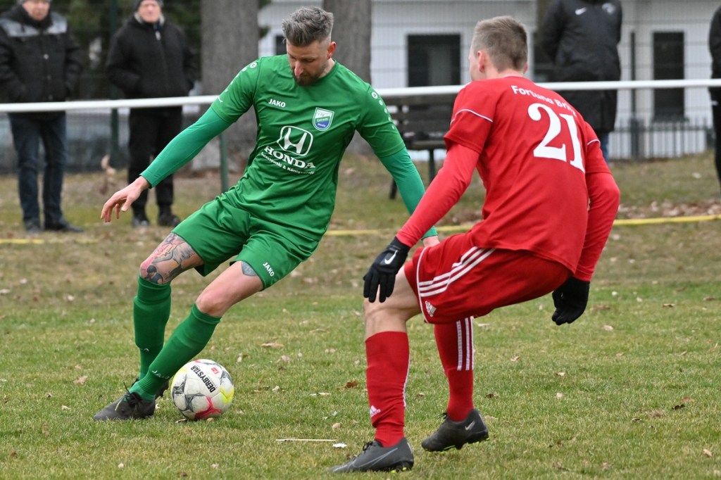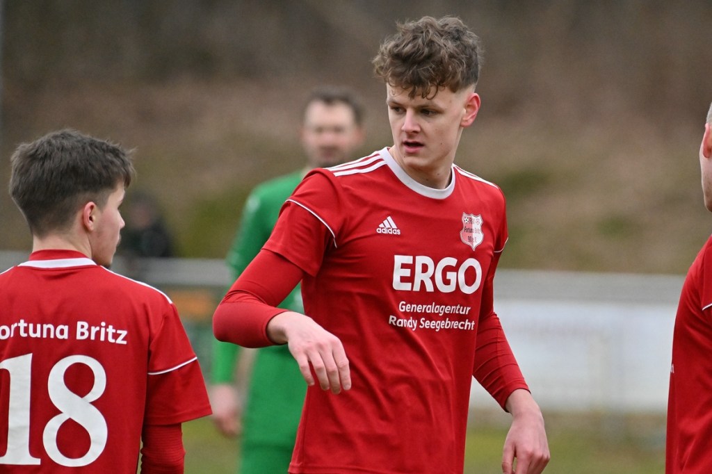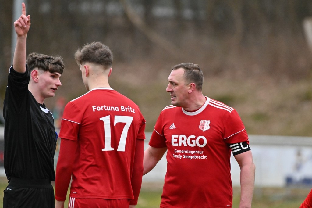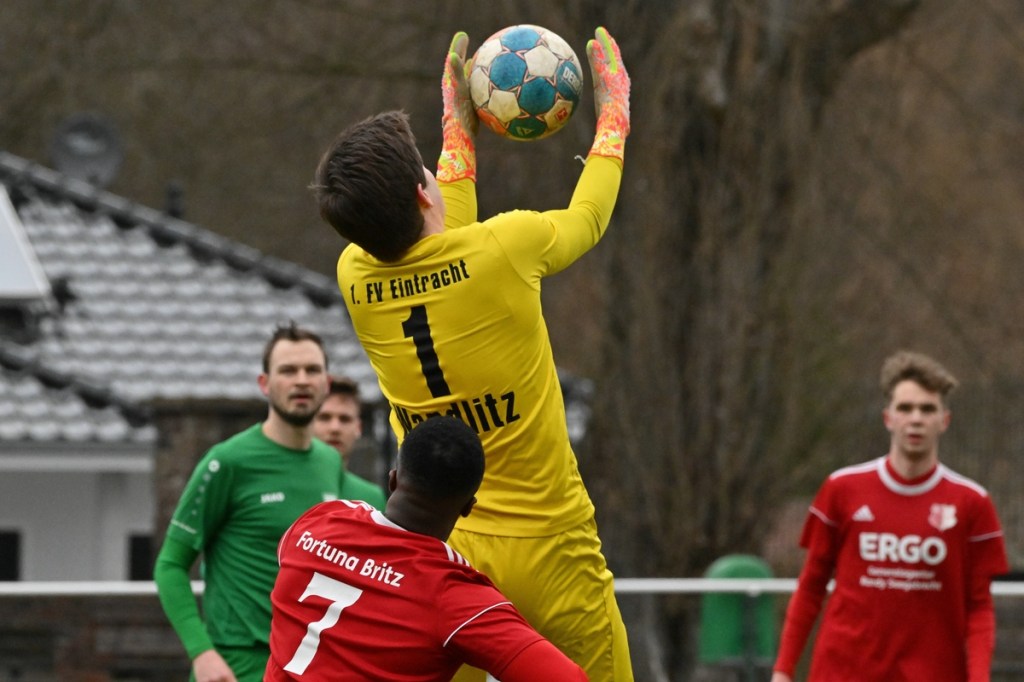 Trotzdem begann die Partie widererwartend mit spielerischen Nuancen, weil auch beide Parteien den Vorwärtsgang suchten und mit frühem Pressing Richtung „Schneid abkaufen“ unterwegs waren. Eintracht übernahm zusehends die Regie. „Im letzten Drittel sind wir einfach zu harmlos“, kritisierte Händler im Nachgespräch die inkonsequenten Offensivbemühungen seiner Jungs und traf damit genau in die Wandlitzer Wunde. Denn in der eigenen Chancen-Kreation und auch Verwertung blieb man unter den Erwartungen und durchaus vorhandenen Möglichkeiten. So war es Paul Roller mit einem Versuch in der siebten Minute, welcher weit über den Kasten ging (6.). Und auch sein Kollege Roman Schmidt machte es keine sechzig Sekunden später nicht besser, als er aussichtsreich die Kugel knapp neben den Kasten setzte. Britz, im Gegensatz, kam mit langen Bällen zu sporadischen Abschlüssen. Nennenswert waren dabei die beiden Möglichkeiten von Lukas Schneider, denen man schon getrost den Prozentsatz, der fast Hundertprozentigen, hätte verleihen können (11., 20.). Spielerisch flaute das Dargebotene immer mehr ab. Leidenschaft und Rasse schoben die Partie immer mehr in den Kampfmodus. Dabei waren die Kopfball-Duelle der beiden Routiniers Paul Roller und Manuel Müller schon eine Augenweide. Die Zweikämpfe wurden immer knackiger, was in der 24. Minute zu einer „hätte, wenn und aber“ Situation führte. Paul Roller wurde im Vorwärtsgang regelwidrig von den Beinen geholt, der fällige Pfiff blieb aus. Britz Nr. 7, David Whajah, war dann mit dem erkämpften Ball unterwegs. In der Gemeinschaftsaktion, Dennis Plaumann und Roman Schmidt, wurde Whajah recht rustikal abgeräumt, was ihn darauf regierend veranlasste Plaumann umzustoßen. Glatt Rot war die logische Konsequenz (24.). Ein Bärendienst, den auch der Britz-Übungsleiter so ein wenig zum Knackpunkt der Partie ausmachte. „Wir mussten umstellen, was uns nun so ein wenig am frühen Anlaufen hinderte“, erklärte Jürgens nach Spielende. Das Spiel zog nochmal an. Viele Nicklichkeiten, das ein oder andere unnötige Foulspiel und auch die vielen Fehler im Zusammenspiel machten die ganze Spielflüssigkeit noch zäher. Ein Schuss von Eintracht-Youngster Felix Arndt aus der zweiten Reihe, welcher lange unterwegs und vor allem haltbar war, bereitete dem Gäste-Keeper Kevin Wilkesmann doch einige Probleme. Bei Herunterfischen rutschte ihm das Spielgerät aus der Hand und prallte von linken Pfosten ins Aus (31.). In der 39. Minute war es dann so weit. Roman Schmidt hatte das Tor des Tages erzielt. Nachdem sich zwei seiner Kollegen mit Abschlüssen vergeblich versucht hatten und Fortuna nicht in der Lage war, klärend einzuwirken, war es ihm vorbehalten, mit dem Willen des Erzwingens unhaltbar per Gewaltschuss aus zehn Metern einzunetzen.