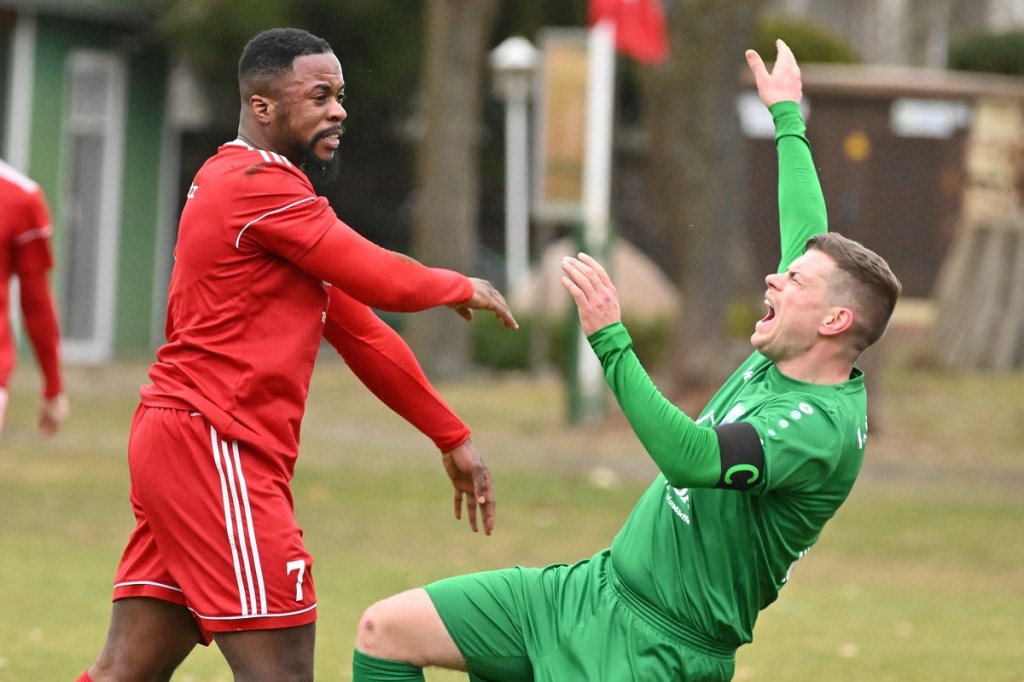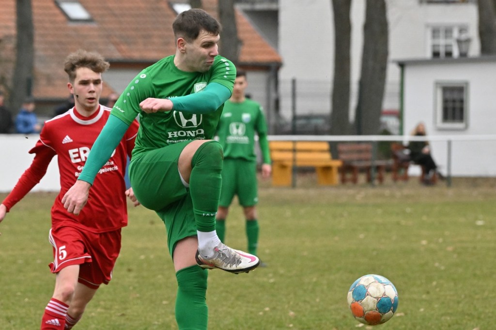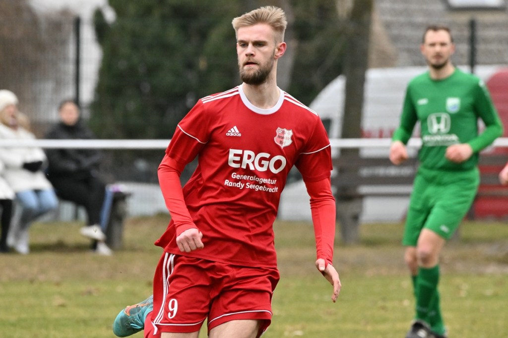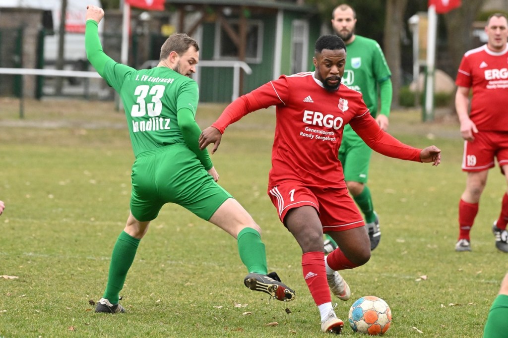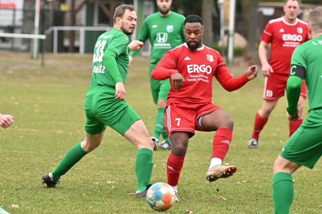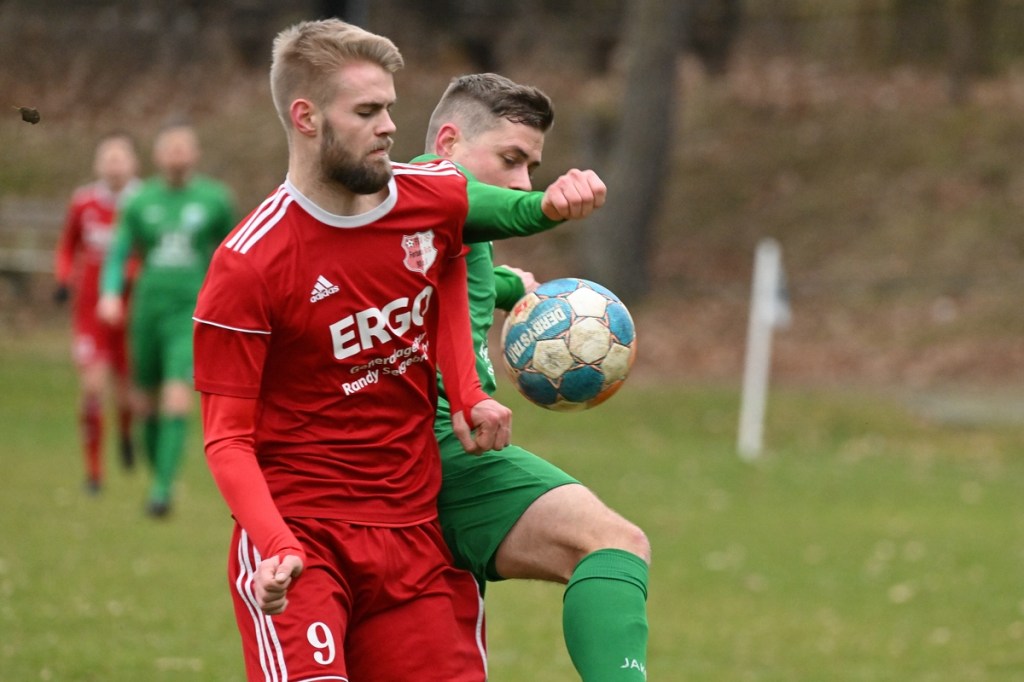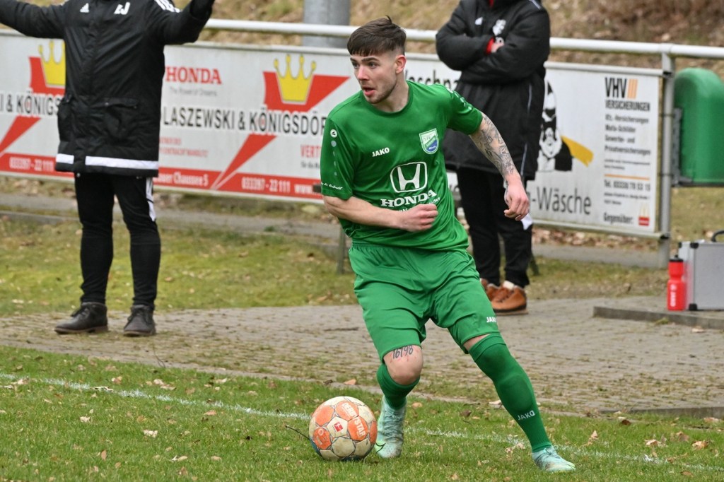 Trotzdem begann die Partie widererwartend mit spielerischen Nuancen, weil auch beide Parteien den Vorwärtsgang suchten und mit frühem Pressing Richtung „Schneid abkaufen“ unterwegs waren. Eintracht übernahm zusehends die Regie. „Im letzten Drittel sind wir einfach zu harmlos“, kritisierte Händler im Nachgespräch die inkonsequenten Offensivbemühungen seiner Jungs und traf damit genau in die Wandlitzer Wunde. Denn in der eigenen Chancen-Kreation und auch Verwertung blieb man unter den Erwartungen und durchaus vorhandenen Möglichkeiten. So war es Paul Roller mit einem Versuch in der siebten Minute, welcher weit über den Kasten ging (6.). Und auch sein Kollege Roman Schmidt machte es keine sechzig Sekunden später nicht besser, als er aussichtsreich die Kugel knapp neben den Kasten setzte. Britz, im Gegensatz, kam mit langen Bällen zu sporadischen Abschlüssen. Nennenswert waren dabei die beiden Möglichkeiten von Lukas Schneider, denen man schon getrost den Prozentsatz, der fast Hundertprozentigen, hätte verleihen können (11., 20.). Spielerisch flaute das Dargebotene immer mehr ab. Leidenschaft und Rasse schoben die Partie immer mehr in den Kampfmodus. Dabei waren die Kopfball-Duelle der beiden Routiniers Paul Roller und Manuel Müller schon eine Augenweide. Die Zweikämpfe wurden immer knackiger, was in der 24. Minute zu einer „hätte, wenn und aber“ Situation führte. Paul Roller wurde im Vorwärtsgang regelwidrig von den Beinen geholt, der fällige Pfiff blieb aus. Britz Nr. 7, David Whajah, war dann mit dem erkämpften Ball unterwegs. In der Gemeinschaftsaktion, Dennis Plaumann und Roman Schmidt, wurde Whajah recht rustikal abgeräumt, was ihn darauf regierend veranlasste Plaumann umzustoßen. Glatt Rot war die logische Konsequenz (24.). Ein Bärendienst, den auch der Britz-Übungsleiter so ein wenig zum Knackpunkt der Partie ausmachte. „Wir mussten umstellen, was uns nun so ein wenig am frühen Anlaufen hinderte“, erklärte Jürgens nach Spielende. Das Spiel zog nochmal an. Viele Nicklichkeiten, das ein oder andere unnötige Foulspiel und auch die vielen Fehler im Zusammenspiel machten die ganze Spielflüssigkeit noch zäher. Ein Schuss von Eintracht-Youngster Felix Arndt aus der zweiten Reihe, welcher lange unterwegs und vor allem haltbar war, bereitete dem Gäste-Keeper Kevin Wilkesmann doch einige Probleme. Bei Herunterfischen rutschte ihm das Spielgerät aus der Hand und prallte von linken Pfosten ins Aus (31.). In der 39. Minute war es dann so weit. Roman Schmidt hatte das Tor des Tages erzielt. Nachdem sich zwei seiner Kollegen mit Abschlüssen vergeblich versucht hatten und Fortuna nicht in der Lage war, klärend einzuwirken, war es ihm vorbehalten, mit dem Willen des Erzwingens unhaltbar per Gewaltschuss aus zehn Metern einzunetzen.