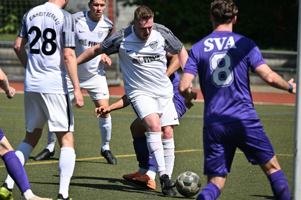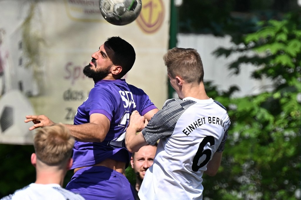 Die Partie brauchte, wie eigentlich immer auf dem Bernauer Kunstrasen, keine Aufwärmphase. Nach zwei Minuten war Gäste-Keeper Leon Dietrich das erste Mal gefordert. Ein Freistoß, den Fabian Buzdayev aus gut dreiundzwanzig Metern direkt auf den Kasten brachte, wehrte Dietrich mit guter Parade zur Ecke ab. Der daraus folgende Eckball von der rechten Seite zwang den Torsteher zum nächsten Eingreifen. Julian Graf war am langen Pfosten mit dem Kopf zur Stelle, doch diese Aktion war zu unplatziert und landete in den Armen von Dietrich (3.). In der 8. Minute zappelte das Spielgerät im Einheit-Kasten. Eine Kette von Unkonzentriertheiten und Lethargie im Zweikampfverhalten der Hausherren begünstigte das 0:1. Altlüdersdorf konnte über mehrere Stationen ohne große Gegenwehr den Ball an der Strafraumgrenze durchkombinieren. „Fuß vor“, war die lautstarke Anweisung von Thomaschewski an seine Hintermannschaft, die diese nicht umsetzte und schlussendlich einen Schuss aus dem Rückraum zuließ, den Ricky Okai Djan, wie abgefälscht, im Netz unterbrachte. Die Partie lebte in der Folge ausschließlich von der Spannung. Zwar übernahm Einheit immer mehr die Regie, doch auch wie das Gästeteam agierte man fehlerbehaftet, was die Begegnung schon oft sehr hektisch wirken ließ. Dem Fernschuss, den Bernaus Felix Glöckner in der 14. Minute abließ, folgte abgewehrt ein Eckball und daraus folgend eine hochprozentige Möglichkeit. Dabei zeigte sich Paul Peschke schon recht kläglich, als er es aus zwei Metern nicht schaffte, den Ball irgendwie über die Linie zu bringen. Die Gäste hingegen zuckten nur noch sporadisch in der Offensive und nutzten dabei das lapidare Abwehrverhalten der Hausherren rigoros aus. Eine Ecke, getreten von der rechten Seite, rauschte halbhoch in den Strafraum, wo Tobias Voelkel, vollkommen blank, nur noch den Fuß hinhalten brauchte und das nüchterne 0:2 herstellte (24.). Bernau arbeitete in der Folge am eigenen Torerfolg, doch die Strichliste der liegengelassenen Möglichkeiten, welche nebenbei erwähnt auch Nico Thomaschewski für sich führte, wurde immer länger. Fehlende Gallig- und Kaltschnäuzigkeit und zum Teil auch Verkomplizierung der Angriffsbemühungen verhinderten den Anschlusstreffer und auch einiges mehr.