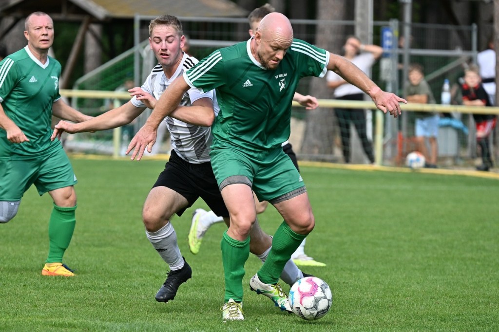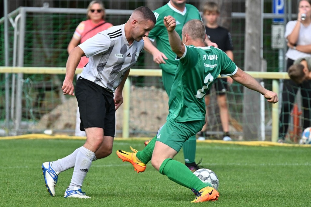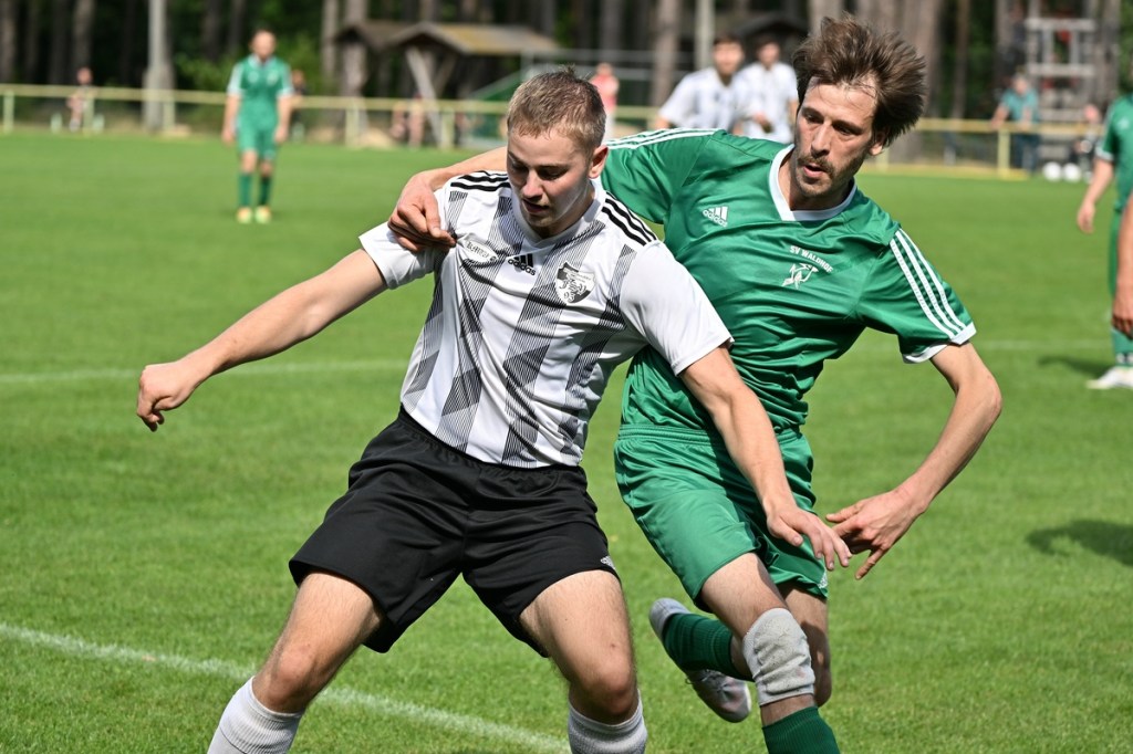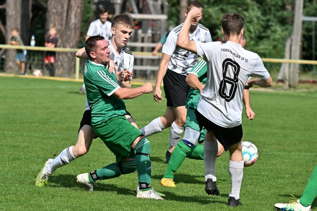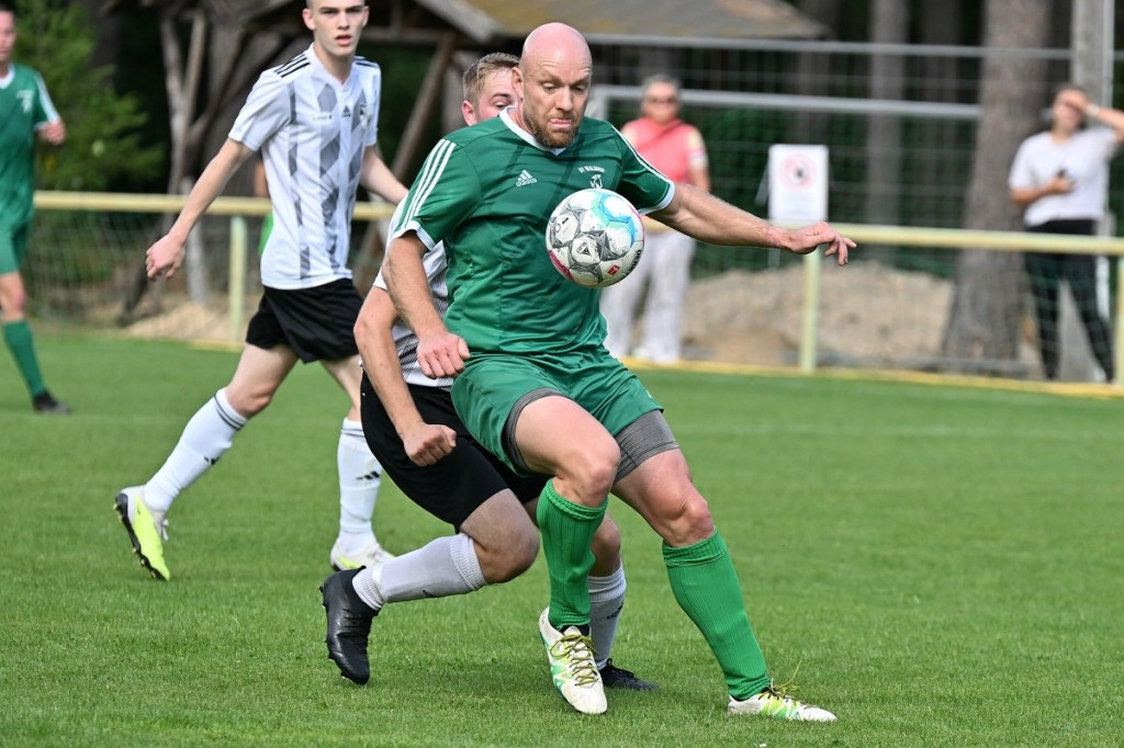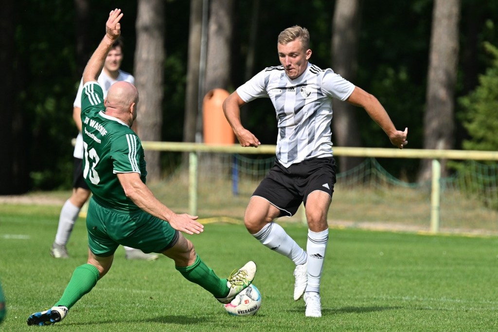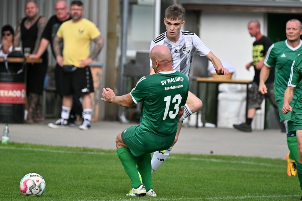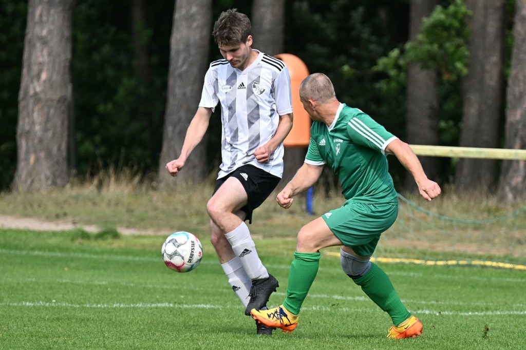 Die Partie begann mit einer sechsminütigen Belagerung der Hausherren rund um den Friedrichswalder Strafraum. Dabei zeigten die Waldhöfer, dass sie nicht nur ein tolles Geläuf haben, sondern dass auch Struktur gepaart mit Erfahrung in der Angriffsbemühungen zu qualitativ gutem Fußball führen kann. Eine Kette von Eckbällen ließ die Gäste kaum Luft holen. So war es Spechthausens Mannschaftskapitän mit der Nummer 6 (k.A.) der mit einem Lattentreffer in der 3. Minute die klare Ansage der Hausherren untermauerte. Friedrichswalde konnte von Glück reden, in den Anfangsminuten nicht mindestens die erste Bude kassiert zu haben. Zum ersten Mal zuckte die Gästeoffensive nach sechs Minuten, als Paul Bertram stramm aus der zweiten Reihe abzog und dabei Waldhof-Keeper Tom Freund in eine erfolgreiche Prüfung schickte. Trotzdem blieben die Spechthausener weiter im Vorwärtsgang und kamen durch Robert Kreuzer zur frühen Führung. Eine softe Eingabe in den Strafraum verwertete Kreuzer sehenswert in Seitfallzieher-Manier und ließ sich dafür berechtigterweise feiern (9.). Waldhof knabberte weiter an der Ergebnis-Erhöhung, doch mehr als ein paar Halbchancen sprangen dabei nicht mehr heraus. Was den Angriffsbemühungen an Überzeugung fehlte, war die Konsequenz und Kaltschnäuzigkeit. Dazu gesellte sich viel Hektik im Aufbau und eine gewisse Schludrigkeit in der Zielfindung. Friedsrichwalde hingegen kam nun besser in die Partie, blieb aber weiterhin hinter den Erwartungen zurück. Als dann Mairbek Timirbulatov in der 18. Minute für die Heimtruppe nach einer Ecke per Kopfball auf 2:0 stellte, keimten für die Gäste keinen positiven Vorahnungen. Die Partie tauchte in der Folge immer mehr in die Rustikalität ab. Dabei lag der Grad des Überschreitens schon mehr bei der Heimmannschaft. Die Gäste waren zwar etwas besser im Spiel, agierten aber viel zu fehlerbehaftet in der Spieleröffnung. Spechthausen nahm die Einladungen an, blieb aber in der Konsequenz viel zu gastfreundlich. Letztendlich kam es so wie es kommen musste. Der auffälligste Gäste-Akteur, Paul Bertram, belohnte sich nach einigen Versuchen und erzielte in der 38. Minute den Anschlusstreffer. In der Entstehung des Treffers übersah aber Referee Niklas Peter Martitz eine klare Abseitsstellung, aus dessen der Pass zum Torschützen kam und dann das Tor erzielt wurde. Nur einhundertzwanzig Sekunden später lag der mögliche Zwei-Tore-Abstand förmlich in der Luft. Ein langer Ball auf Mairbek Timirbulatov brachte eine Eins-gegen-Eins-Situation, bei der dem Waldhöfer die Nerven versagten und den Ball schon recht kläglich neben den Kasten seinen Weg ins Aus fand. Den Schlusspunkt des ersten Durchganges setzte Paul Bertram. Doch er hatte doppelt Pech. Zum Ersten blieb sein Schuss mit händischer Unterstützung am liegenden Waldhöfer Jan-Ole Boness hängen und zum Zweiten blieb der fällige Hand-Strafstoßpfiff aus (44.).
