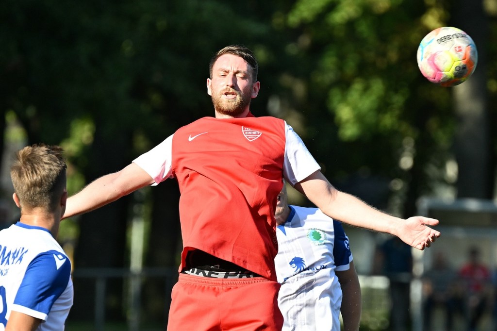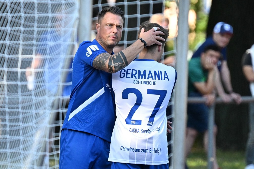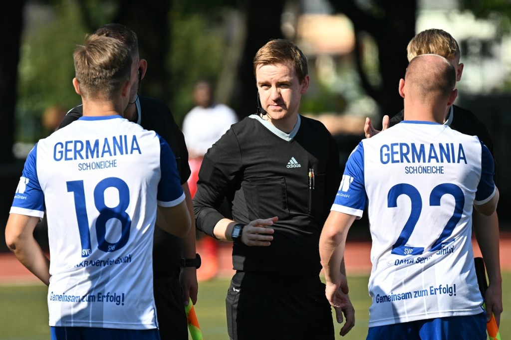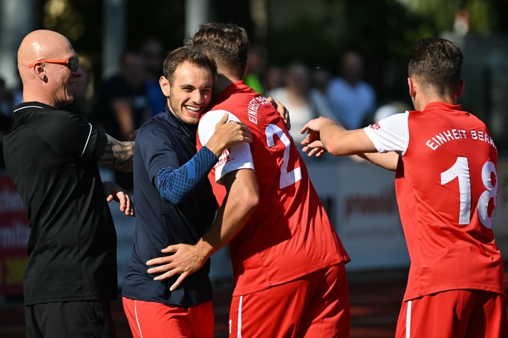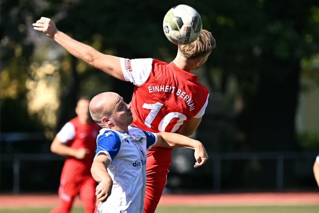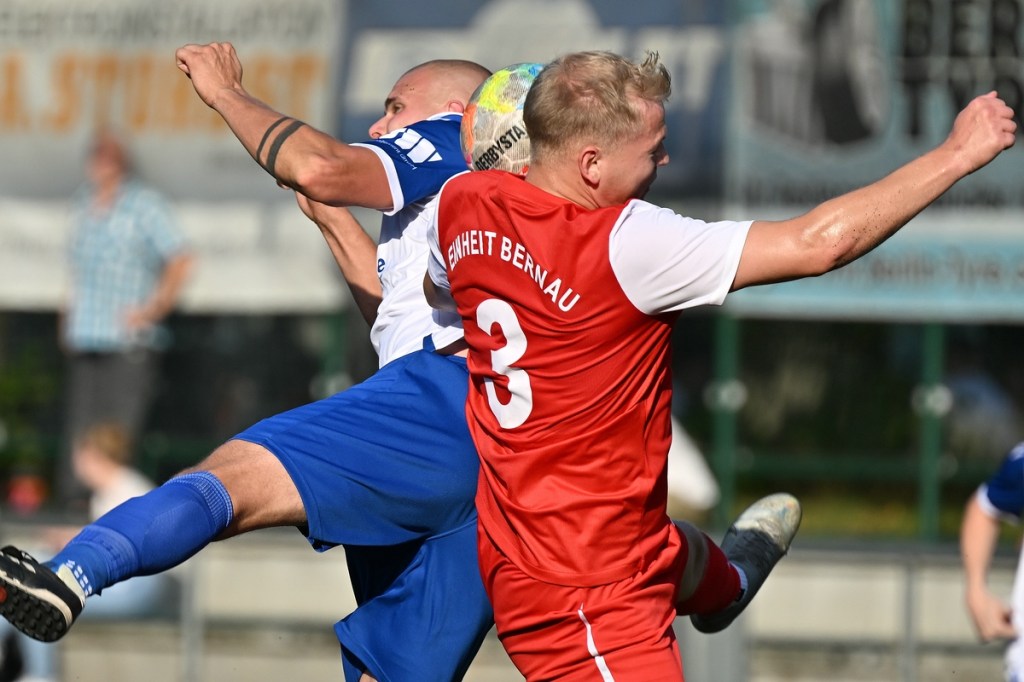 Der Wiederanpfiff war kaum verhallt, da hatte Wiedenhöft wiederum maßgenommen. Aus gut zwanzig Metern, mit Schmackes draufgehalten, ging der Ball knapp über das Tor (46.). Die Begegnung zog nun merklich an. Germania erhöhte den Druck und kam verstärkt zu Möglichkeiten. Erst war es Max Hühne, der das Lattenkreuz aus Nahdistanz auf Festigkeit testete (47.), dann tat ihm Richard Bergmann gleich und nagelte ebenfalls das Spielgerät ans gekreuzte Gebälk (52.). „Das hatten wir schon Match-Glück“, brachte es Tomaschewski auf den Punkt und musste in der Folge seine Jungs verbal mit Anweisungen stärker unterstützen. Aber auch Schiedsrichter Andy Schmidt war gefordert, den aufkommenden, negativ anhauchten Spielcharakter etwas mehr Ordnung zu verschaffen. Chancen technisch blieben die Gäste weiter in der Oberhand und kratzen intensiv am Anschlusstreffer. Den hatte der agile Max Hühne wiederholt auf den Schlappen, doch die Ungenauigkeit zog weiterhin ihre Kreise (61.). Der Ball, den Felix Wiedenhöft aus der Ferne in den Strafraum jagte und der im nachsetzenden Gewühl an die Hand des sich am Boden abstützenden Fritz Söllner prallte, sollte aus Gästesicht einen Strafstoß nach sich ziehen. Doch Referee Schmidt hatte gute Sicht und ließ der Regel folgend das Spiel weiterlaufen (64.). Den dritten Alu-Treffer markierte Max Mulack für seine Germanen aus achtzehn Metern, als das Spielgerät leicht abgefälscht den rechten Außenpfosten touchierte (76.). Die Zeit agierte jetzt gegen die Gäste. Bernau brauchte bis zur 78. Minute für die erste eine nennenswerte Chance in Halbzeit zwei. Diese hatte Lucas Müller per Kopfball mit dem Resultat der knappen Torverfehlung (78.). Dass Einheit auch Aluminium konnte, bewies Tom Schneider mit seinem präzisen Freistoßschlenzer in der 87. Minute. Den Schlusspunkt der Partie und auch ein Sinnbild des Gästeauftrittes war der Abschluss von Tom Ney, der aus Nahdistanz mit allen Möglichkeiten behaftet die Kugel neben den Kasten setzte (90.+2). „Ich denke, unverdient war der Erfolg heute nicht. Wir waren halt sehr effizient, was uns in der Vergangenheit nicht immer gelungen ist. Momentan kommen wir halt mehr über den Kampf und die mannschaftliche Geschlossenheit, und das macht mich schon sehr froh, dass dies so gut funktioniert“, analysierte Tomaschewski im Nachgang und resümierte weiter über den Saisonstart. „Von den Ergebnissen her bin ich sehr zufrieden. Ich würde mir halt wünschen, dass der Fokus wieder mehr auf den Fußball an sich läge. Eine Vorbereitungsphase, in der die Spieler aus den verschiedensten Gründen nicht anwesend sein können, ist nicht optimal. Aber das ist heute so und damit muss man sich halt arrangieren.“