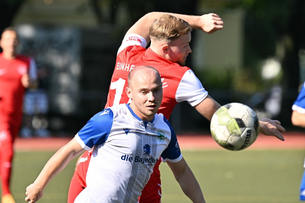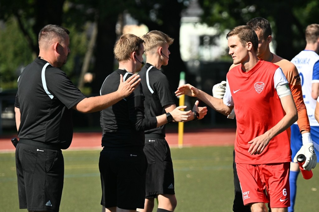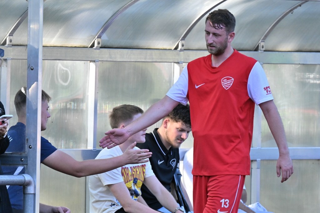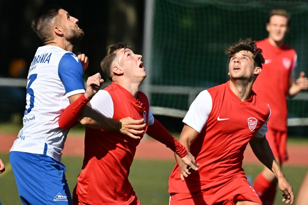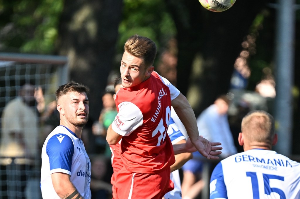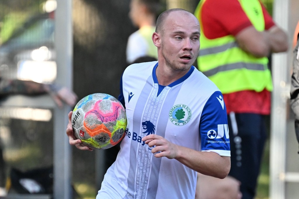 Der Wiederanpfiff war kaum verhallt, da hatte Wiedenhöft wiederum maßgenommen. Aus gut zwanzig Metern, mit Schmackes draufgehalten, ging der Ball knapp über das Tor (46.). Die Begegnung zog nun merklich an. Germania erhöhte den Druck und kam verstärkt zu Möglichkeiten. Erst war es Max Hühne, der das Lattenkreuz aus Nahdistanz auf Festigkeit testete (47.), dann tat ihm Richard Bergmann gleich und nagelte ebenfalls das Spielgerät ans gekreuzte Gebälk (52.). „Das hatten wir schon Match-Glück“, brachte es Tomaschewski auf den Punkt und musste in der Folge seine Jungs verbal mit Anweisungen stärker unterstützen. Aber auch Schiedsrichter Andy Schmidt war gefordert, den aufkommenden, negativ anhauchten Spielcharakter etwas mehr Ordnung zu verschaffen. Chancen technisch blieben die Gäste weiter in der Oberhand und kratzen intensiv am Anschlusstreffer. Den hatte der agile Max Hühne wiederholt auf den Schlappen, doch die Ungenauigkeit zog weiterhin ihre Kreise (61.). Der Ball, den Felix Wiedenhöft aus der Ferne in den Strafraum jagte und der im nachsetzenden Gewühl an die Hand des sich am Boden abstützenden Fritz Söllner prallte, sollte aus Gästesicht einen Strafstoß nach sich ziehen. Doch Referee Schmidt hatte gute Sicht und ließ der Regel folgend das Spiel weiterlaufen (64.). Den dritten Alu-Treffer markierte Max Mulack für seine Germanen aus achtzehn Metern, als das Spielgerät leicht abgefälscht den rechten Außenpfosten touchierte (76.). Die Zeit agierte jetzt gegen die Gäste. Bernau brauchte bis zur 78. Minute für die erste eine nennenswerte Chance in Halbzeit zwei. Diese hatte Lucas Müller per Kopfball mit dem Resultat der knappen Torverfehlung (78.). Dass Einheit auch Aluminium konnte, bewies Tom Schneider mit seinem präzisen Freistoßschlenzer in der 87. Minute. Den Schlusspunkt der Partie und auch ein Sinnbild des Gästeauftrittes war der Abschluss von Tom Ney, der aus Nahdistanz mit allen Möglichkeiten behaftet die Kugel neben den Kasten setzte (90.+2). „Ich denke, unverdient war der Erfolg heute nicht. Wir waren halt sehr effizient, was uns in der Vergangenheit nicht immer gelungen ist. Momentan kommen wir halt mehr über den Kampf und die mannschaftliche Geschlossenheit, und das macht mich schon sehr froh, dass dies so gut funktioniert“, analysierte Tomaschewski im Nachgang und resümierte weiter über den Saisonstart. „Von den Ergebnissen her bin ich sehr zufrieden. Ich würde mir halt wünschen, dass der Fokus wieder mehr auf den Fußball an sich läge. Eine Vorbereitungsphase, in der die Spieler aus den verschiedensten Gründen nicht anwesend sein können, ist nicht optimal. Aber das ist heute so und damit muss man sich halt arrangieren.“