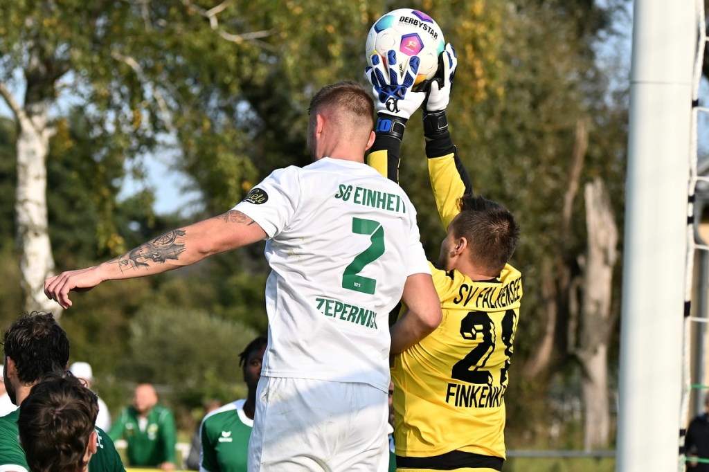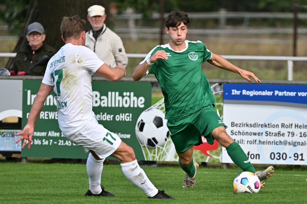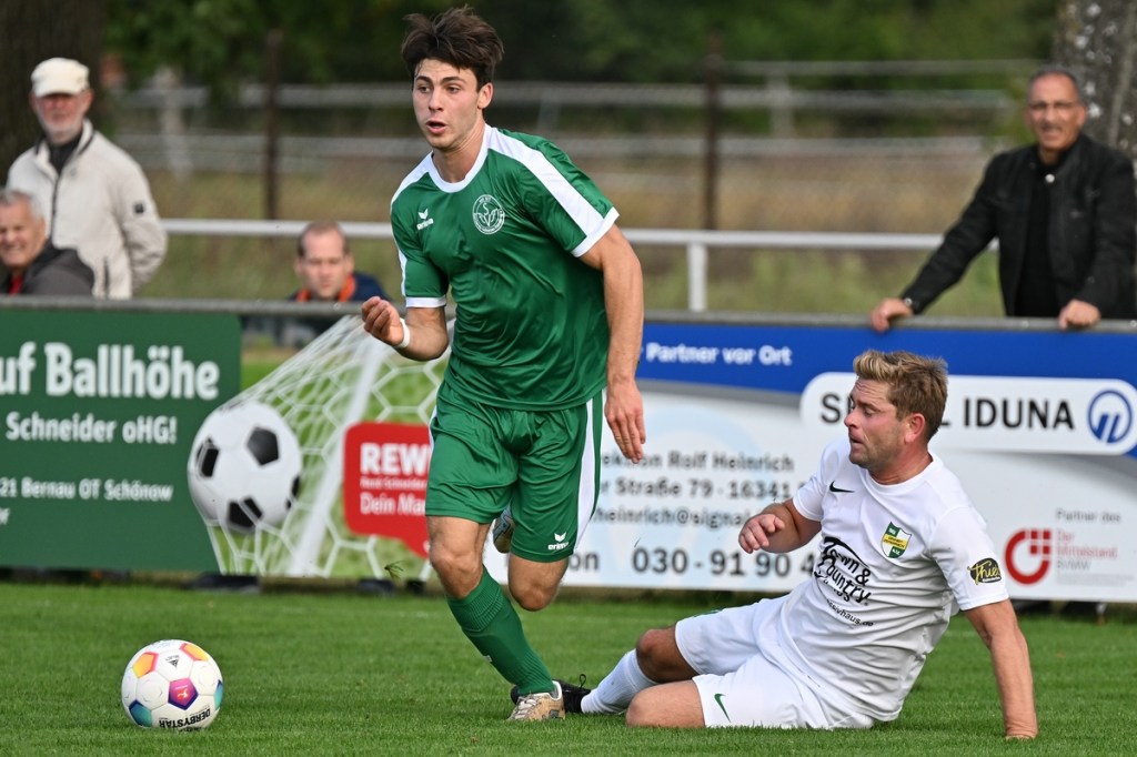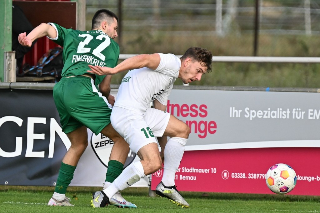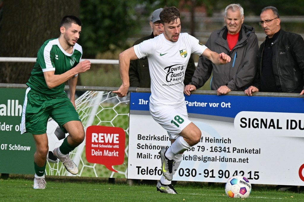 Dabei begann die Partie bei bestem Wetter auf einem Rasen, dem ein kürzerer Schnitt sichtbar gutgetan hätte, mit einer Gästemöglichkeit. Ein Freistoß, der lang in den Strafraum geschlagen und per Kopf verlängert wurde, brachte Cedric Burchardi in die Situation aus Nahdistanz einzuschieben. Doch Burchardi kam nicht richtig zum Ball, sodass die Kugel knapp am rechten Pfosten vorbei ins Aus ging (1.). Die Anfangsperiode zeigte schon an, mit welchen taktischen Marschrouten beide Teams ihre Agenda abarbeiteten. Während die Gäste vornehmlich mit langen Bällen operierten, zeigte sich die Einheit mit geduldiger und spielerischer Aufbauqualität. Fünf Minuten dauerte es, bis sich Tom Bittner als erster Zepernicker auf Strichliste der Abschlussmöglichkeiten eintragen ließ. Doch für eine klare Chance war der Winkel dann doch zu spitz, sodass die Spielfortsetzung „Abstoß“ lautete. Luca Grabarek versuchte es in der 10. Minute recht frei von der Strafraumgrenze. Sein strammes Geschoss wurde aber weggeblockt. Das 1:0 durch Phillip Opitz war in der Entstehung schon zum Zunge schnalzen. Ümit Ejder hatte die Kugel hinter die Abwehrreihe der Gäste gelupft und damit den durchgelaufenen Opitz bedient. Der zeigte sich im Abschluss kaltschnäuzig und ließ FF-Keeper Daniel Bittner nicht den Hauch einer Abwehrmöglichkeit (14.). Für Städing wurde die Folgezeit immer mehr zur Leidenszeit. Seine Jungs entfernten sich zunehmend von der Ligatauglichkeit und konnten eigentlich von Glück reden, dass die Heimtruppe erst einmal keine weiteren, aber durchaus möglichen Kapitalerträge auf die Habenseite bringen konnte. Für Zepernick war gegen tief stehende Gäste weiterhin Geduld gefragt. Doch die Gegenwehr für die Hausherren war so harmlos, dass es genug Alternativen gegeben hätte, um für mehr Torgefahr zu sorgen. Geschwindigkeit wäre ein probates Mittel gewesen, doch der Nichtgebrauch läutete eine elfminütige Leerlauf-Etappe ein. Beim 2:0 ließ Lesley Park den geschossenen Ball von der Strafraumgrenze flattern und Gäste-Torsteher Bittner nicht wirklich gut aussehen. Park kam frei zum Abschluss, nach dem er Nutznießer einer sehenswerten Ballstafette wurde (24.). Falkensee-Finkenkrug zuckte sporadisch im Vorwärtsgang, musste aber auch in diesem Bereich qualitative Abstriche in Kauf nehmen. Philip Opitz trug sich in der 32. Minute wiederholt in die Torschützenliste ein. Ein Larifari-Spielaufbau der Falkenseer wurde zum positiven Bumerang für Opitz, der nicht lange fackelte und unhaltbar einnetzte. Sechzig Sekunden später herrschte dann mal leichtes Chaos im Einheit-Strafraum. Doch auch daraus war kein Gäste-Guthaben zu erzielen, denn der Schuss von Hassan Oumari verkümmerte förmlich auf dem Weg zum Tor. Auch der Versuch aus der Ferne von Ole Oppermann brachte keine Gefahr für Heim-Torsteher Dennis Tietz (44.).