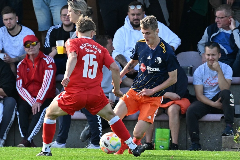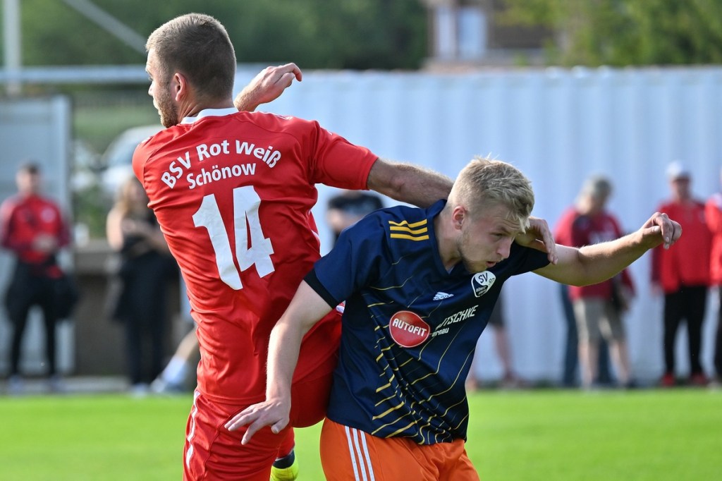 Die Körpersprache und der Einsatzwille der Hausherren in den Anfangsminuten zeigten schon an, was auf Schönow zu kommen könnte. Eingeleitete Angriffe und gewonnene Zweikämpfe wurden zum Torabschluss gebracht, die aber aufgrund der Ungenauigkeit noch in die Kategorie der Halbchancen passten. Die erste richtige Möglichkeit hatte Rüdnitz/Lobetals Maximilian Degen auf den Schlappen, als er aus dem Halbfeld diagonal angespielt wurde, in eine Eins-gegen-Eins-Situation mit Gäste-Torsteher Johannes Weinrich kam und dabei unterlag. Im Gegenzug ließ es Schönow im gegnerischen Strafraum brennen, schlussendlich aber auch ohne zählbare Wirkung. Rot-Weiß hatte in der Folge die Partie so ein wenig an sich gerissen, ohne aber in die Überzeugung zu kommen. Diese hatte auch Paul Paasche mehrmals von seinen Kollegen eingefordert, doch dem Willen dazu fehlte jegliche sichtbare Reaktion. Rüdnitz/Lobetal hingegen hatte sich mehr und mehr auf Konter eingeschworen und diese auch recht gefährlich zelebriert. Und damit hatten die Gäste auch so ihre Probleme. Doch irgendwie bekam die Brösel-Truppe diese Mängel immer wieder wegverteidigt. Die Partie lebte nur von der Spannung, in der sich auch reichlich Zerfahrenheit einschlich und es dadurch kaum Höhepunkte gab. Ein paar knackige Zweikämpfe, die bei Balleroberung zu schnell wieder hergegeben wurden, bestimmten ebenfalls die Szenerie. So dauerte es bis zur 20. Minute, ehe Schönow, zumindest etwas Nennenswertes, auf den gehüteten Kasten von Marvin Senz bekam. Rik Roelofs hatte die Stirn nach Flanke von der linken Seite hingehalten und dabei sein Ziel doch recht eindeutig verfehlt. Die Konterwelle der Hausherren ebbte immer mehr ab. Rot-Weiß belagerte die gegnerische Hälfte, aber mit fehlender Struktur und wenn es dann mal zum Abschluss kam, ohne Präzision und Kaltschnäuzigkeit. Tief durchatmen musste man auf Gästeseite, als ein Freistoß der Doppeldörfler aus dem linken Halbfeld in Gemeinschaftsproduktion per Kopf geklärt, dann aber Maximilian Degen aufgelegt wurde. Degen fackelte nicht lange, zog stramm ab, musste sich dann aber ärgern, dass der Ball knapp oberhalb des Quergebälks ins Aus ging (24.). Mit dem 1:0 nach 34. Minuten rächte sich so ein wenig der lapidare und nicht inspirierende Gäste-Auftritt. Einen unnötigen Ballverlust münzten die Hausherren hellwach in ein Anspiel auf Maximilian Degen um, der dann abgezockt die Kugel im Netz unterbrachte. Die Freude war schon riesengroß, hatte aber nur einhundertzwanzig Sekunden Bestand. Ein Gäste-Freistoß aus dem rechten Halbfeld verwertete Stefan Schulz eingelaufen am langen Pfosten mit Unterstützung des Innenpfostens. Doch damit nicht genug. In Hallo-Wach-Manier drehte Schönow in der 38. Minute die Partie und dies nicht mal unverdient, weil Effizienz auch zu den Meriten des Erfolges gehören kann. Einen lang geschlagenen Flankenball brachte Rik Roelofs per Kopfball zurück in den Fünfmeterraum, welchen sein Mitstreiter Maximilian Bachnick, ebenfalls mit der Stirn, platziert im Netz versenkte. Den Nackenschlag verdaute Rüdnitz/Lobetal zunächst mit einem vielversprechenden Konter, aber ohne zählbaren Ertrag. Schönow hingegen gab die Führung etwas mehr Struktur im Vorwärtsgang und konnte mit dieser Erkenntnis den Gang in die Halbzeitpause antreten.