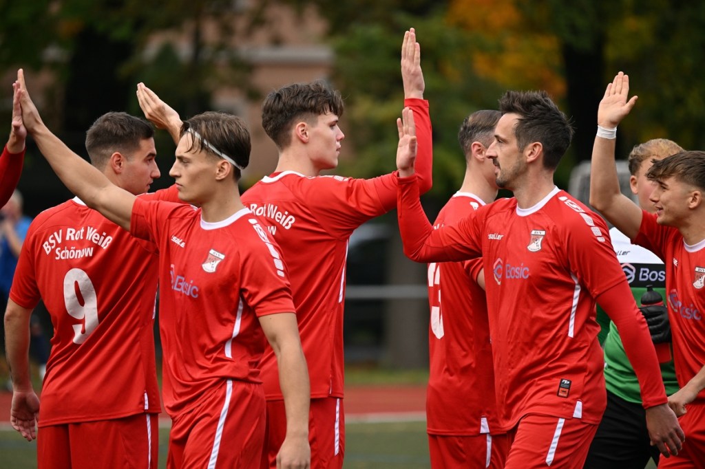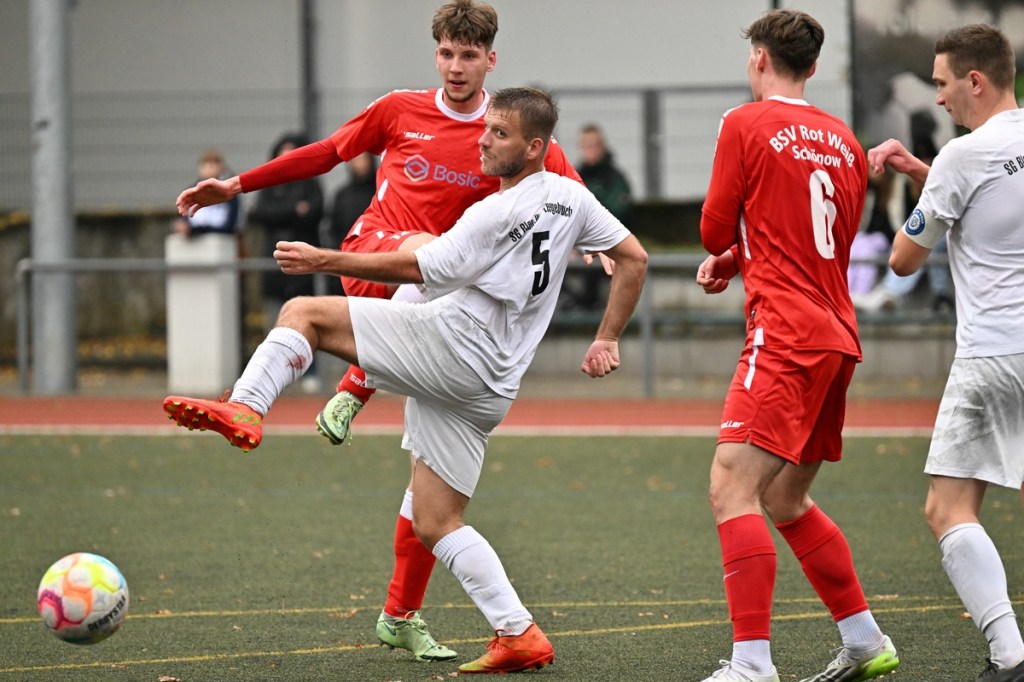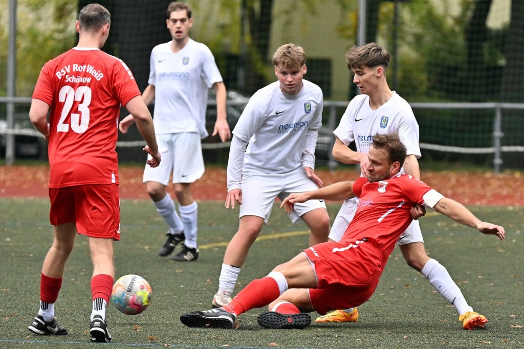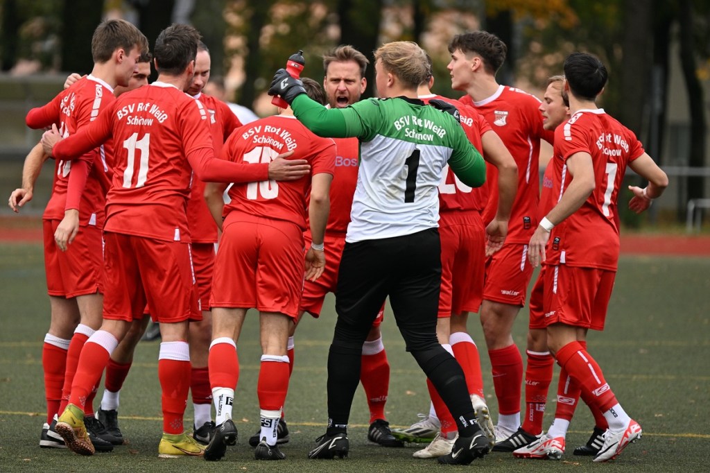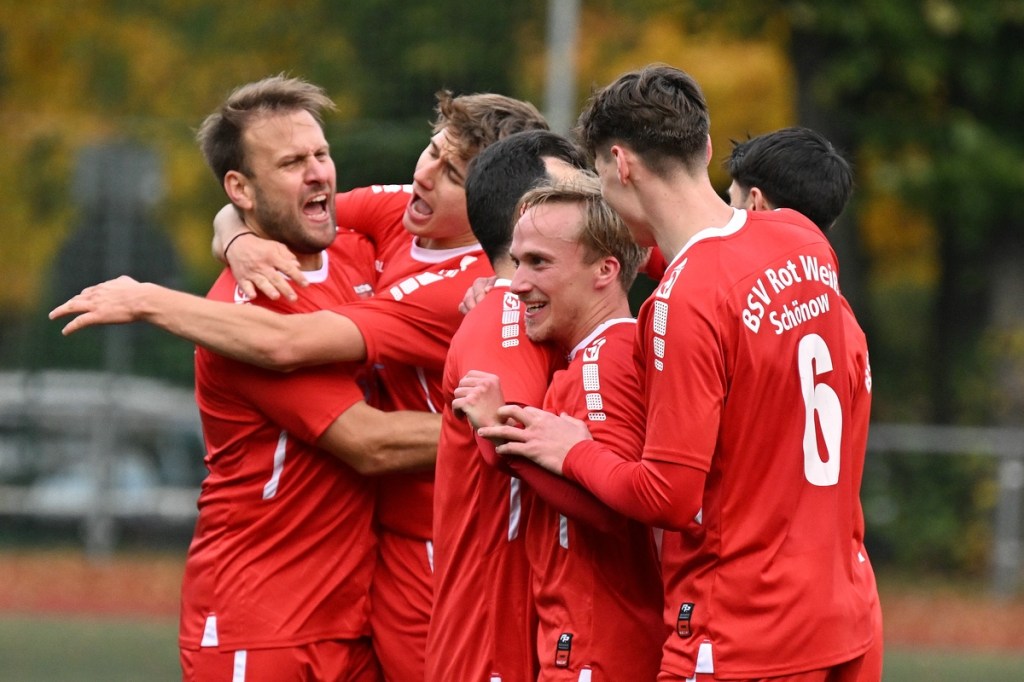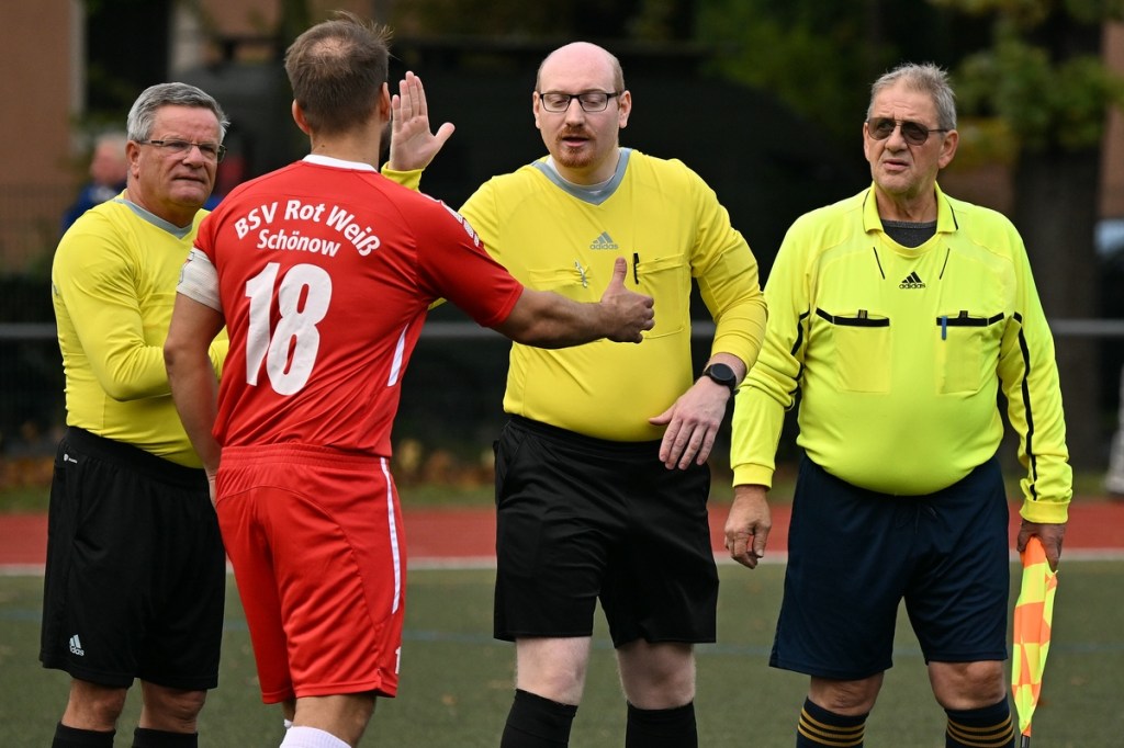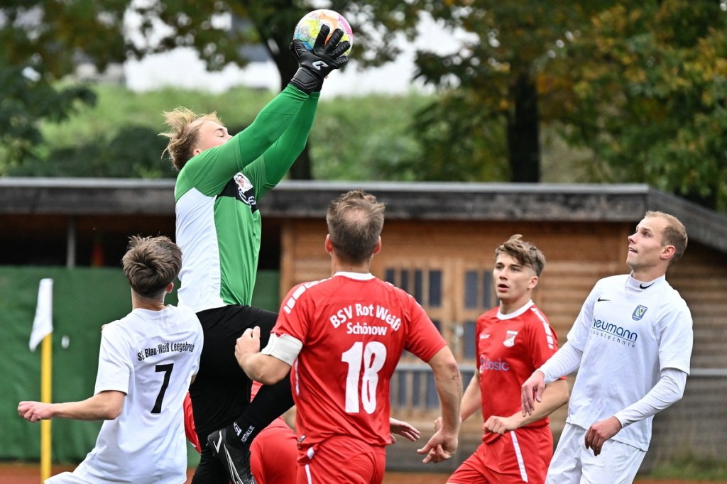 Von Beginn an wurde jeder Meter zwischen den Strafräumen bearbeitet und dies auch in positiver spielerischer Qualität. Gerade die ersten zehn Minuten war das Level auf Augenhöhe mit je einer Möglichkeit ein Rauchzeichen zu setzen. Erst war es der Schönower Youngster Iven Eckardt, der Gäste-Keeper Robin Joseph Reschke aus achtzehn Metern prüfte (3.). Auf der anderen Seite probierte es Paul Haase ebenfalls mit einem Schuss aus der zweiten Reihe, bei dem sich Johannes Weinrich als RW-Torhüter schon etwas mehr strecken musste (4.). Das 1:0, erzielt durch Maximilian Bachnick, untermauerte schon die nun vorherrschenden Machtverhältnisse. Leegebruch konnte einen Tempovorstoß der Hausherren nicht unterbinden, genau wie das Anspiel auf Bachnick, der sein Laufduell ungehindert gewann und souverän einnetzte (12.). Die Partie blieb intensiv, mit Vorteilen auf der Heimseite. Gerade im Gegenpressing und in den Zweikämpfen war Schönow oft doppelt unterwegs und dabei auch recht erfolgreich. Leegebruch war in der Offensive mit Diagonalpass-Versuchen unterwegs, welche doch recht einfach zu verteidigen waren. Die Möglichkeit durch Christoph Spitze, der an der Gästestrafraumkante den Ball mit dem Rücken zum Tor annahm und dann per Seitfallzieher aufs Tor brachte, war dann doch nur für die Galerie, weil schlussendlich die große Gefahr fehlte (18.). Genau in die Rot-Weiße Druckphase wurde das erste Geschenk an die Gäste verteilt. Stümperhaft wurde eine Abwehrsituation genau vor die Füße von Paul Haase geklärt, der die Bestrafung folgen ließ und aus zehn Metern unhaltbar ins Netz traf (23.). Das Spiel fesselte weiterhin, obwohl in den Strafräumen nicht allzu viel passierte. Als dann Schönows Nico Brauer in der 32. Minute Bennet Müller an der Außenlinie im Niemandsland abräumte, weil er einfach zu spät kam, wurde es das erste Mal emotional etwas knackiger. Schiedsrichter Christopher Witte bestrafte die Aktion nachvollziehbar mit dem gelben Karton und setzte verbal noch ein Zeichen an den Täter, knapp am Platzverweis vorbeigeschrammt zu sein. Für Bennet Müller ging es nicht mehr weiter, für ihn kam Mats Wenzke. Ein Konter der Hausherren und ein Dribbling von Iven Eckardt, der einige seiner Gegenspieler schlecht aussehen ließ, endete mit einem Zufall bringen im Gästestrafraum und der Referee-Entscheidung einen Strafstoß zu verhängen. „Für mich war das kein Elfer“, hatte Gäste-Coach Kevin Schulz den Situationsbeschluss moniert und dabei schon etwas frustriert gewirkt. Nico Brauer, der im Übrigen wegen seiner Platzverweisgefahr in der 41. Minute ausgetauscht wurde, übernahm die Verantwortung und ließ Reschke mit sehr platziertem Einschlag keine Abwehrchance (36.). Einhundertachtzig Sekunden später riss das lapidare Abwehrverhaltensmuster der Hausherren das gerade aufgebaute stabile Kartenhaus wieder ein. Es war im Endeffekt eine Blaupause des ersten Gegentreffers, bei der Paul Haase wiederholt zum Nutznießer wurde und frei einschießen konnte. Praktisch mit dem Halbzeitpfiff lag die erneute Führung der Hausherren in der Luft. Ein Diagonalpass aus dem Lehrbruch auf den eingelaufenen Iven Eckardt wurde zur hochprozentigen Möglichkeit. Doch Eckardts Stirn setzte den Ball knapp neben den Kasten, was dem Unterfangen schon ein wenig Kläglichkeit einhauchte.