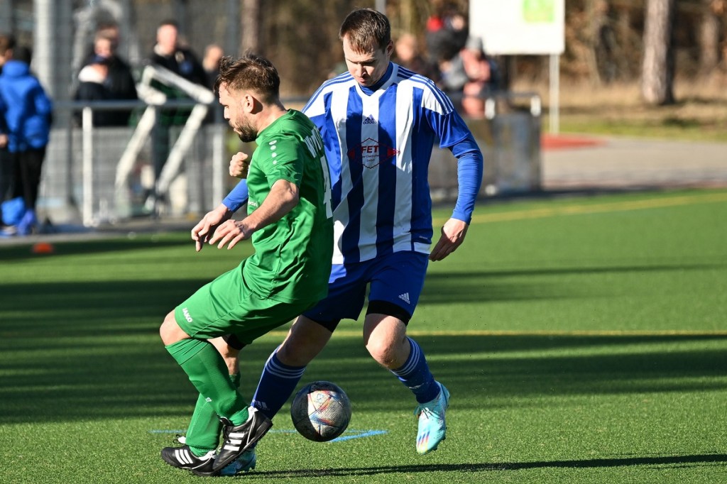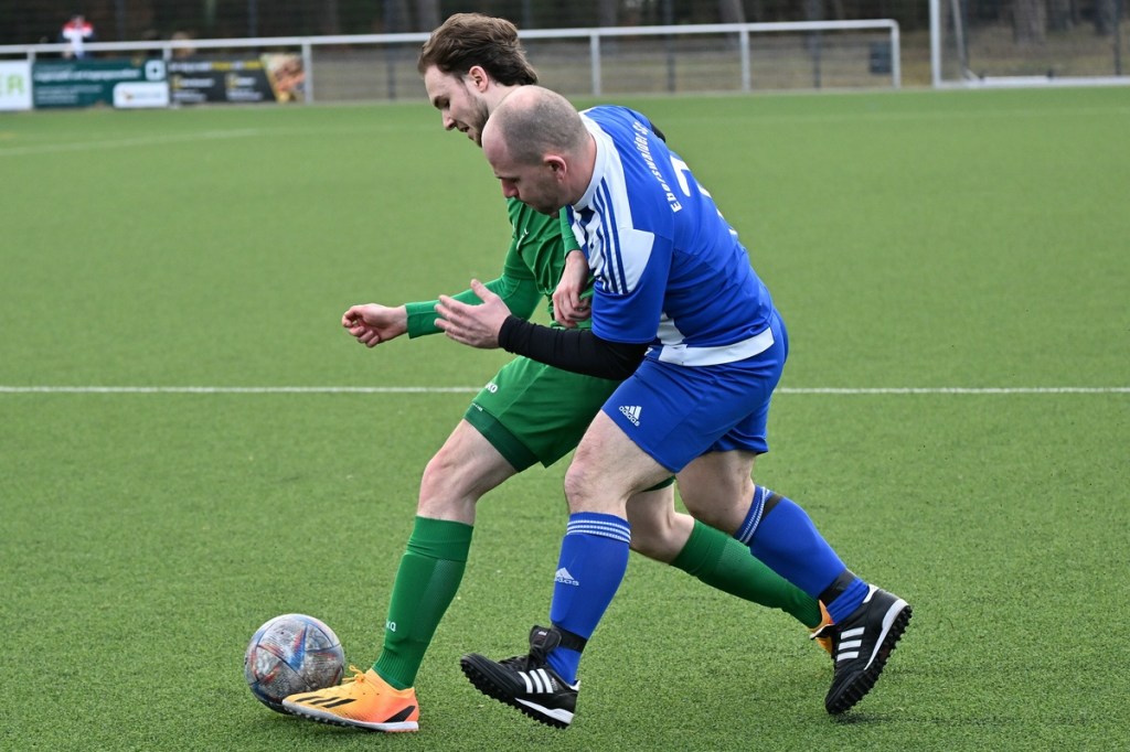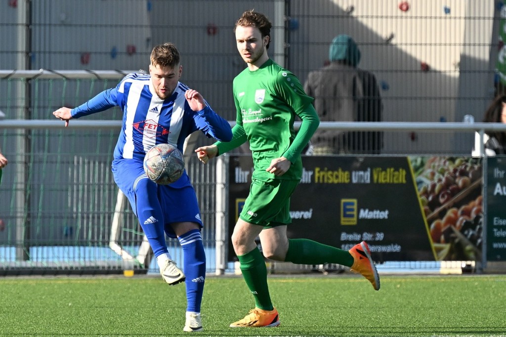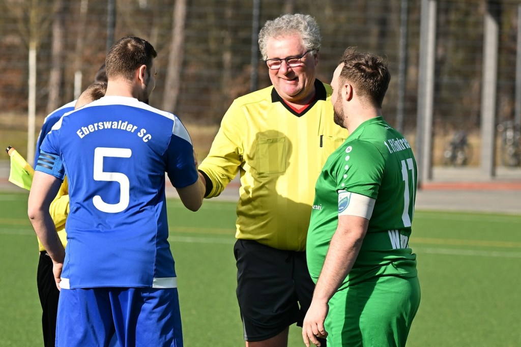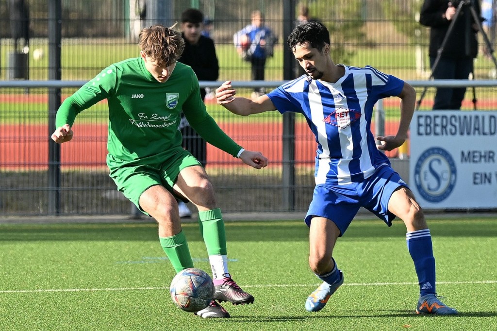 Dabei begann die Partie auf Augenhöhe mit dem ersten Rauchzeichen der Hausherren. Maximilian Voigt hatte nach einem Eckball aus spitzem Winkel Eintracht Torsteher Michael Lehmann geprüft (4.). Keine sechzig Sekunden später klingelte es zum ersten Mal im ESC-Kasten. Die lapidare Spieleröffnung durch Patrick Schröter bestrafte der Landesklassen erfahrene Roman Schmidt, als er im Zweikampf den Ball eroberte und im Nachgang unter die Querlatte nagelte. In Schockstarre verfiel die Sportclub-Truppe keineswegs, sondern kam in der 7. Minute durch Hamid Amachnoug zum nächsten Abschluss, der dann aber recht klar ins Aus ging. Doch damit endete der Heimauftritt. Wandlitz übernahm immer mehr die Regie. Allein schon in der Körpersprache war den Gästen die Brisanz der Partie anzumerken. Hinzu fügte sich eine gewisse Leichtigkeit im Vorwärtsgang, was dann auch zum nächsten Treffer führte. Kombinations-Fußball, begleitet von zuschauenden Eberswaldern, endete mit einem Querpass von Roman Schmidt auf den mitgelaufenen Kollegen Jan Ole Grapentin, der im Endeffekt nur noch den Fuß hinhalten brauchte (11.). Für die Hausherren begann nun eine Leidenszeit, weil die Tür zum Spiel nun endgültig zuschlug. Wandlitz hingegen genoss alle Freiheiten, musste sich aber den Vorwurf machen lassen, dies einfach nicht konsequent genutzt zu haben. Unter dem Antreiber Roman Schmidt entwickelten sich einige gute Möglichkeiten. Doch Halbherzigkeit, Verspieltheit, anstatt mal aus der zweiten Reihe abzuziehen, und einige Ungenauigkeiten verhinderten eine klare Halbzeitführung.