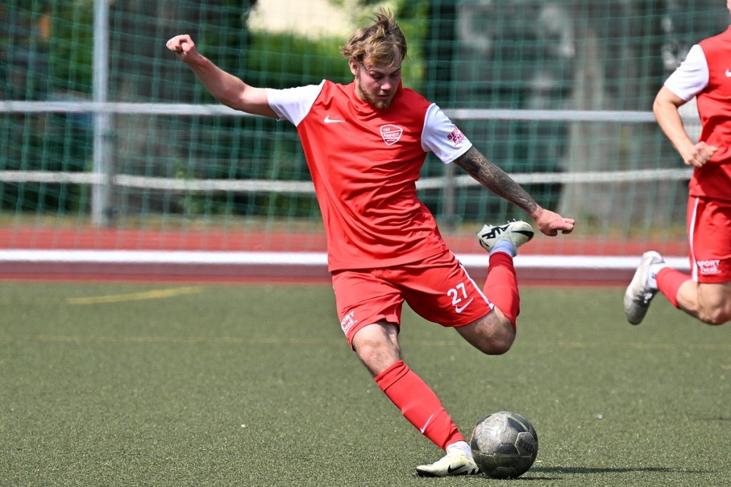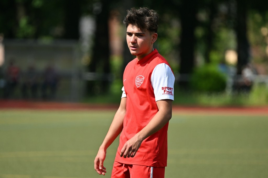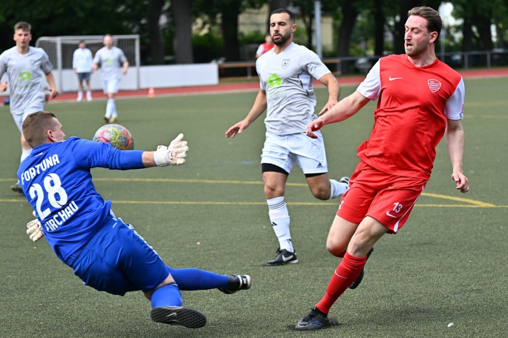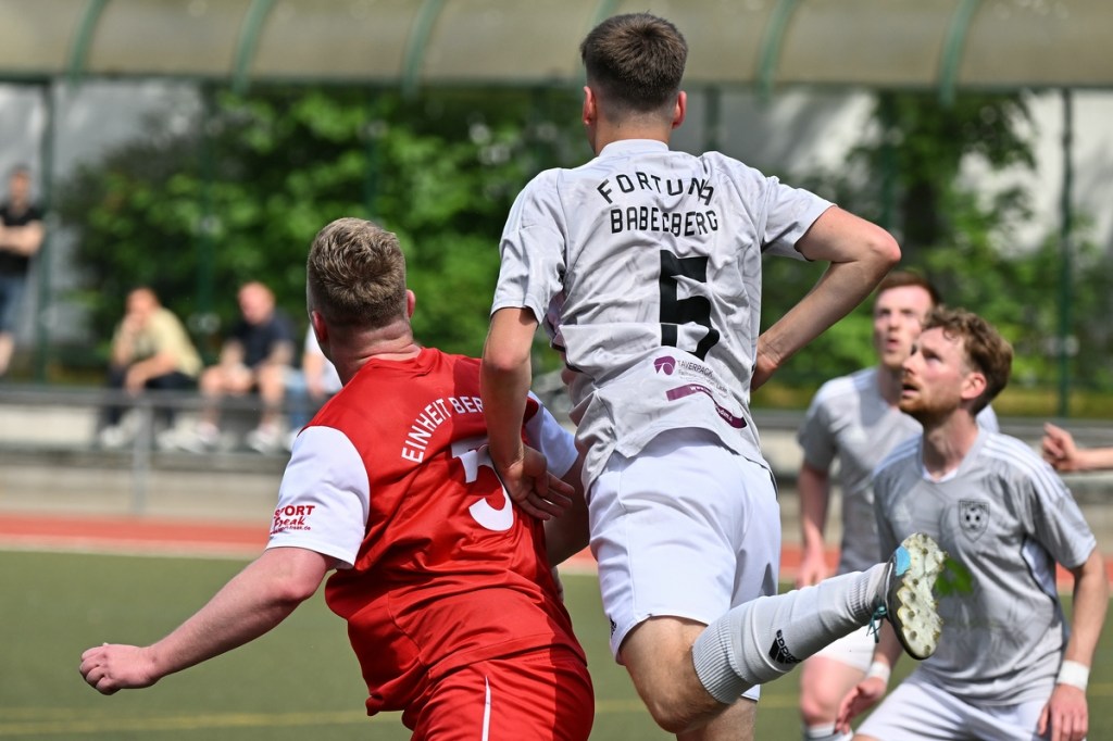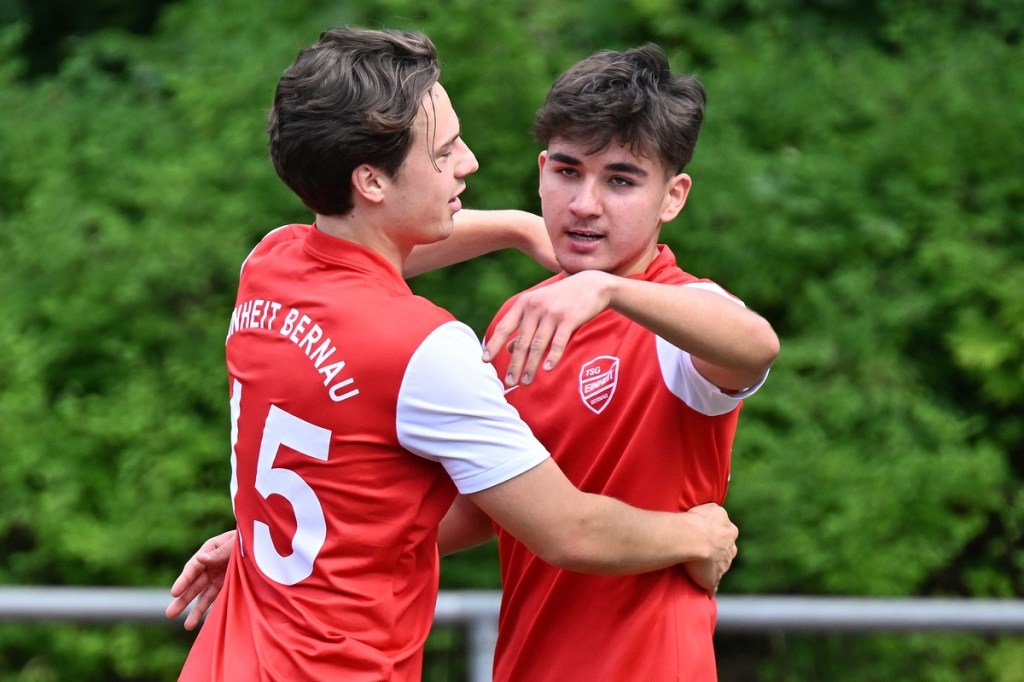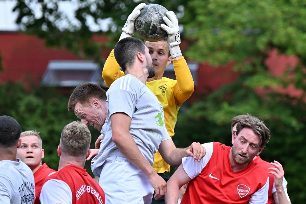 Die Motivation stimmte bei den Hausherren. Und dies zeigte sich besonders in der Anfangsphase. Bereits in der zweiten Minute lag die Führung in der Luft, als Lucas Steinert Gästekeeper Erik Firchau prüfte und der Nachschuss aus dem Rückraum knapp über den Querbalken ging. Keine sechzig Sekunden später bekam Frederick Fiebig, eher zufällig, ein abgefälschtes Anspiel vor die Füße, welches er mehr schlecht als recht verwertete und somit wiederum Firchau zur Endstation des Angriffes machte. Mit dem ersten Gästeangriff lag die Kugel im TSG-Netz. Doch Schiedsrichter Assistent Gero Metzner hatte berechtigterweise ein Abseits gesehen, was den Jubel der Gäste abrupt beendete (5.). Einheit baute sich immer mehr einen Belagerungszustand auf. Dabei wurde Frederick Fiebig zur Galionsfigur. Gerade sein Solo, welches er sehenswert dreißig Meter vor dem Fortuna-Tor ansetzte, wäre schon ein Tor wert gewesen. Doch sein Schuss von der Strafraumgrenze war Pech behaftet, als ein Gästebein den Einschlag verhinderte (6.). Einheit ließ nicht locker und dabei die Gäste kaum zur Entlastung kommen. Das Geschoss aus dem Rückraum, abgesetzt von Felix Glöckner, welches knapp über den Kasten ging, schaffte es auch auf die Strichliste der sehr guten Bernauer Möglichkeiten (8.). Nach gut zwanzig Minuten ebbte die Chancenflut und die damit verbundene Druckphase der Hausherren etwas ab, was den Babelsbergern erst einmal Luft verschaffte. Das „Fortuna Caro einfach“ mit langen Bällen, brachte in der 21. Minute die nächste Möglichkeit, bei der Armand Ligouis die Kaltschnäuzigkeit fehlte und der Abschluss zur leichten Beute für Heim-Torsteher Steve Jarling wurde. Dies war im Allgemeinen das Problem der Gäste, dass man im Ansatz gut unterwegs war, aber im Zielgebiet zu nachlässig agierte und der unbedingte Wille einen Treffer zu erzielen, nicht wirklich spürbar war. Bernaus Enis Hot erzielte dann das hochverdiente 1:0. Vorausgegangen war ein gewonnener Zweikampf eines Kollegen, aus dem Hot mit seinem Ballbesitz profitierte. Eine kurze Finte und er hatte seinen Gegenpart abgeschüttelt. Das Tor erzielte er in Stürmermanier, als er die Kugel sehr abgezockt rechts an Firchau vorbeischob (23.). Bernau hatte weiterhin alles im Griff, musste aber bei sporadischen Gästekontern immer auf der Hut sein. Die knackigeren Möglichkeiten blieben aber auf der Heimseite. Einen Hochkaräter bekam Lucas Steinert an der Strafraumkante der Fortuna aufgelegt. Doch anstatt noch ein paar Meter zu gehen, zog er gleich ab und verschenkte damit viel Potenzial und gab dem viel beschäftigten Firchau die Chance abwehrend einzugreifen (27.). In der 31. Minute reklamierten die Gäste nicht unberechtigt ein Handspiel im TSG-Strafraum durch Viacheslav Veybert, der bei einer halbhohen Flanke der Ball an die Hand bekam und damit der Kugel eine klare Richtungsänderung verpasste. Doch Referee André Stolzenburg ließ weiterspielen, was im Nachgang zu kurzen Diskussionen führte (31.). Die Begegnung flachte immer mehr ab. Praktisch mit dem Halbzeitpfiff führte ein Zweikampf im Bernauer Sechszehner zu einer Strafstoßentscheidung. Viacheslav Veybert kam beim Kampf um den Ball einen Wimpernschlag zu spät und traf John Lukas Schmidt regelwidrig. Schmidts Mitstreiter Tim Dethloff übernahm die erfolgreich die Verantwortung und nahm den Ausgleich motivierend mit ins Halbzeitgespräch (45.).