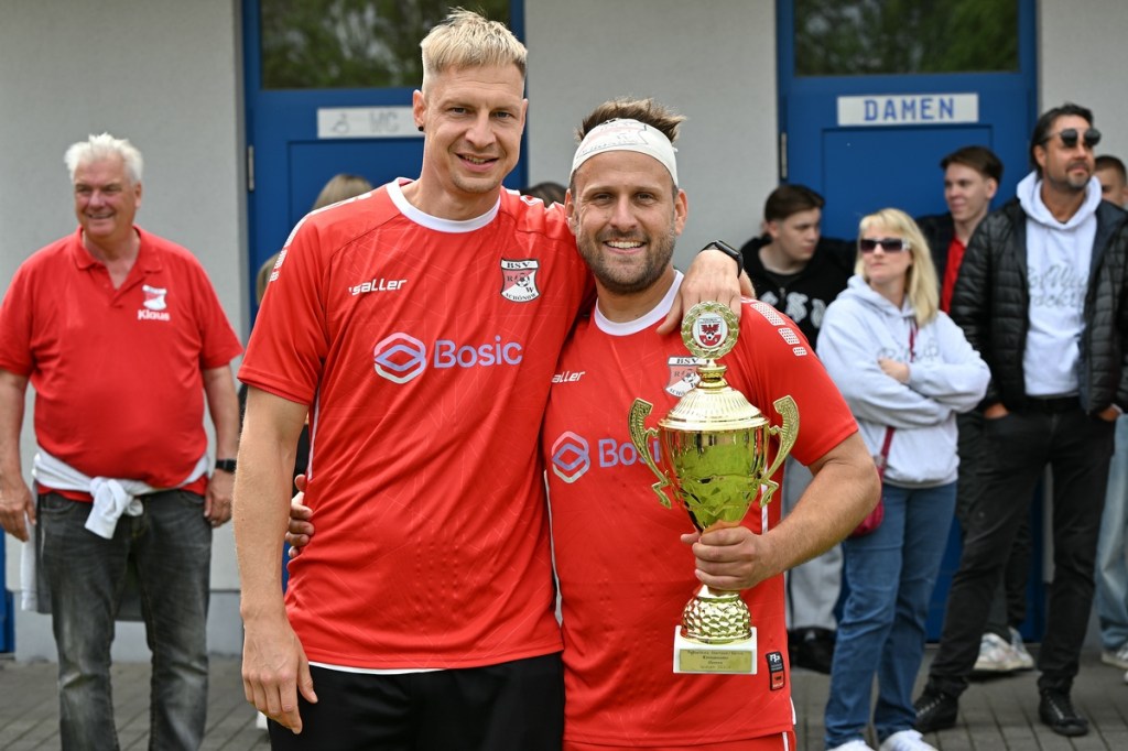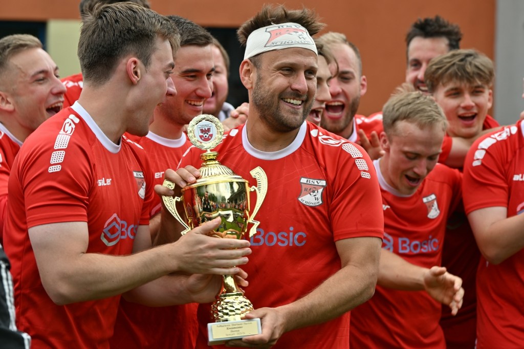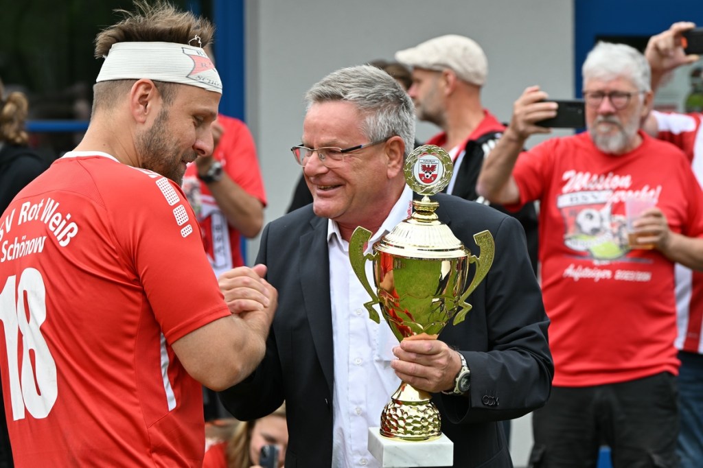 „Zwölf Uhr mittags!“ Es war angerichtet auf der Schönower Sportanlage. Nachdem der Kreisoberliga-Meistertitel schon vor zwei Wochen gegen Bergfelde eingesackt wurde und dies als Kür zu bezeichnen war, stand nun die Pflicht auf dem Programm. Und diese erfüllten die Schönower Jungs mit Bravour und konnten unter dem Jubel der eigenen Fans nach Spielende den Pokal und die Glückwünsche vom Vorsitzenden des Fußballkreises, Michael Reichert und Spielleiter René Grysla, entgegennehmen. Doch damit nicht genug. Schönow konnte sich auch den Nimbus des fairsten Liga-Teams einheimsen. Ein Titel, der nicht genug honoriert werden kann. Gerade in Zeiten, wo auch auf Fußballplätzen, Ehrenhaftigkeit, Solidarität und Sportgeist als Tugenden immer mehr von der Bildfläche verschwinden, sollte viel mehr Aufmerksamkeit auf die Prämierung, so als Motivationsgrundlage, gelegt werden.