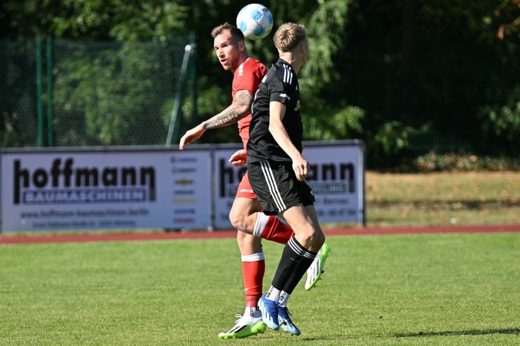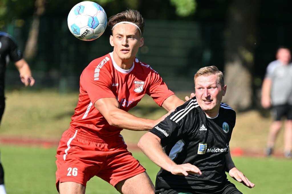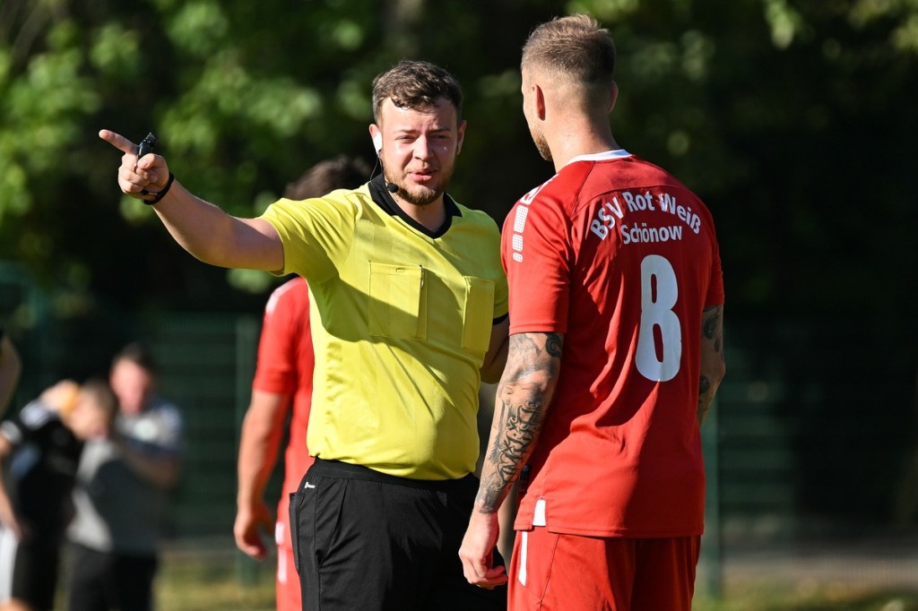 Während Gästetrainer Lindt im Vorgespräch zur Partie acht personelle Ausfälle kommunizierte, war von diesem Hindernis erst einmal nichts zu spüren. Es wurde eine rassige Partie, die mit allem, was so ein Spiel interessant und spannend macht. Galligkeit, Spielwitz und Offensiv-Hunger prägten die Anfangsphase. Dabei bevorzugten die Gäste das Abschließen der Angriffe aus der zweiten Reihe, die schon einen gewissen Eindruck hinterließen. Die Hausherren entfachten in der 7. Minute den ersten kleinen Brandt im FSV-Strafraum, den Keeper Luca Meng im Nachfassen entschärfte. Die Begegnung blieb weiterhin auf hohem Niveau, mit etwas mehr Halbchancen auf der Gästeseite. Ein Pfiff durch Referee Cedric Molowitz in der 16. Minute mit einem klaren Fingerzeig auf den Elfmeterpunkt im Schönower Strafraum brachte die hundertprozentige Möglichkeit für die Schorfheider in Führung zu gehen. Nick Wojahn wurde an der rechten Strafraumkante klar regelwidrig von den Beinen geholt. Julius Schneider übernahm die Verantwortung und brachte die Kugel aus der Rubrik „Weder Fisch noch Fleisch“ auf den Weg. Heimkeeper Enrico Müller roch den Braten und hielt für seinen rot weißen Farben die Null. Während Schönows Topstürmer Bachnick noch weitestgehend blass blieb, übernahm sein Mitstreiter Iven Eckardt immer mehr die Initiative und kam dabei verstärkt zu guten Abschlüssen. Genauso rückte Schorfheides Schlussmann Luca Meng immer mehr in den Blickpunkt, der sich gerade mit Eckardt in ein ums andere Duell begeben musste. Eine sehenswerte Kombination über vier Stationen organisierte die nächste gute Chance für die Heimelf. Niklas Gebhardt war das Ende der Kette, doch seinem Schuss fehlte die Präzision und landete in den Armen von Meng (33.). Während Schönow jetzt etwas mehr an der Führung knabberte, machten die Gäste aus einer Standardsituation das 0:1. Ein Freistoß aus dem linken Halbfeld, Richtung langem Pfosten geschlagen, verwertete Christian Lorenz per Kopfball über BSV-Torsteher Müller hinweg zum aus Schönower Sicht nüchternen Rückstand. Dabei zeigte sich die Heimabwehr inklusive Keeper nicht sehr sattelfest. Der Ball war lange in der Luft und dadurch auch berechenbar (42.).