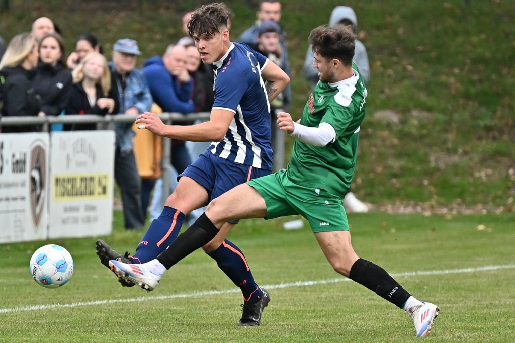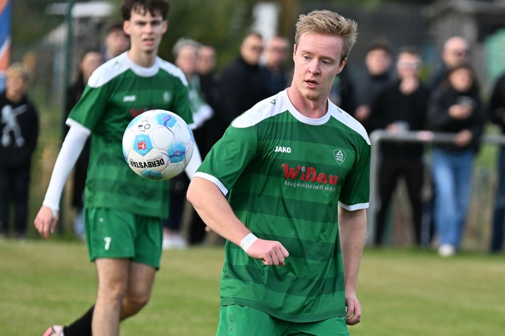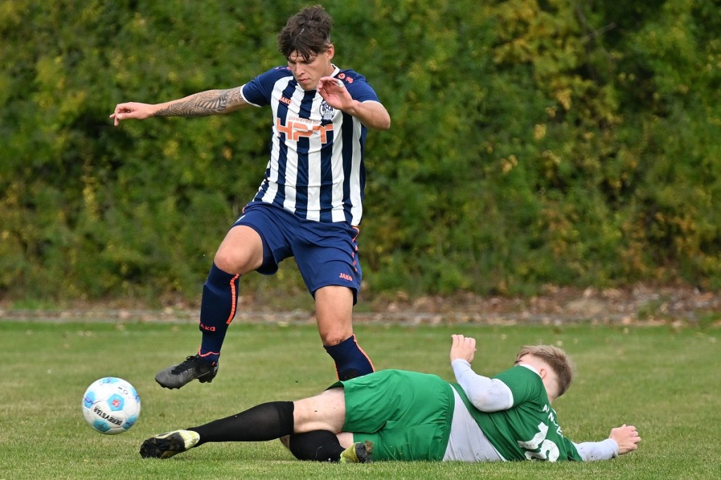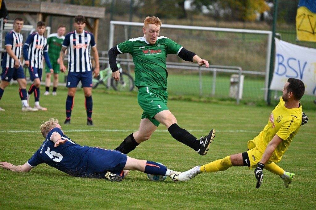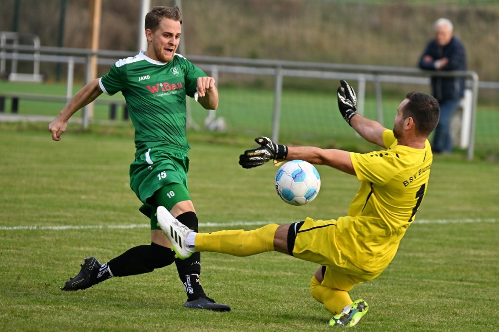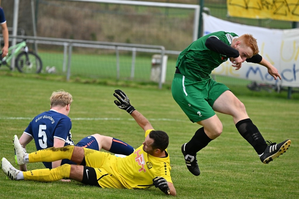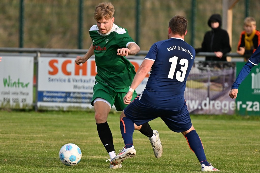 „Ich glaube, wir haben von Beginn an das Spiel bestimmt und mit den drei frühen Toren für klare Verhältnisse gesorgt“, hatte GWA-Coach Marco Fiedler in Nachgespräch angemerkt und damit schon das Spiel eigentlich im Gesamten erklärt. Sein Team begann mit Spielfreude, noch auf Sicherheit getrimmt, sehr strukturiert und abgeklärt. Die sichtbare Matrix der Gäste hatte auch Blumbergs Übungsleiter Dennis Greger gesehen und so ein wenig als Ursache für die Niederlage und als Unterschied zu seiner Truppe ausgemacht. Obwohl Blumbergs Erik Bredereke in der 5. Minute nicht ungefährlich einen Kopfball auf den Gäste-Querbalken gesetzt hatte und damit ein kleines Rauchzeichen entfachte, lag die Kugel wenig später zum 0:1 im BSV-Kasten. Ein Eckball von der linken Seite, geschlagen von Oliver Kluschke, fälschte Blumbergs Andreas Kimi so ab, dass dieser im langen unteren Eck einschlug (9.). In der Folgezeit ließ Grün-Weiss nichts anbrennen. Blumberg hingegen hatte große Probleme in der Defensive, gerade die Sprintduelle für sich erfolgreich zu gestalten und irgendwie auch zu unterbinden. Besonders wenn die schnellen Gästeangriffe über Justin-Gill Reisner liefen, brannte es vor dem Kasten von Christopher Kirfe lichterloh. Reisner war es dann auch, der die Anzeigetafel in der 12. Minute auf 0:2 stellte. Ein unnötiger Ballverlust der Hausherren wurde zum Bumerang, den der Torschütze in Kaltschnäuzigkeit und Torjägermanier für sein Team erfolgreich ummünzte. Die Heimtruppe wackelte, weil die Grün-Weissen nicht lockerließen und dabei mit den sich nicht allzu häufig bietenden Möglichkeiten recht schlampig umgingen. Die BSV-Offensive hingegen zuckte nur sporadisch, wie bei dem Schuss von Justin Philipp Bosch, der GWA-Torsteher Dominik Vollmer zur Parade zwang (18.). Trotzdem führten die Gäste nach zwanzig Minuten mit 0:3 und dies auch absolut verdient. Den dritten Treffer hatte Nicolae Bors markiert, als wiederholt die letzte Hausherren-Reihe stümperhaft agierte und er mit seinem platzierten Schuss keine Fragen aufkommen ließ. Die Begegnung schien entschieden. Blumberg blieb weiterhin blass und konnte von Glück reden, in der Folgezeit nicht weiter unter die Räder gekommen zu sein. Den Hausherren-Lichtblick organisierte Ahrensfelde selber in Persona Mike de Rapper. Dessen Rückpass verunglückte bzw. verhungerte dermaßen, dass BSV-Stürmer Erik Krüger zum „Angespielten“ wurde und abgeklärt das 1:3 erzielte (35.). Für Blumberg war dies der Schalter zumindest in den Zweikämpfen angekommen zu sein und damit der Partie auch ein wenig Derby-Charakter verliehen zu haben.