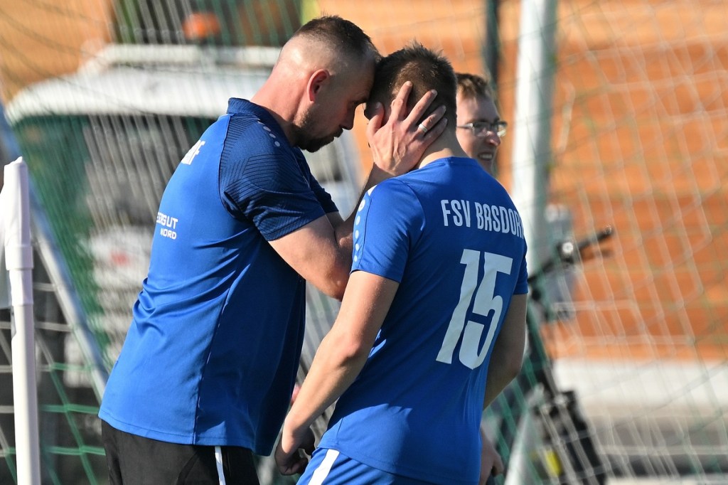 Dass die Erkenntnisse der durchwachsenen Auftritte beider Vertretungen im Halbzeitgespräch ein Thema waren, konnte man zum Wiederanpfiff schon spüren. „Ich bin laut geworden und meine Wortwahl war sicherlich nicht für die Öffentlichkeit bestimmt, hat aber schlussendlich Früchte getragen“, berichtete Dirk Opitz, der Trainer Hausherren mit breiter Brust. Vier Minuten dauerte es nur, bis Justin Wende zum ersten Mal zuschlug. Dabei hatte er schon das Glück eines Goalgetters, dass er Nutznießer eines stark gehaltenen ersten Versuches wurde, dann goldrichtig stand und den Nachschuss unhaltbar versenkte. Für die Spannung in der Partie war der Treffer natürlich ein Segen. Denn Basdorf schrieb sich in der Folgezeit sichtbar auf die Fahne, nicht als Verlierer nach Hause zu fahren. „Schlussendlich fehlte uns heute auch die Qualität, die Partie noch umzubiegen“, nannte Teske einen der Hauptgründe für den Niedergang und hatte damit kein Blatt vor dem Mund genommen. Während die Gäste immer wieder Versuche starteten, mit langen Bällen zu operieren und damit kaum Wirkung erzielten, kam Grün-Weiß immer besser, vor allem strukturierter, in die Partie. Zwar hatte Camara in der 53. Minute den Ausgleich auf den Schlappen, scheiterte aber aus spitzem Winkel an SV-Torhüter Roman Große. Dessen Abwehr beförderte den Ball ans Quergebälk und zurück in den Fünfmeterraum, in den sich dann kein Basdorfer fand, um den Ball irgendwie in die Verwertung zu bringen. Die Tore schossen jetzt die Hausherren und legten sich damit nun resignierende Gäste zurecht. Marcel Weihrauch erhöhte auf 2:0 und dies leicht Glück behaftet. Das feine Anspiel brachte ihn ins Laufduell und zum Torschuss, bei dem Kreiger zwar noch seine Finger dran hatte, aber schlussendlich zu sehen musste, wie sich das Spielgerät über ihn hinweg ins Tor senkte (66.). In Sachen Ausbeute folgte jetzt die Zeit des Justin Wende, der in Stürmermanier einen lupenreinen Hattrick hinlegte (74., 86., 89.). Das 3:0 leitete Steven Schultz mit einem feinen Pass ein, den Wende schnörkellos und ohne Abwehrmöglichkeit per knackigem Schuss in eine ausgiebige Jubelarie ummünzte. Das Tor veränderte die Gemengelage nun endgültig zu Gunsten der Hausherren. Basdorf musste schon aufpassen, nicht gänzlich ins Debakel zu rutschen. Dabei konnte man schon vom Gäste-Glück reden, dass Justin Wende insgesamt nur vier Mal zugeschlagen hatte, obwohl mit der indessen sehr rigiden Gegenwehr der Gäste wesentlich mehr möglich gewesen wäre. Dirk Opitz war schon stolz auf seine Truppe. „Personell waren wir nicht bestbesetzt. Ich fand aber schon, dass wir im zweiten Durchgang hervorragend gespielt haben und das, was in der Halbzeit angesprochen, auch konsequent umgesetzt wurde.“ „Aber bei aller Euphorie, das alles geht gegen den Abstieg und nur gegen den Abstieg“, betonte Opitz noch einmal das klare Saisonziel. Marcel Teske rätselte in seiner Spielbetrachtung schon ein wenig, warum es momentan, neben der Personalmisere, nicht so ganz rund läuft. „Es hilft ja nichts, wir werden auf jeden Fall weiterarbeiten. Ich denke schon, dass wir auf dem richtigen Weg sind,“ zeigte er sich trotz der klaren Niederlage positiv gestimmt.