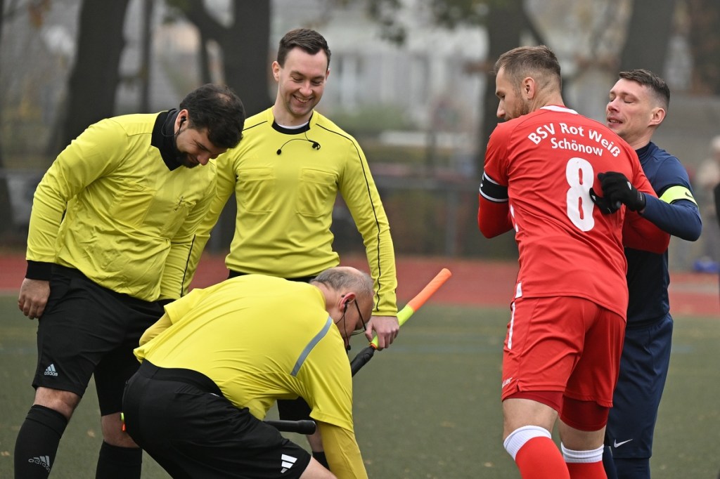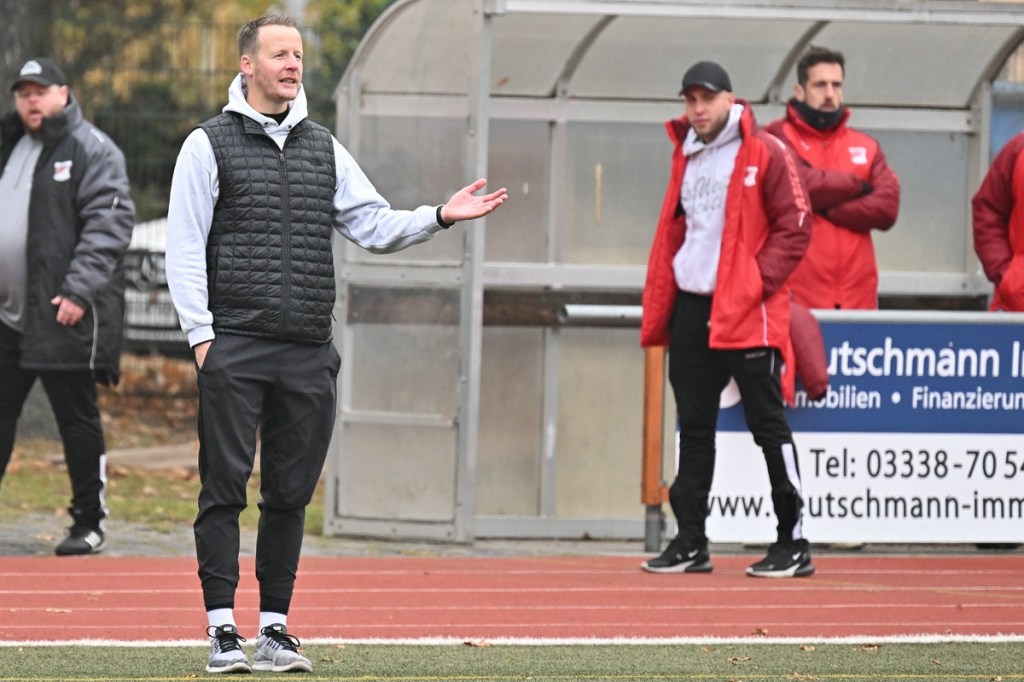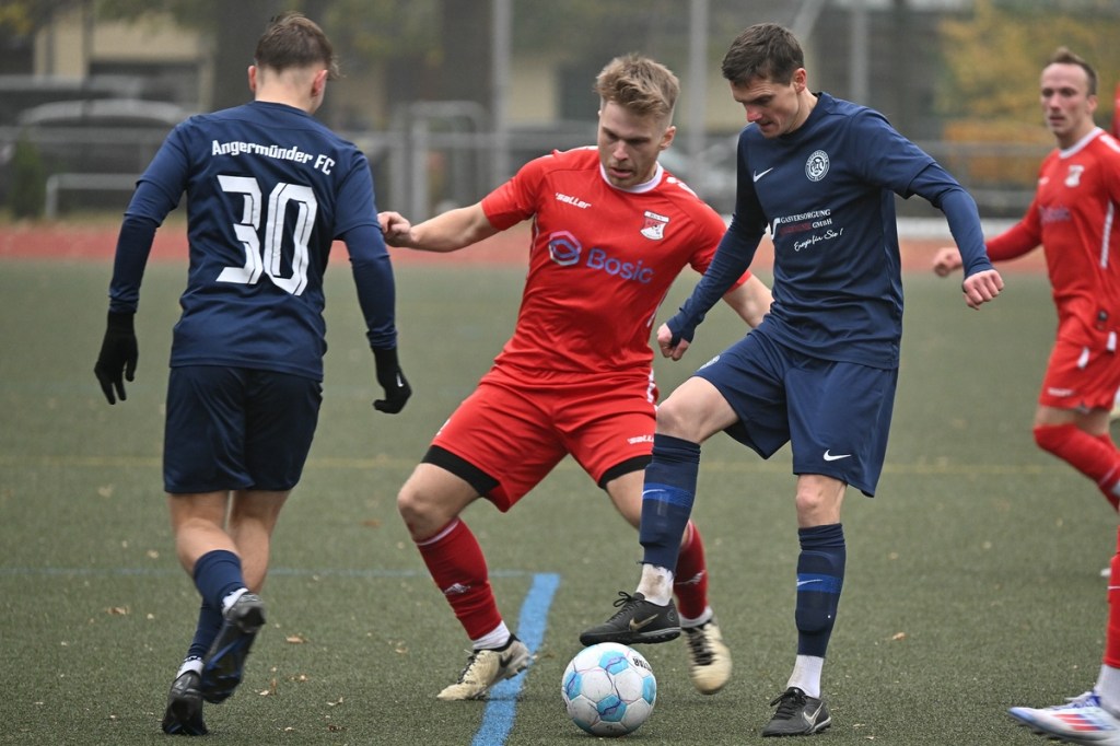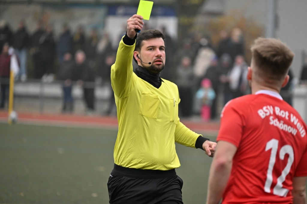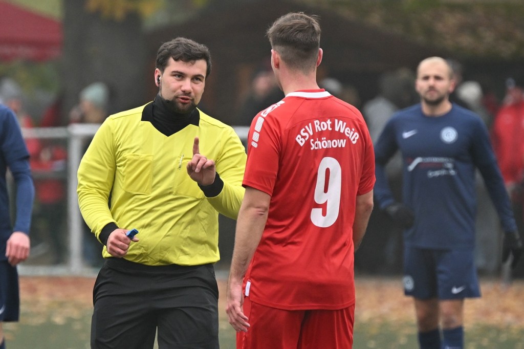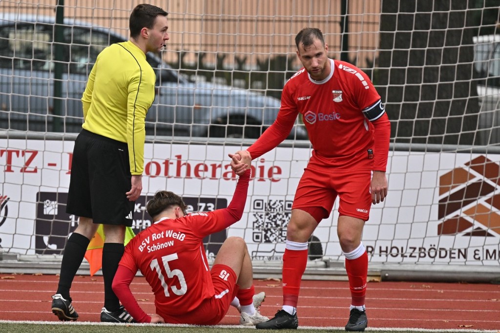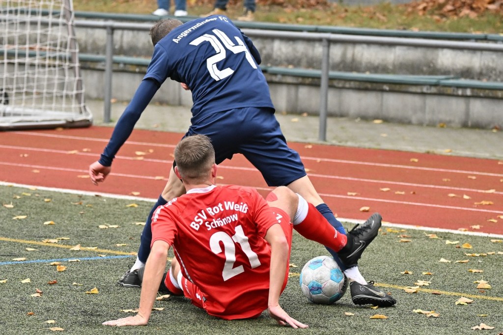 Der Umzug der Hausherren von der Schönower Heimstätte ins Winterquartier auf den Kunstrasenplatz am Bernauer Wasserturm bürgte schon eine Unbekannte in sich. Und dies war die beengte Spielfläche und das Klarkommen damit. Doch die Bedenken wurden schnell wegradiert. Die Partie war intensiv, gallig, spannend und vor allem emotional inspiriert und zeigte schon an, welcher Druck auf dem Kessel herrschte. Schönow war hervorragend eingestellt und im Team hoch motiviert unterwegs. Angermünde hingegen schien schon etwas überrascht und sah sich von Beginn an intensiver Gegenwehr ausgesetzt. Das erste Rauchzeichen setzte Rot Weiß in der 3. Minute, nachdem man sich im Gästestrafraum festgesetzt hatte und Iven Eckardt zum Kopfball gekommen war, diesen aber nicht platziert genug auf das Tor brachte. Für Schiedsrichter Daniel Seyed Vousoghi war die Begegnung schon nach fünf Minuten zur Herausforderung geworden. Denn zu diesem Zeitpunkt regten sich nach einem knackigen Zweikampf die Gefühle, zwar noch in niedriger Kochstufe, aber schon mit Blickrichtung auf den noch folgenden Spielverlauf. Zum ersten Mal eingreifen musste RW-Torsteher Johannes Weinrich in der 7. Minute. Dort hatte sich Jonny Wendler in halblinker Strafraumposition freigespielt und abgezogen. Weinrich regierte sehenswert auf Kosten eines Gäste-Eckballs. Das Überspielen der Abwehrreihen mit langen Bällen war für beide Team als probates Mittel augenscheinlich. Doch darin war schon früh der Unterschied zwischen beiden Teams auszumachen. Angermündes Aufzug passte nicht, zu oft kamen die Anspiele nicht an. Schönow hingegen war in diesem Punkt einfach passgenauer und zielgerichteter unterwegs. So lag das Chancenplus eindeutig aufseiten der Hausherren, welches dann in der 18. Minute in die verdiente Belohnung kam. Drei Versuche erzeugten schlussendlich das viel umjubelte 1:0. Erst scheiterte Kenneth Wessel am gut reagierenden Samuel Matje. Dann bekam Angermünde die Situation nicht geklärt, in der der nächste Schuss noch abgewehrt werden konnte. Hannes Krüger setzte nach und erzielte den Treffer mit viel Willen aus Nahdistanz, als er die Kugel unhaltbar über die Linie drückte. Die Partie war qualitativ nicht in der obersten Kategorie einzuordnen. Dies war aber auch aufgrund der Platzgröße kaum zu erwarten. Trotzdem war es das Spitzenspiel und blieb es auch. Schönow stresste den vermeintlichen Favoriten und kam auch zu weiteren Hochkarätern. Wie der Möglichkeit durch Hannes Krüger, der angespielt sein Laufduell gewann, aber viel zu früh abschloss (23.). Auch sein Sturmkollege Iven Eckardt ließ die Angermünder Defensiv-Fraktion stark wanken. Einmal mit seinem Geschoss aus der zweiten Reihe (29.) und dann mit dem Kopfballversuch, den Matje reaktionsschnell entwertete (31.). In der Schlussphase Richtung Halbzeitpause flachte die Begegnung etwas ab, ohne aber den Spannungsbogen zu verlieren. Rot Weiß kratzte weiter an der Ergebnisverbesserung und konnte sich zum Halbzeitpfiff schon ärgern, den Pausentee nicht mit einer klareren Führung genießen zu können. Dabei glänzte Maximilian Bachnick als Vorlagengeber und Eckardt als Verwerter mit Flugkopfballeinlage, die wiederum in den Händen von Matje den Abschluss fand (41.). Auch die liegengelassene Doppelchance durch Bachnick und Eckardt in der Nachspielzeit sollte nicht unerwähnt bleiben. In letzter Not rettete die vielbeinige Gästeabwehr deren berühmten eigenen Hintern und ließ für den zweiten Durchgang noch einiges für den Favoriten erhoffen (45.+1).