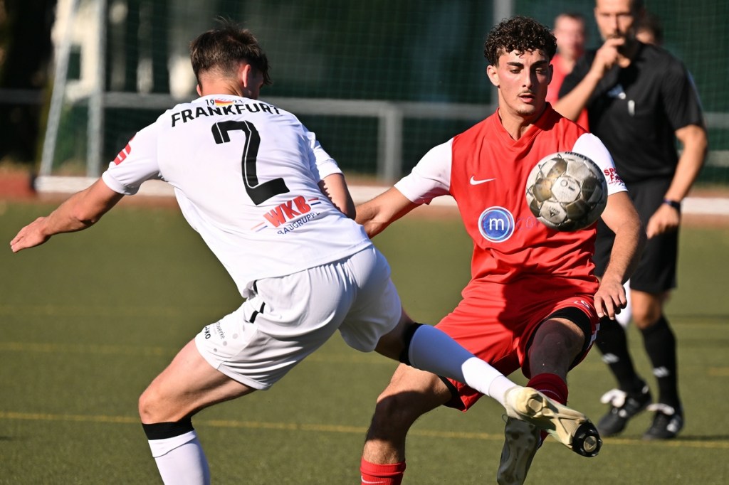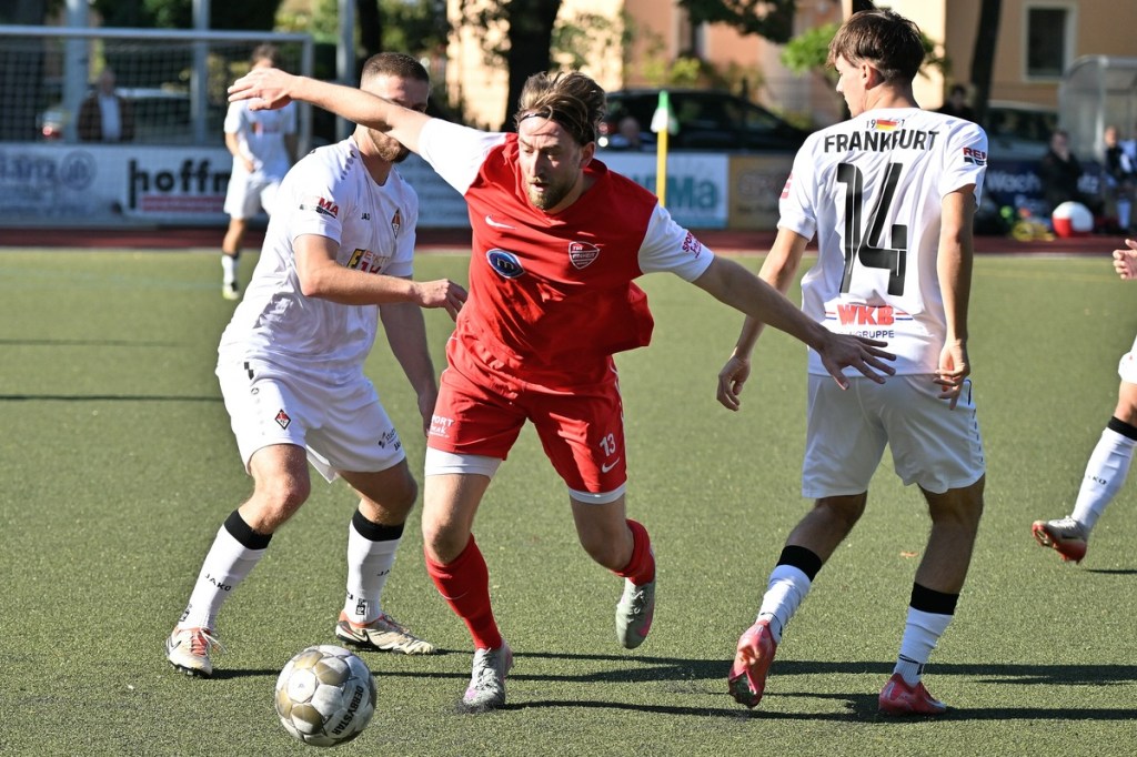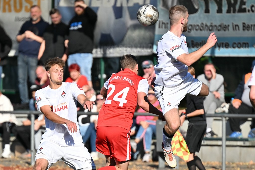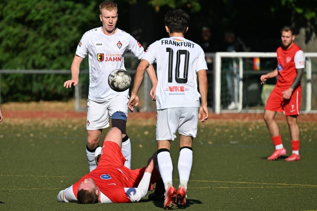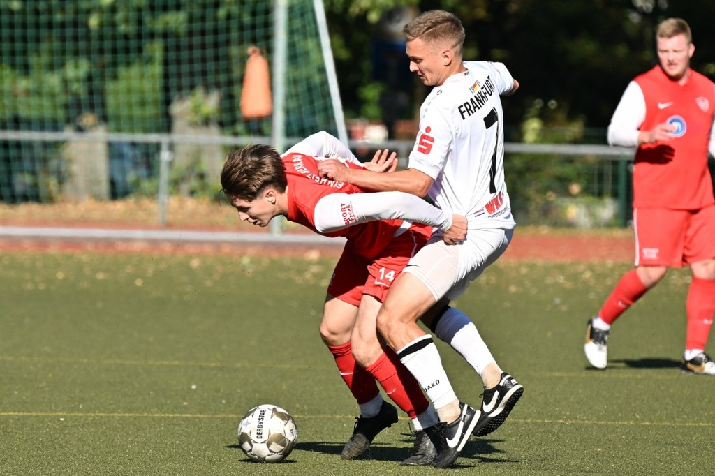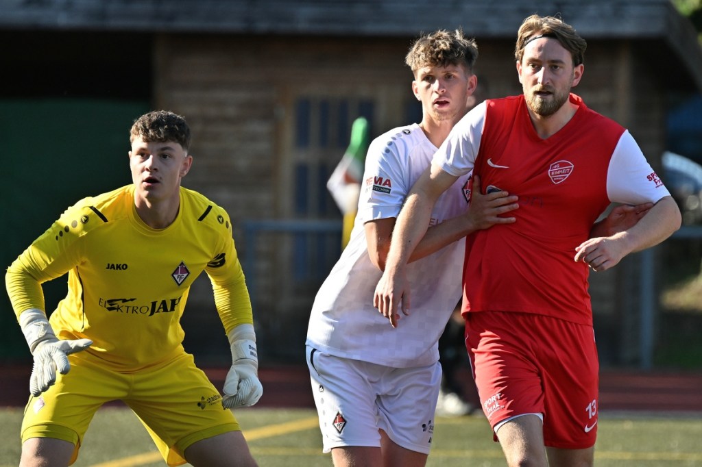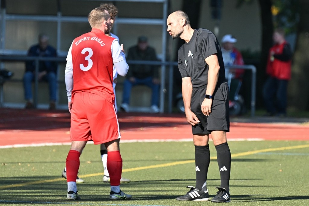 Die Partie begann intensiv, in der sich klar herausstellte, mit welchen Agenden beide Teams unterwegs waren. Während sich der 1. FC spielstark präsentierte, machte Einheit erst einmal die Schotten hinten dicht. Doch den ersten offensiven Pluspunkt kassierten die Bernauer ein. Dabei war Lukas Steinert, nachdem einer seiner Kollegen Gästekeeper Dominik Müller geprüft hatte, an der linken Fünferkante vollkommen blank zum Schuss gekommen und brachte das Kunststück fertig, die Kugel aus Nahdistanz über die Latte zu jagen (4.). Für die Hausherren bedeutete diese Möglichkeit den Hebel umzulegen und sich in die Partie hineinzukämpfen. Nach gut zehn Minuten zeigte sich das Aufeinandertreffen ausgeglichen. Frankfurt agierte oft im One-Touch-Modus mit anschließenden präzisen Diagonalbällen, die schon eine gewisse Gefährlichkeit ausstrahlten. Doch Bernau stellte sich zusehends darauf ein, verteidigte mit Leidenschaft, was den Gästen immer mehr den Schneid abkaufte. So dauerte es vierzehn Minuten bis zur ersten nennenswerten Gästemöglichkeit. Diese hatte Kieran Czech auf den Schlappen, als er sich lang angespielt in Schussposition brachte und Bernaus Schlussmann Steve Jarling in die Prüfung zwang. Nur eine Minute später hatten einige Hausherren den Jubelschrei schon auf den Lippen. Luis Hübner war nach einem Eckball am höchsten gestiegen und hatte den Ball mit der Stirn sehr knapp neben den Pfosten gesetzt. Die Folgezeit hatten sich die Bernauer gebucht. Dabei machte die Truppe aber den Fehler, in der Endkonsequenz zu hektisch unterwegs gewesen zu sein. Frankfurt im Gegenzug zuckte im Vorwärtsgang nicht ungefährlich. Hugo Bloch bekam die Kugel diagonal aufgelegt, schaffte es aber nicht, bedrohlich abzuschließen (24.). Genau diese Gefährlichkeit fehlte auch den Hausherren, sodass die Null auf der Anzeigetafel weiterhin Bestand hatte. Nach gut einer halben Stunde hatte Frankfurt die Partie wieder unter Kontrolle bekommen. Ein Freistoß lang in den Strafraum geschlagen, verwertete Danny Mank mit einem platzierten Schuss, welchen Steve Jarling per Glanztat entschärfte (37.). Mank war es auch, der den nächsten Riesen in den Lauf durchgesteckt bekam. Schlussendlich gewann der Bernauer Torhüter das Eins-Gegen-Eins-Duell, in dem er im Nachfassen das Spielgerät unter sich begraben konnte (39.).