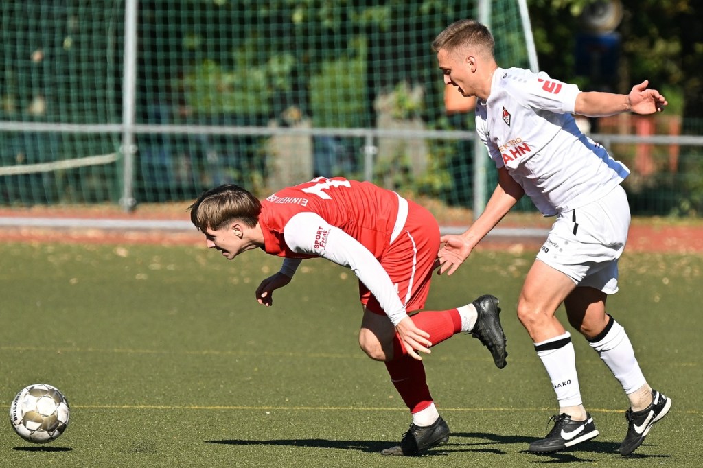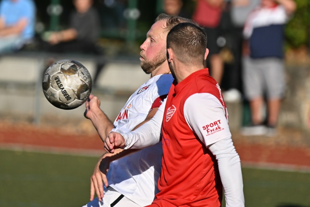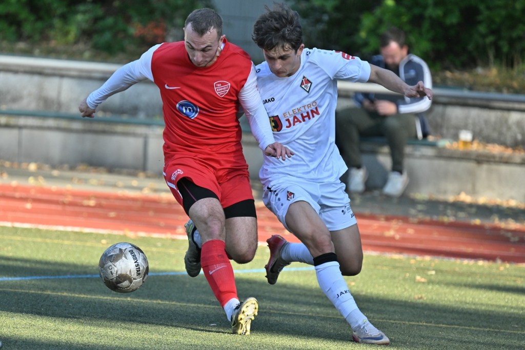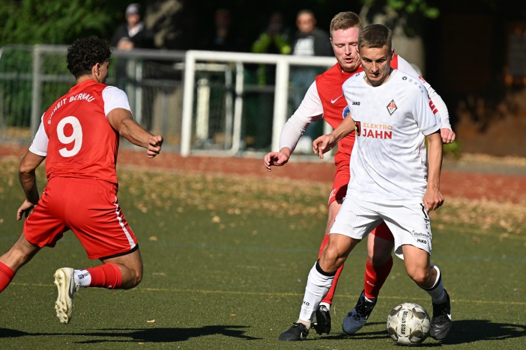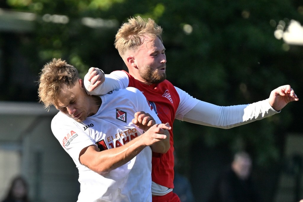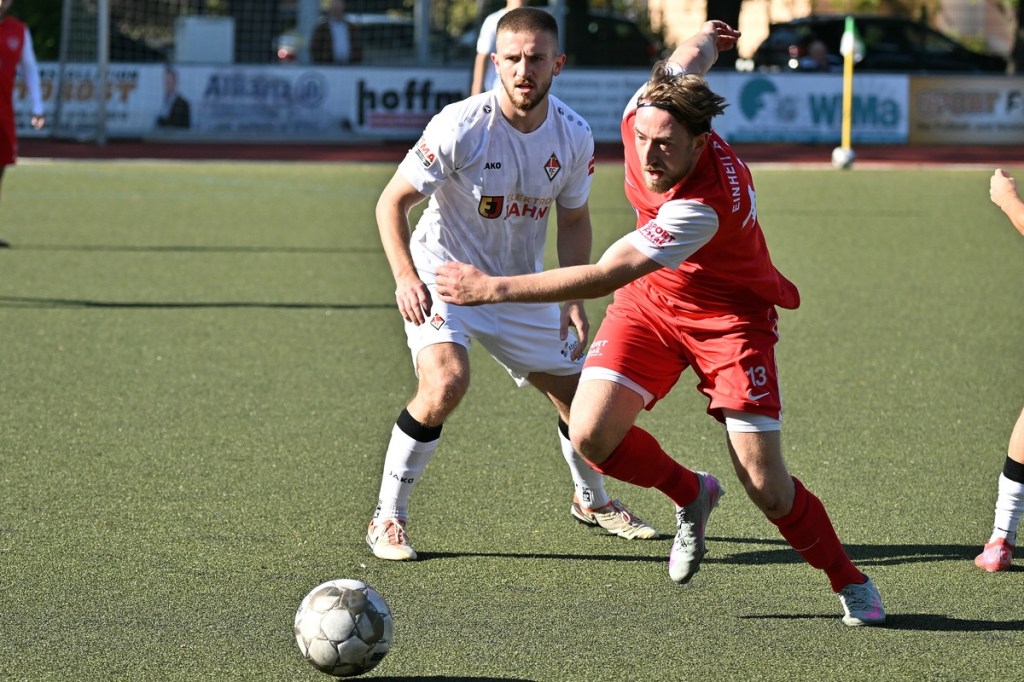 Die Partie begann intensiv, in der sich klar herausstellte, mit welchen Agenden beide Teams unterwegs waren. Während sich der 1. FC spielstark präsentierte, machte Einheit erst einmal die Schotten hinten dicht. Doch den ersten offensiven Pluspunkt kassierten die Bernauer ein. Dabei war Lukas Steinert, nachdem einer seiner Kollegen Gästekeeper Dominik Müller geprüft hatte, an der linken Fünferkante vollkommen blank zum Schuss gekommen und brachte das Kunststück fertig, die Kugel aus Nahdistanz über die Latte zu jagen (4.). Für die Hausherren bedeutete diese Möglichkeit den Hebel umzulegen und sich in die Partie hineinzukämpfen. Nach gut zehn Minuten zeigte sich das Aufeinandertreffen ausgeglichen. Frankfurt agierte oft im One-Touch-Modus mit anschließenden präzisen Diagonalbällen, die schon eine gewisse Gefährlichkeit ausstrahlten. Doch Bernau stellte sich zusehends darauf ein, verteidigte mit Leidenschaft, was den Gästen immer mehr den Schneid abkaufte. So dauerte es vierzehn Minuten bis zur ersten nennenswerten Gästemöglichkeit. Diese hatte Kieran Czech auf den Schlappen, als er sich lang angespielt in Schussposition brachte und Bernaus Schlussmann Steve Jarling in die Prüfung zwang. Nur eine Minute später hatten einige Hausherren den Jubelschrei schon auf den Lippen. Luis Hübner war nach einem Eckball am höchsten gestiegen und hatte den Ball mit der Stirn sehr knapp neben den Pfosten gesetzt. Die Folgezeit hatten sich die Bernauer gebucht. Dabei machte die Truppe aber den Fehler, in der Endkonsequenz zu hektisch unterwegs gewesen zu sein. Frankfurt im Gegenzug zuckte im Vorwärtsgang nicht ungefährlich. Hugo Bloch bekam die Kugel diagonal aufgelegt, schaffte es aber nicht, bedrohlich abzuschließen (24.). Genau diese Gefährlichkeit fehlte auch den Hausherren, sodass die Null auf der Anzeigetafel weiterhin Bestand hatte. Nach gut einer halben Stunde hatte Frankfurt die Partie wieder unter Kontrolle bekommen. Ein Freistoß lang in den Strafraum geschlagen, verwertete Danny Mank mit einem platzierten Schuss, welchen Steve Jarling per Glanztat entschärfte (37.). Mank war es auch, der den nächsten Riesen in den Lauf durchgesteckt bekam. Schlussendlich gewann der Bernauer Torhüter das Eins-Gegen-Eins-Duell, in dem er im Nachfassen das Spielgerät unter sich begraben konnte (39.).