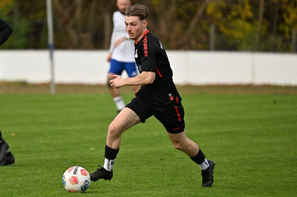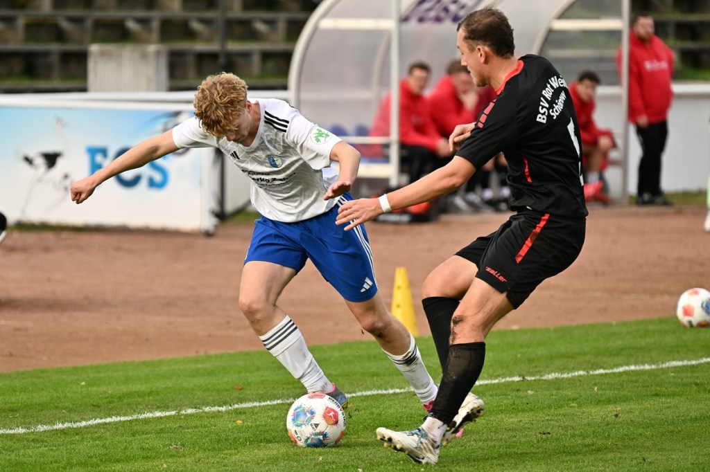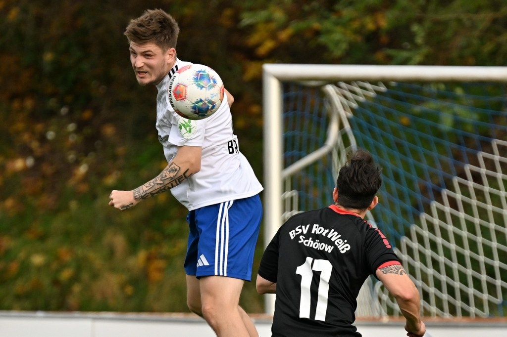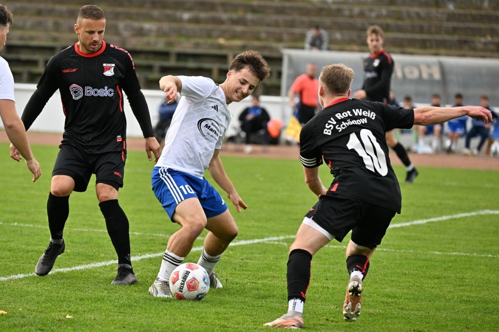 Das Wetter stimmte, die Platzverhältnisse nach den intensiven Regentagen, auch. Die Begegnung hatte eine gute Viertelstunde lang nicht viel zu bieten, außer dass Schönow der Partie etwas mehr Stempelgröße aufdrückte. Doch drei Möglichkeiten der Hausherren ließen das Spiel zu Gunsten der Strausberger kippen. Erst war es Maximilian Brasch, der gut positioniert ein Schüsschen absetzte (15.), dann Joel Wilhelm, dessen Kopfball zu unplatziert auf den Gästekasten kam (16.) und schlussendlich Luis Suter, der bestens bedient von Flankengeber Silvan Küter mit langem Bein den Ball neben das Tor schob (17.). Strausberg war nun im Spiel und Rot-Weiß gar nicht mehr. Die Galligkeit, besonders im Zweikampfverhalten, von Max Röhr und seinem Bruder Moritz Röhr bereitete den Gästen schon einiges an Kopfzerbrechen. Ein Freistoß aus halblinker Position landete im Fünfer und ließ Schönow nicht gut aussehen. Ein wenig Gestochere mit Abschlussversuchen ließ die Kugel im Netz zappeln. Strausbergs Joel Wilhelm wurde als Torschütze offiziell genannt, doch den Ball brachte RW-Verteidiger Mino Lehnhardt aus Nahdistanz im eigenen Tor unter (26.). Die Führung war verdient, nicht nur wegen des Torerfolges, sondern auch, weil der FC nicht lockerließ. Schönow hingegen wirkte lethargisch, bekam einfach keine Geschwindigkeit in die eigenen Momente und verlor zudem noch reichlich Zweikämpfe. So war es nicht verwunderlich, dass Strausberg nachlegte. Silvan Küter hatte schon vorab mit seinen langen Einwürfen angezeigt, dass diese die gleiche Qualität wie Eckstöße haben können. Sein Wurf landete im Fünfer, wo Moritz Röhr per Kopf zur Stelle war und RW-Torsteher Enrico Müller keine Chance ließ (36.). Es war von Gästeseite aber auch stümperhaft verteidigt. Wenn man die Recken in der Schönower Abwehr und den normalgroßen Röhr nebeneinanderstellte und zusehen konnte, wie einfach in dieser Situation eine Bude zu machen war. Die 43. Minute war angebrochen, da kam Rot-Weiß zur ersten erwähnenswerten Chance. Ein schneller Angriff über die rechte Seite brachte Tom Schneider ins Geschehen. Der kam aber einen Wimpernschlag zu spät und musste somit FC-Keeper Florian Rudolph das Spielgerät überlassen.