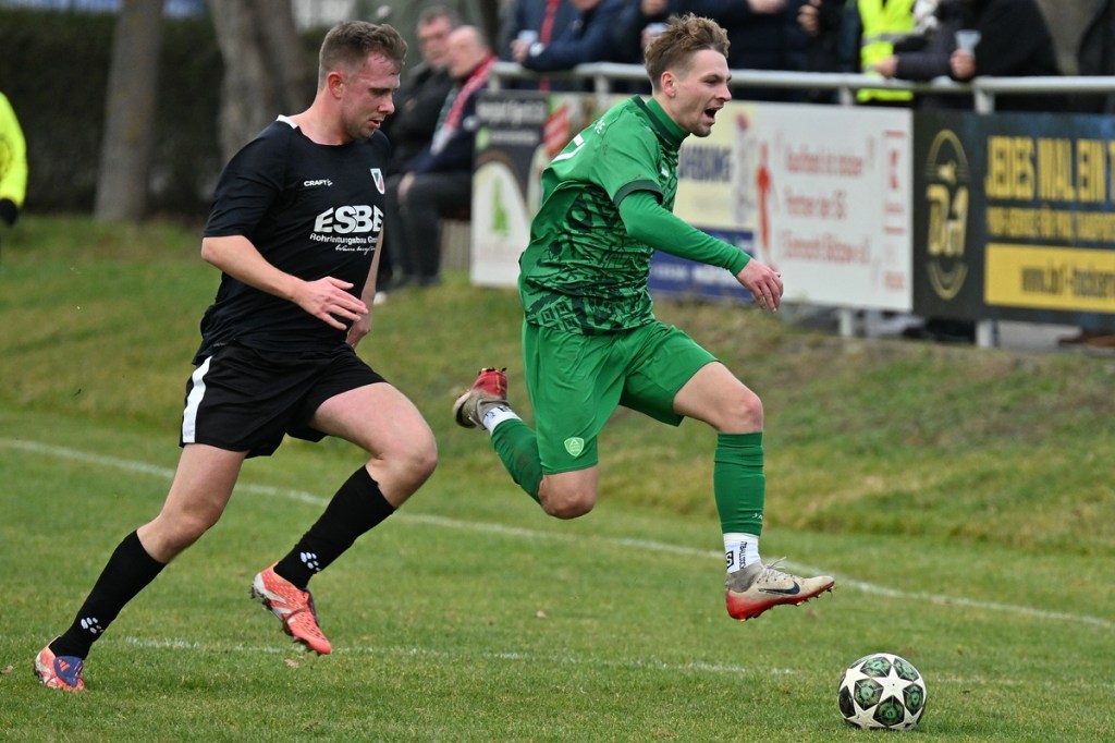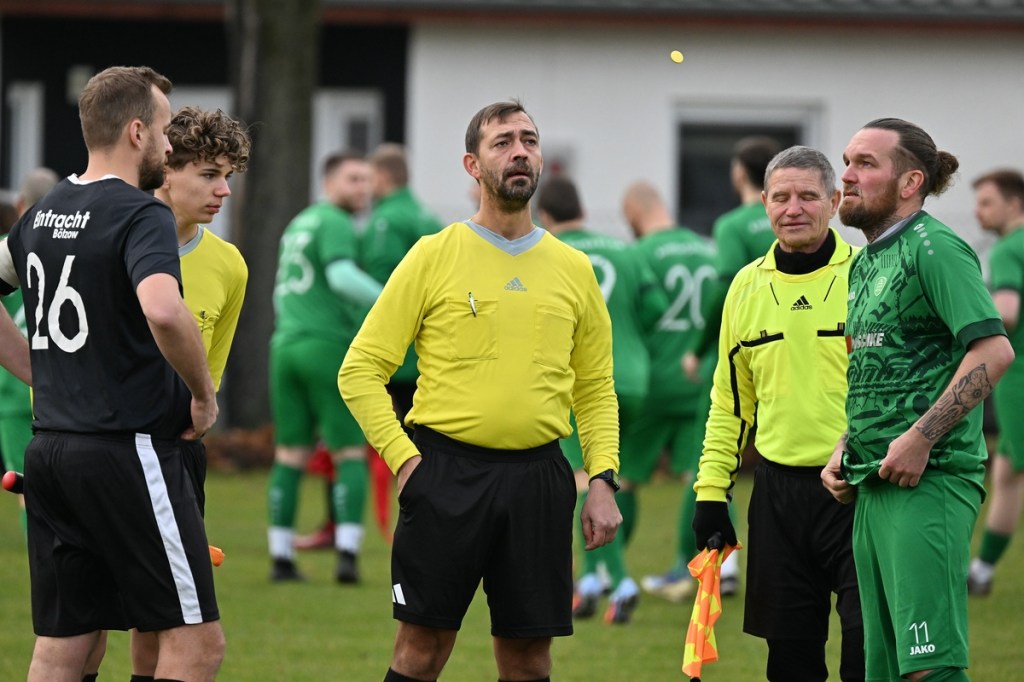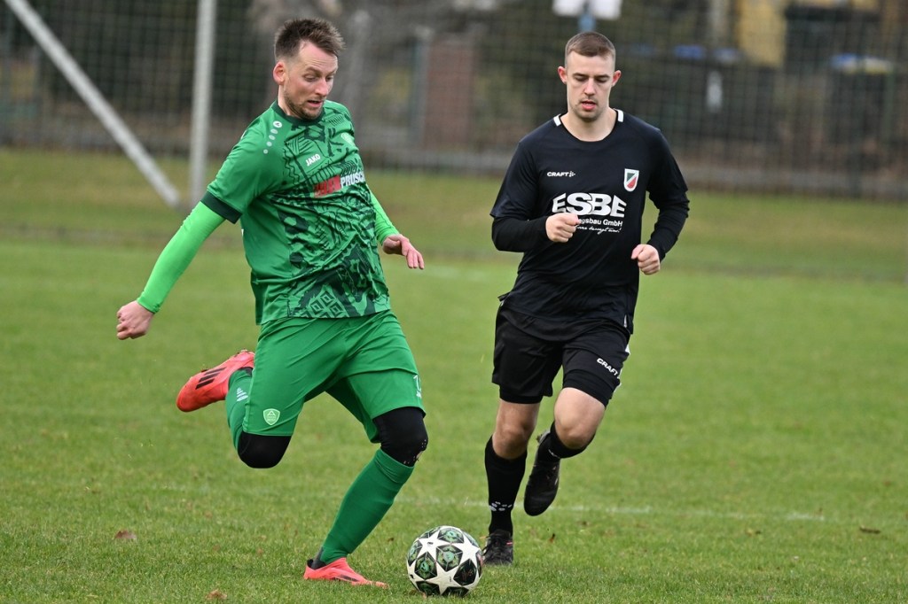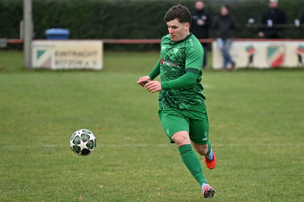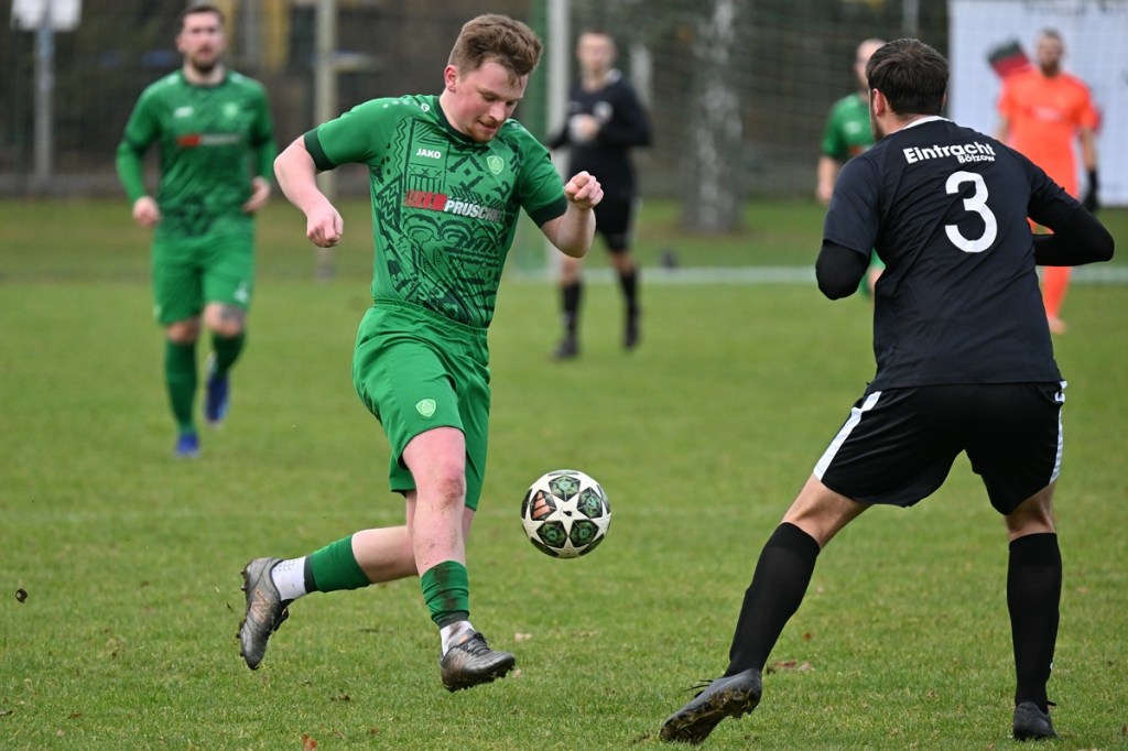 Denn Fiedlers Glaube konnte relativ früh gefüttert werden. Seine Jungs führten nach dreizehn Minuten nicht unverdient mit 0:1, was dem engagierten Auftritt erst einmal auch entsprach. Tobis Schulz war nach einem Eckball zur Stelle, als Eintracht den Ball schlampig herausspielte, er erneut flankte und Glück hatte, dass die Kugel an Freund und Feind vorbei im Tor einschlug. Bis zu diesem Zeitpunkt hatten beide Vertretungen jeweils einmal ein Rauchzeichen gesetzt und Ahrensfelde den griffigeren Eindruck hinterlassen. Doch die Gästefreude war noch gar nicht verklungen, da lag das Spielgerät im eigenen Netz. Torschütze war Robin Schneider, dem sein Abwehrversuch misslang und die Hausherren jubeln ließ, als er per Eigentor den Ausgleich erzielte (14.). Die Begegnung kippte nun ein wenig, weil Bötzow die eigene Rückhaltung etwas ablegte und mehr in die Offensive investierte. Schnörkellos ging es jetzt über die Außen und auch zum Torerfolg. Zwei Stationen und lapidare Gäste-Abwehrarbeit im Mittelfeld reichten, um Sebastian Senning in Schussposition zu bringen, der vom linken Strafraumeck abzog und auch traf (19.). Die Führung war jetzt nicht unverdient. Bötzow kontrollierte die Partie, agierte geduldig und zeigte sich sehr effizient. „Karo einfach“ blieb das probate Mittel der Hausherren, was in der nächsten sich bietenden Möglichkeit wieder zum Erfolg führte. Diesmal war es Lennert Schwach, der als Torschütze davon profitierte, wie lehrbuchartig, konsequent und einfach Angriffe an der Seitenlinie entlang aufgezogen und mit flacher Eingabe ins Ziel gebracht werden können (31.). Grün-Weiss hatte daran zu knabbern und offenbarte gerade in der Defensivleistung in allen Belangen große Mängel. Dass sich diese Negativzeichen auch in Standards, wie bei Eckbällen, zeigten, quittierten die Hausherren knallhart mit dem 4:1. David Stein staubte ab und schob damit die Partie für die Gäste schon Richtung Debakel. Eintracht ließ einfach nicht locker. Wieder wurde ein Angriff über die linke Seite eröffnet. Und zum wiederholten Male wurde Lennert Schwach zum Nutznießer der genannten Pragmatik, als er die Barnimer mit dem 5:1 in die Halbzeitpause schickte (45.+2).
