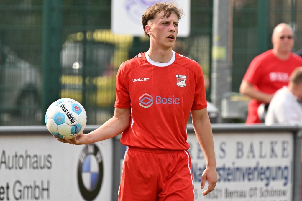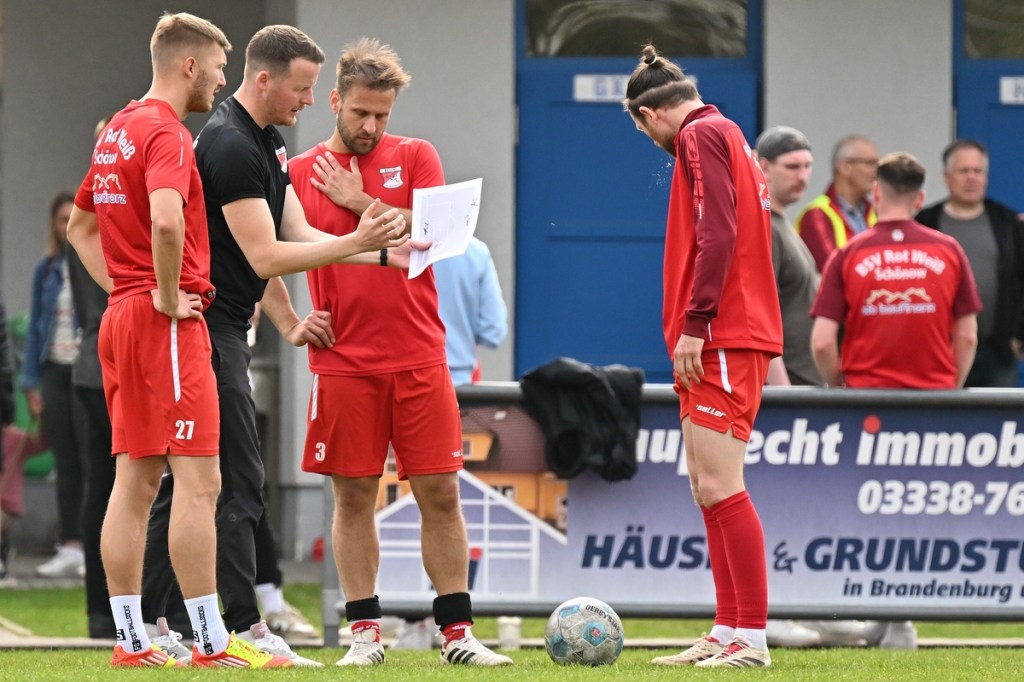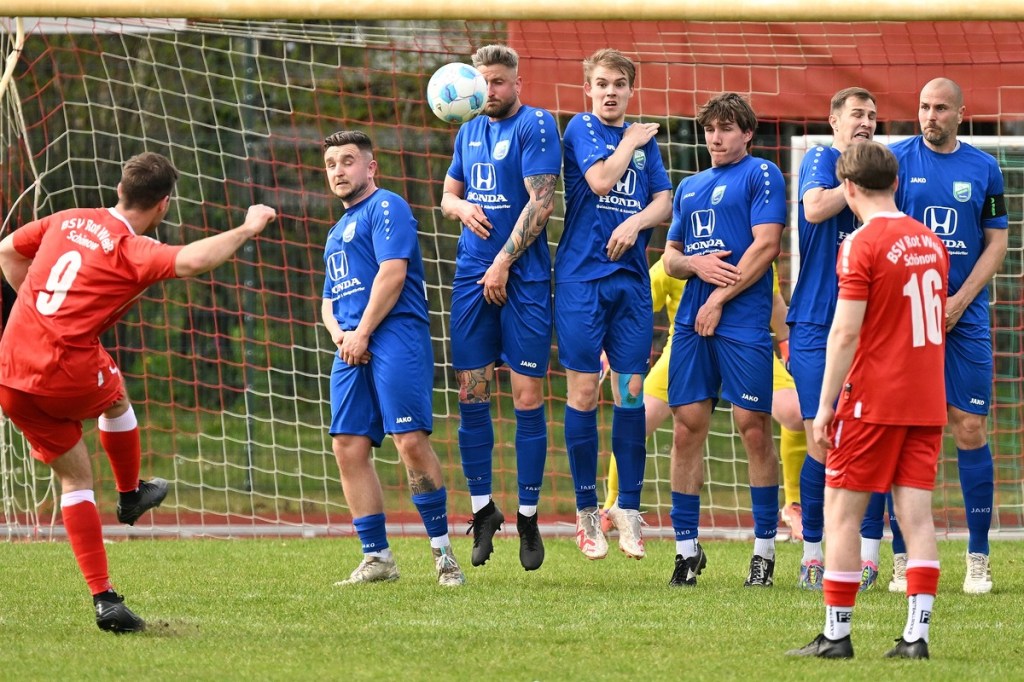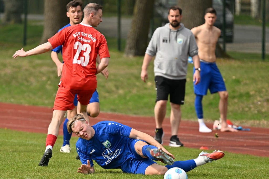 Dabei begann die Partie recht verhalten und musste schon nach einer Minute in eine längere Unterbrechung gehen, weil man mit dem Ballmaterial unzufrieden war und sich schlussendlich nicht entscheiden konnte, welcher Härtegrad nun der richtige sein sollte. Die Anfangsphase wurde von schwerer Kost begleitet. Keines der Teams fand den Weg in die Partie, vieles blieb noch Stückwerk. Unter der Dauerbeschallung einer Motorkettensäge aus der Nachbarschaft kam Wandlitz zur ersten Möglichkeit, welche schlussendlich auch in einem Torerfolg mündete. Schonöw schaffte es nicht den öffnenden Pass Richtung rechter Seite zu unterbinden. Manuel Thomas war der Adressat, der nicht lange fackelte, abzog und links unten traf. RW-Keeper Enrico Müller hatte zwar noch die Finger dran, den Einschlag konnte er aber nicht verhindern (13.). Die Gäste blieben erst einmal am Drücker. Doch ein Nachlegen, wie beim Schuss von Nico Rücker, verhinderte die vielbeinige Heimabwehr (15.). Wer nun auf ein Aufbäumen der Hausherren hoffte, sah sich in der Folge getäuscht. Schönow tat sich weiterhin schwer, ließ Grundtugenden, wie Einsatzfreude, Galligkeit und der Anzeige eines Planes vermissen. Die erste Möglichkeit der Rot-Weißen resultierte aus einem Freistoß. Diesen brachte Hannes Krüger direkt auf den Kasten, doch Florian Schweitzer, der Eintracht-Torsteher, zeigte sich konzentriert und meisterte diese Aufgabe sehenswert (24.). Spielerisch lief in den Reihen der Hausherren nur wenig zusammen. Für Wandlitz ein positiver Umstand, der das Team mit solider Abwehrarbeit noch mehr zusammenschweißte und dem Auftritt das benötigte Selbstvertrauen einimpfte. Rot-Weiß fand weiterhin keinen richtigen Zugang zum Spiel. Dustin Warmbrunn versuchte verbal als steuerndes Element im Mittelfeld die Fäden zu ziehen. Seine hinweisenden Worte wurden aber überhört, denn im Vorwärtsgang agierte die Truppe viel zu durchsichtig und statisch. Richtig ernst machte Schönow in der 33. Minute. Hannes Krüger wurde diagonal angespielt, nahm an der rechten Strafraumgrenze genau maß und nagelte das Spielgerät an den rechten Pfosten. Die Nachschussmöglichkeit war gegeben, verpuffte aber in den Wandlitzer Körperteilen, die sich dem Abschluss entgegenwarfen. In dieser Phase kam Schönow etwas besser in die Partie. Doch Wandlitz blieb weiterhin die gefährlichere Truppe. Der Doppelchance in der 37. Minute durch Roman Schmidt und Paul Roller, folgte das 0:2. Ein langer Ball auf Schmidt, der dann Nico Brauer im Zweikampf düpierte, präsentierte die Torjäger-Qualitäten des Eintracht-Goalgetters. Ohne Schnörkel ließ er beim Schuss RW-Torhüter Müller nicht die Spur einer Abwehrchance (39.). Schönow schien angeschlagen, brachte offensiv kaum noch etwas auf den Rasen. „Wie ideenlos“, posaunte Müller seine Kollegen an und hatte damit den Nagel hundertprozentig auf Kopf getroffen.
